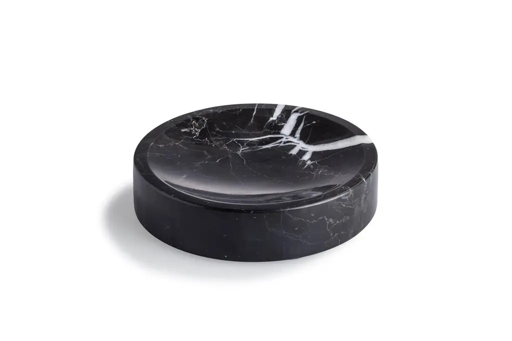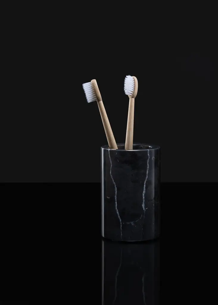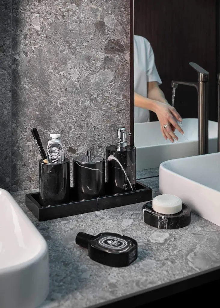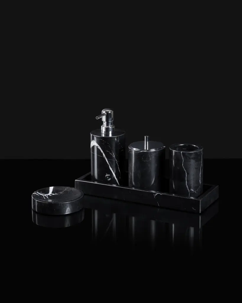 Crafted from elegant Black Marquina marble, this deluxe bathroom set is designed to enhance both the beauty and functionality of your bathroom, spa, or hotel.The set includes a rectangular tray, soap dispenser, soap dish, toothbrush holder, and cotton swab can. All five pieces are crafted from polished Black Marquina marble, adding an elegant touch to the decor of your contemporary or classic-style bathroom.Due to the unique veining of the marble, each item in the set is truly one-of-a-kind. Please note that these items are not dishwasher safe and should be cleaned with water and a delicate, natural soap.