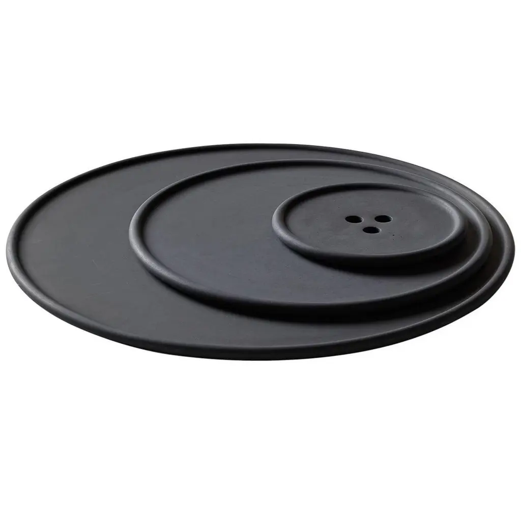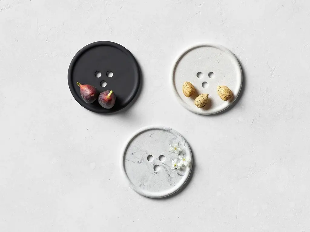 Cast in one pour, this dish is formed like a button to showcase your everyday favorites. Hand-mixed with different minerals and natural pigments, the Bouton carries subtle textures on its surface. As the concrete settles uniquely for each pour, no two are the same.Perfect in combination with your favorite objects, the Bouton series serves as a set of trays to collect trios of items. Use as coasters or plates for serving.Set of six small boutons~Black~Cast concrete / gypsum cement / mica and natural pigments~ 5" roundBouton comes in black, speckled grey and marble.