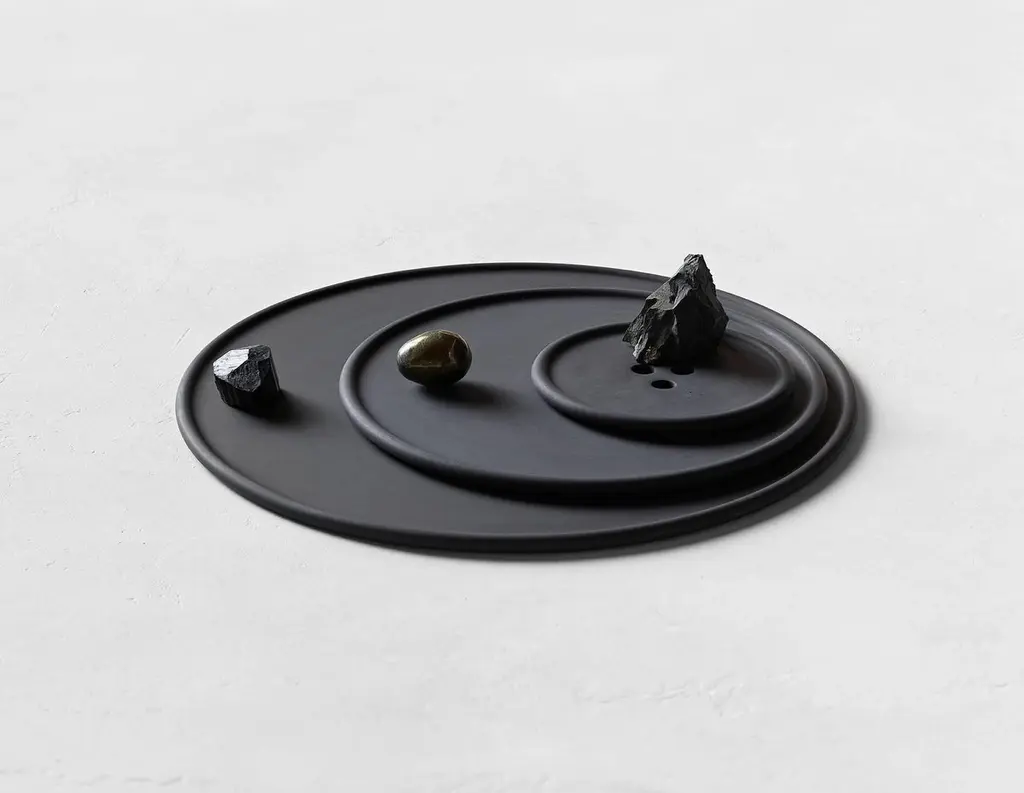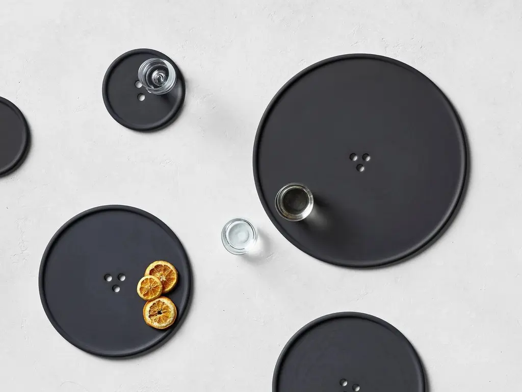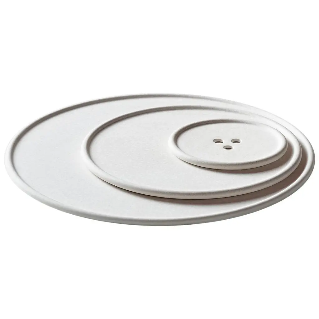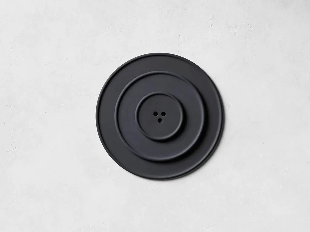 Cast in one pour, this dish is formed like a button to showcase your everyday favourites. Hand-mixed with different minerals and natural pigments, the Bouton carries subtle textures on its surface. As the concrete settles uniquely for each pour, no two are the same.Perfect in combination with your favourite objects, the Bouton series serves as a set of trays to collect trios of items. Use as coasters or plates for serving.Set of three boutons~Black~Cast concrete / Gypsum cement / Mica and natural pigments ~Measures: 5", 10", 15" diameter Bouton comes in black, speckled grey and marble.