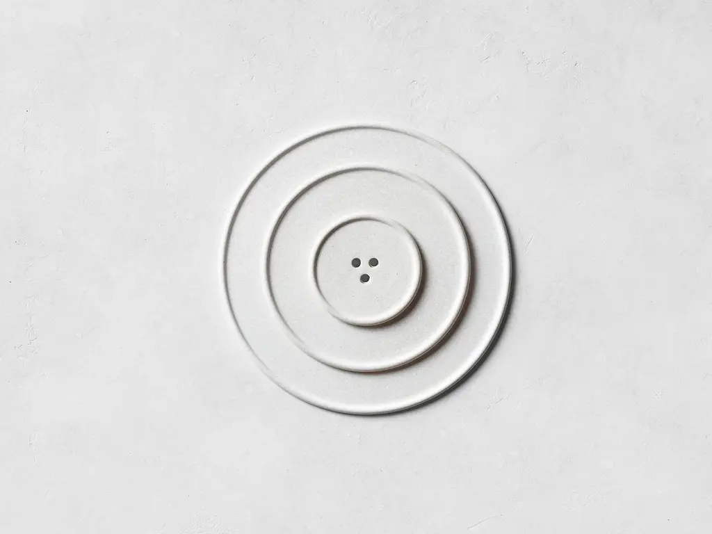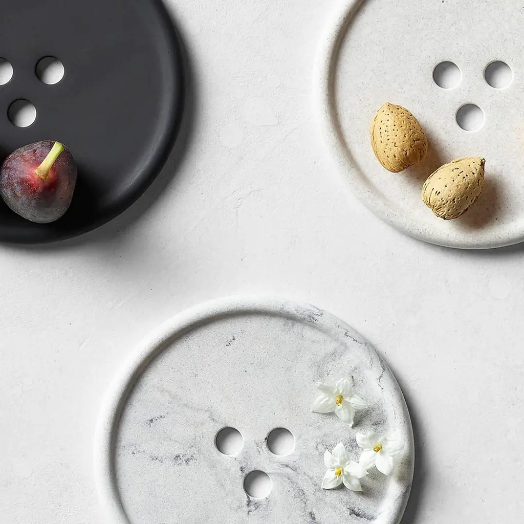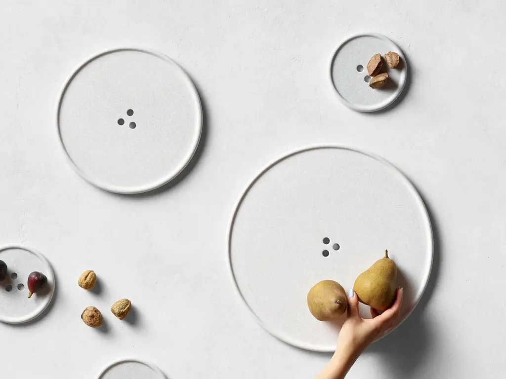 Cast in one pour, this dish is formed like a button to showcase your everyday favorites. Hand-mixed with different minerals and natural pigments, the Bouton carries subtle textures on its surface. As the concrete settles uniquely for each pour, no two are the same.Perfect in combination with your favorite objects, the Bouton series serves as a set of trays to collect trios of items. Use as coasters or plates for serving.Set of three boutons~Speckled grey~Cast concrete / gypsum cement / mica and natural pigments ~ Measure: 5", 10", 15" diameter Bouton comes in black, speckled grey and marble.