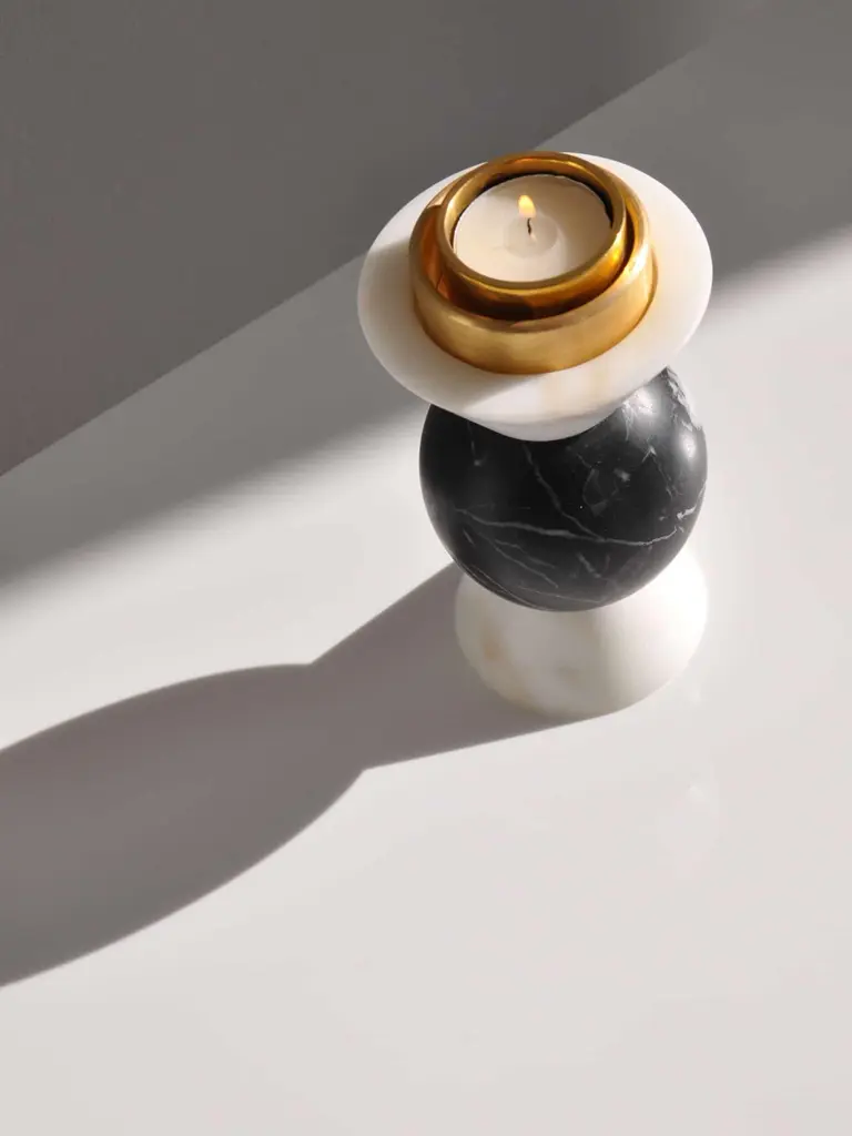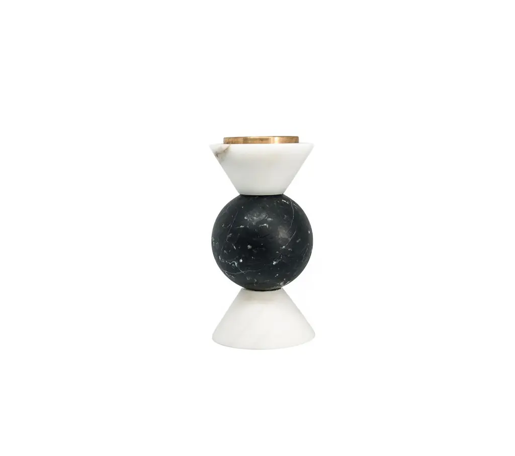 Short rounded two-tone candleholder in white Carrara marble, black Marquina marble and brass.-Jacopo Simonetti Design for FiammettaV-Each piece is in a way unique (every marble block is different in veins and shades) and handmade by Italian artisans specialized over generations in processing marble. Slight variations in shape, color and size are to be considered a guarantee of an handmade creation. Important: Do not use lemon or vinegar on it, clean only with water and natural soap (like Marseilles soap), do not put in dishwasher. This object gives a distinct touch to your house and can be an elegant gift or used as a wedding decoration.