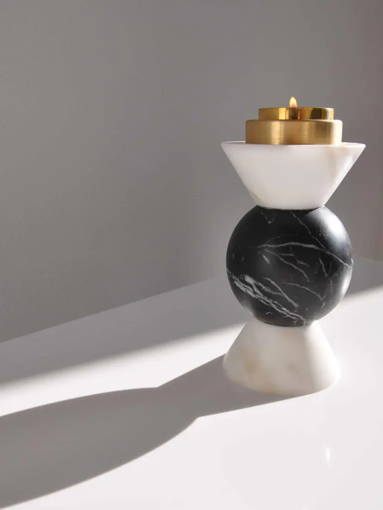 Handmade Short Rounded Two-Tone Candleholder In Carrara And Marquina Marble