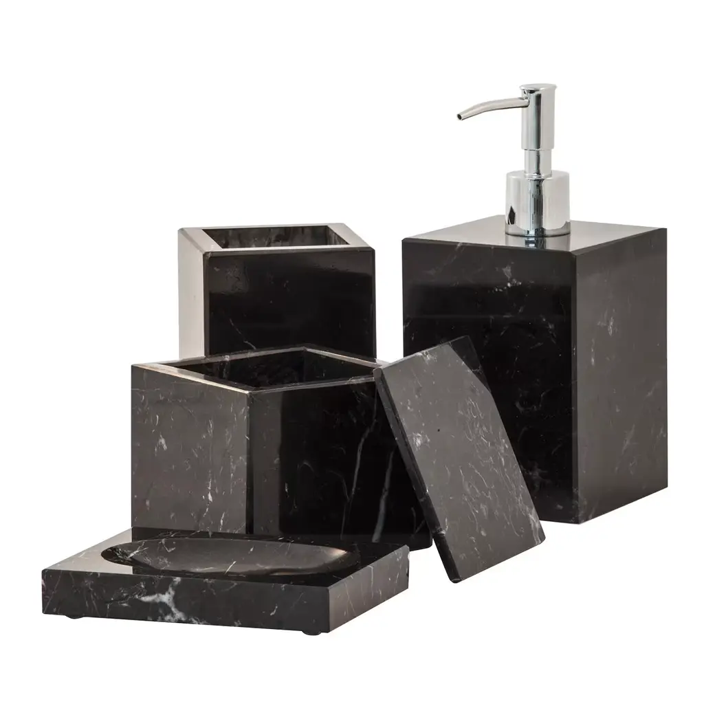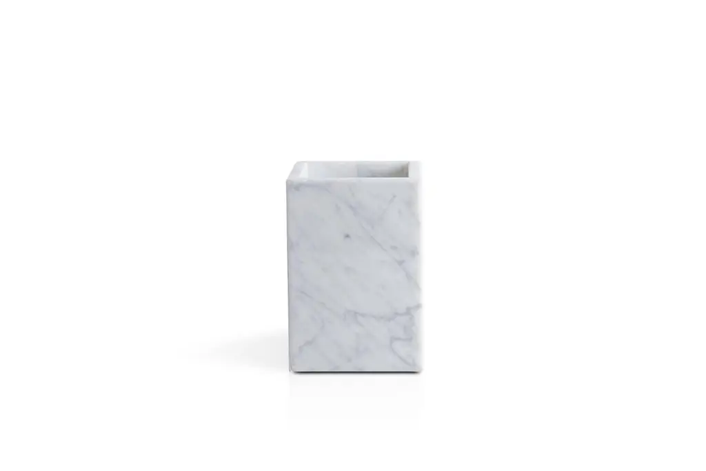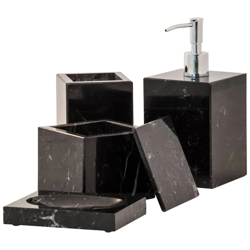 A squared set for the bathroom in white Carrara marble which includes: One soap dispenser (9 x 9 x 19 cm), one soap dish (10 x 13 x 2 cm), one toothbrush holder (8.5 x 8.5 x 12 cm), one box holder with lid (9.5 x 9.5 x 9.5 cm).Each piece is in a way unique (since each marble block is different in veins and shades) and handcrafted in Italy. Slight variations in shape, color and size are to be considered a guarantee of an handcrafted creation. These objects give a distinct and elegant touch to your bathroom.
