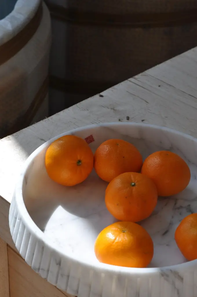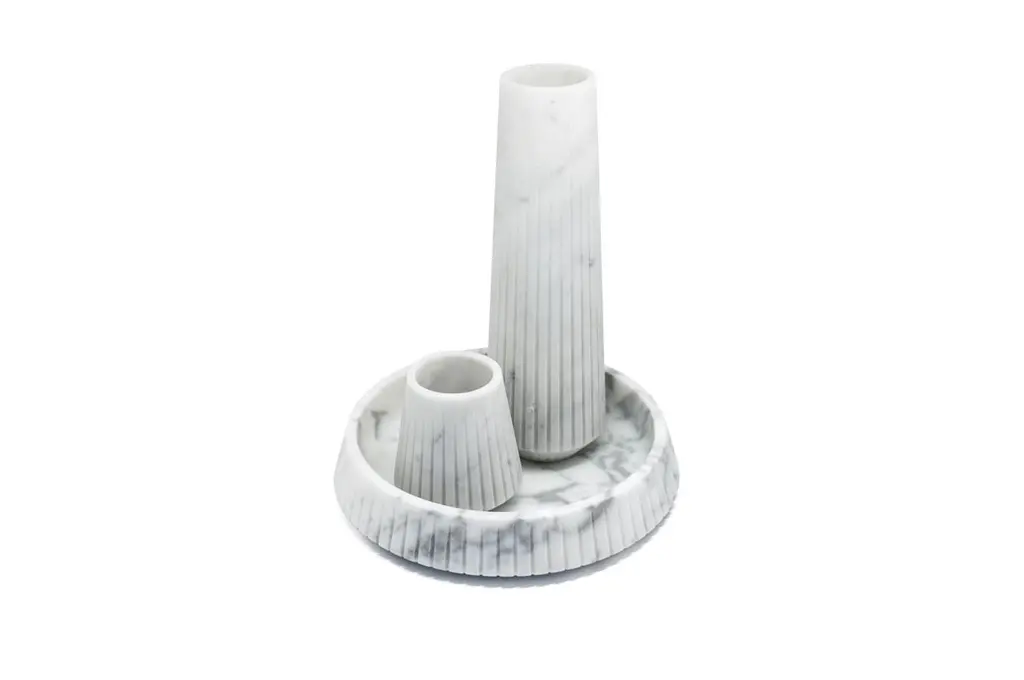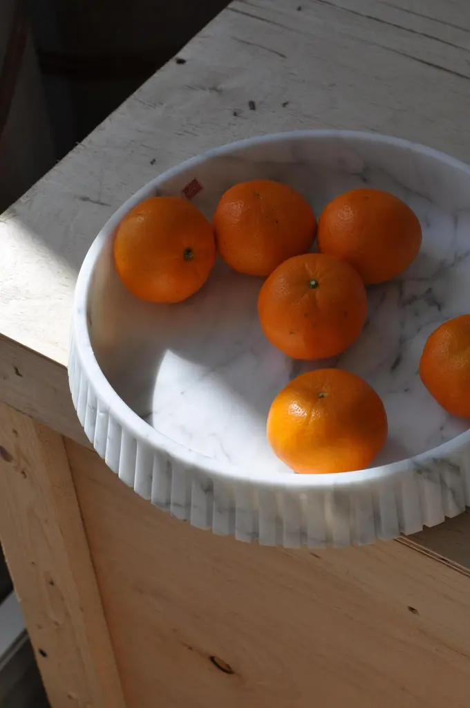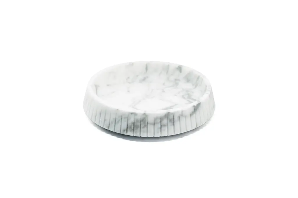 Striped centrepiece in white Carrara marble.- Jacopo Simonetti design for FiammettaV-Each piece is in a way unique (every marble block is different in veins and shades) and handmade by Italian artisans specialized over generations in processing marble. Slight variations in shape, color and size are to be considered a guarantee of an handmade creation. Important: Do not use lemon or vinegar on it, clean only with water and natural soap (like Marseilles soap), do not put in dishwasher. This object gives a distinct touch to your house and can be used in the kitchen and on the table; you can surprise the guests by telling its story.