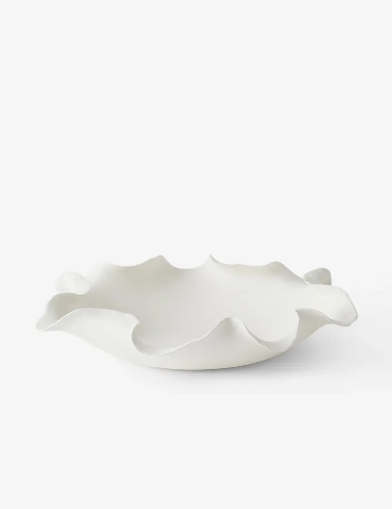 Hand-applied ruffles lend an airy elegance to this matte white ceramic piece. The shallow, flowing shape makes this low bowl perfect for styling as a catchall or decorative accent.