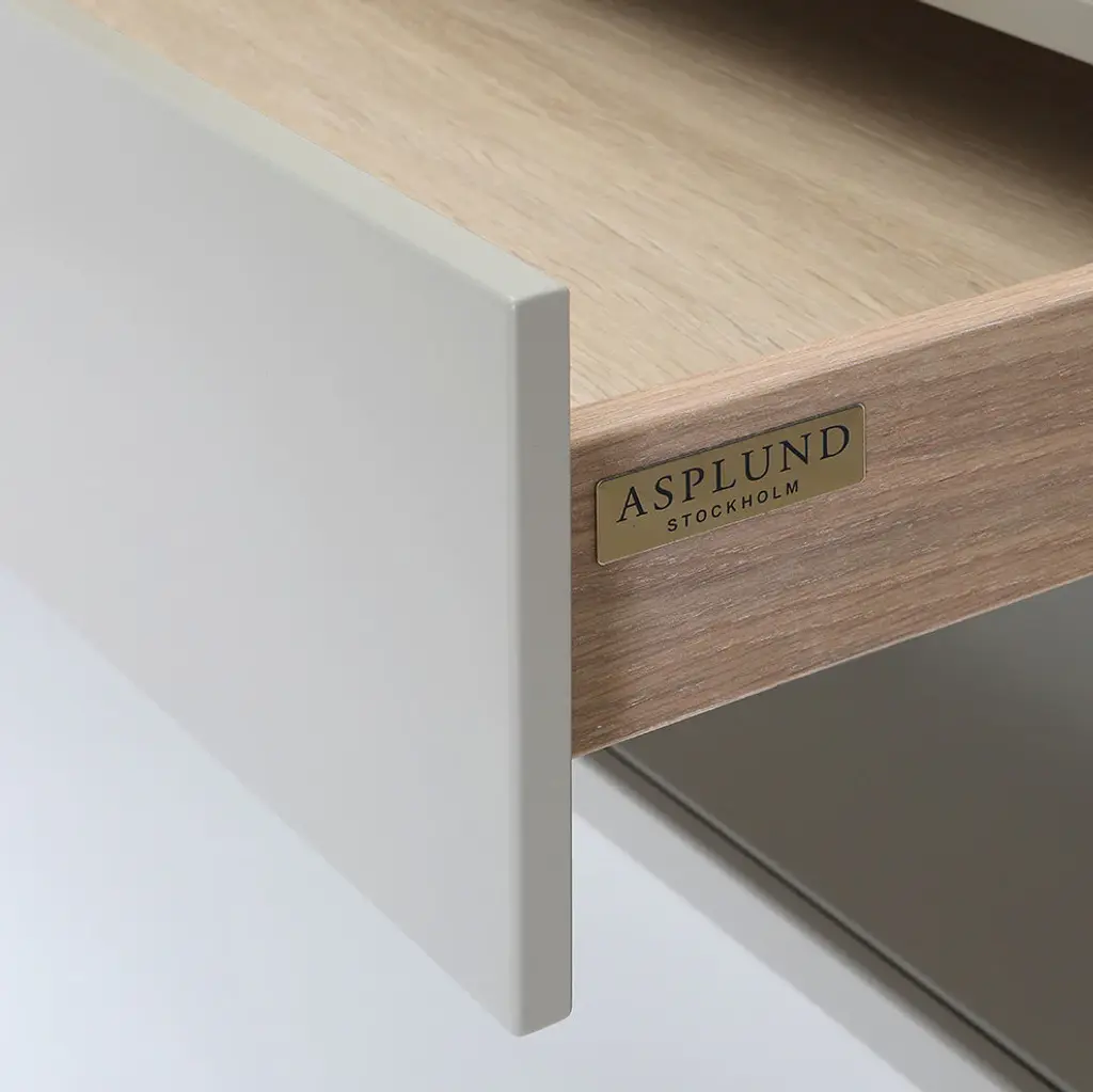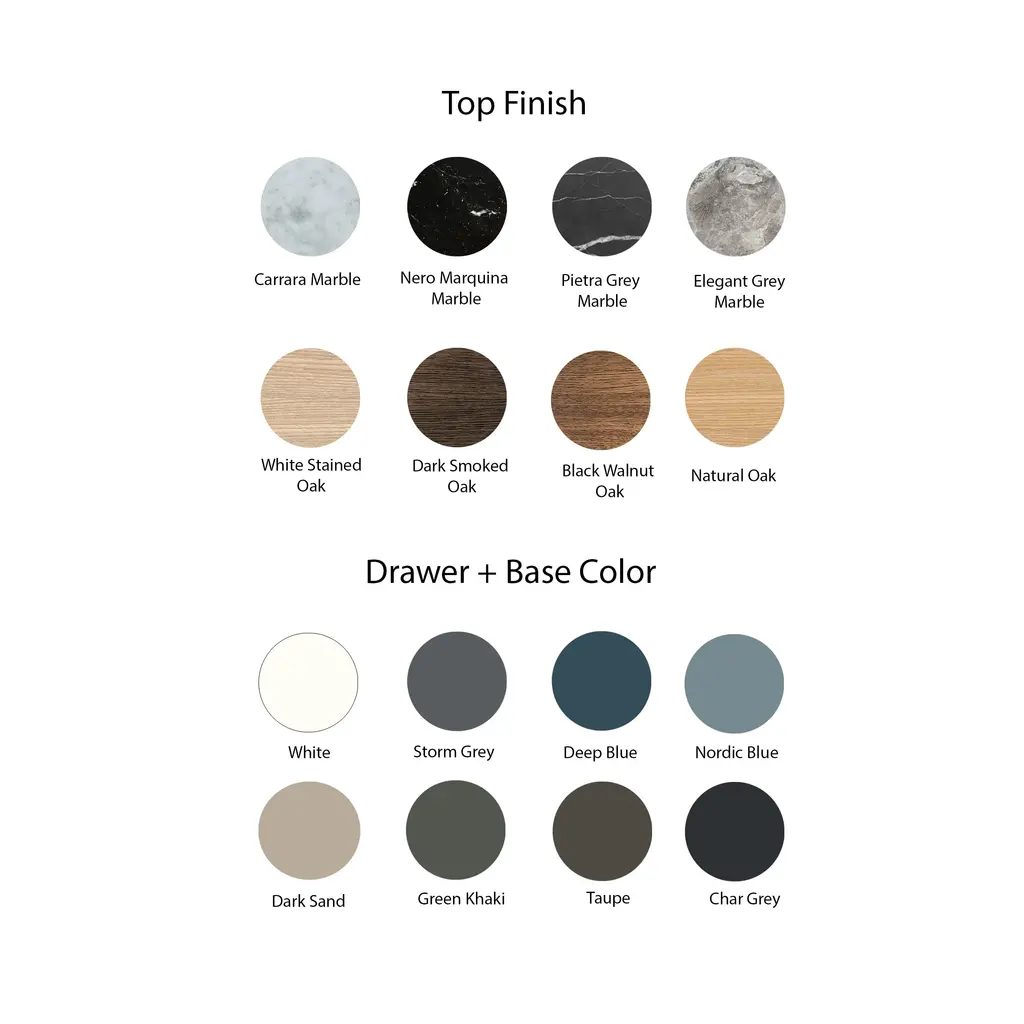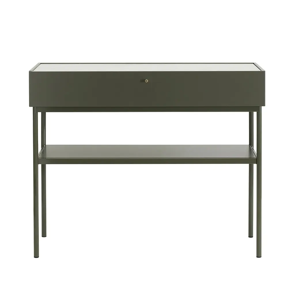With a more compact version of their signature console, Swedish designers Mats Broberg and Johan Ridderstråle offer the sleek Luc 100. Featuring a single drawer with a brass knob and a shelf underneath, the monochrome unit has a powder-coated metal base in the same hue. Impeccable options for the contrasting top surface include solid stone with marble and Belgian limestone selections as well as a stained oak in a variety of finishes.