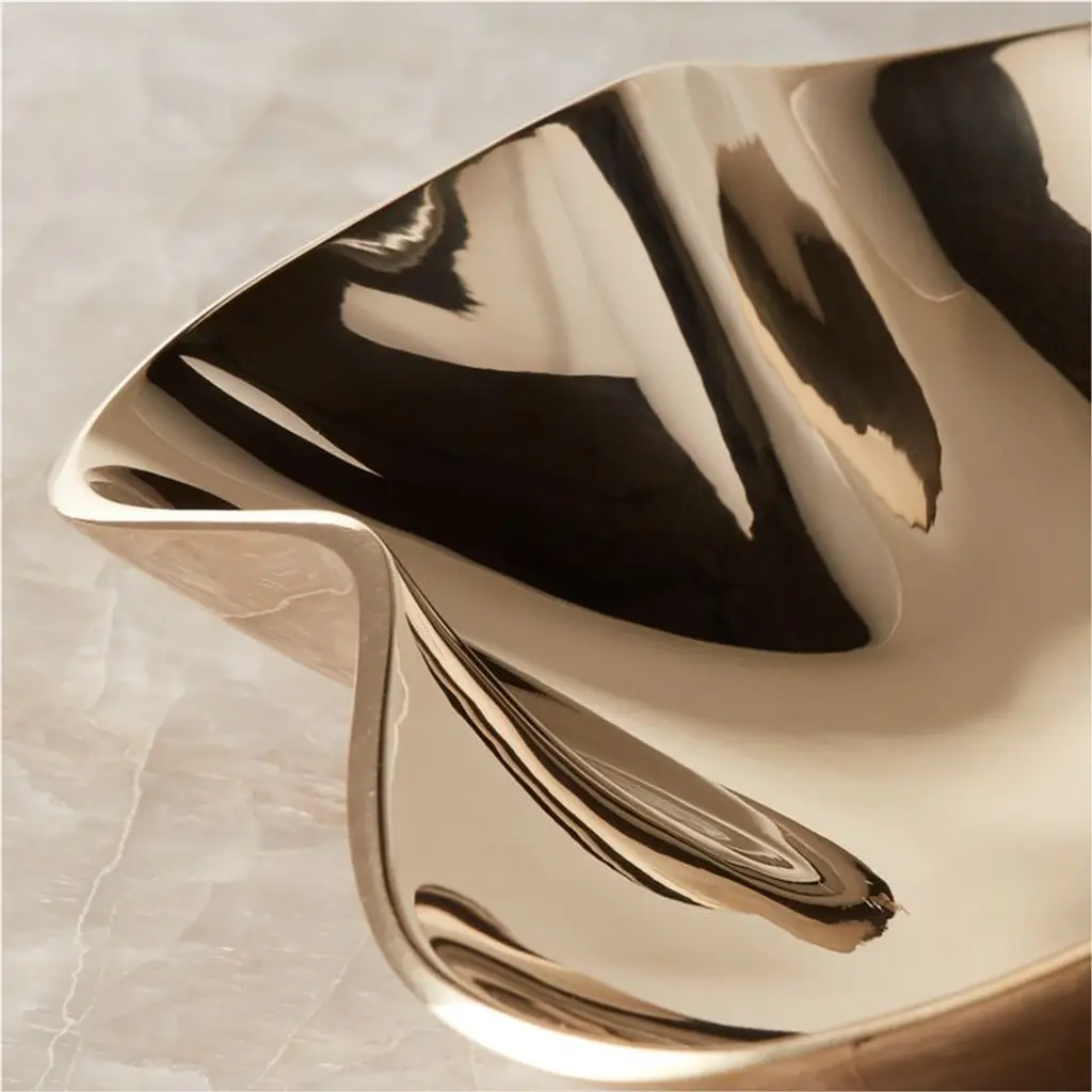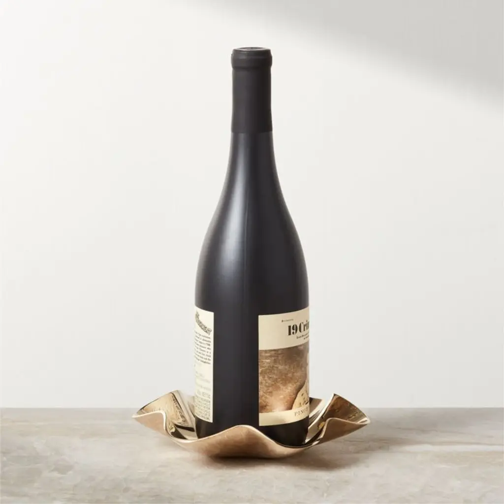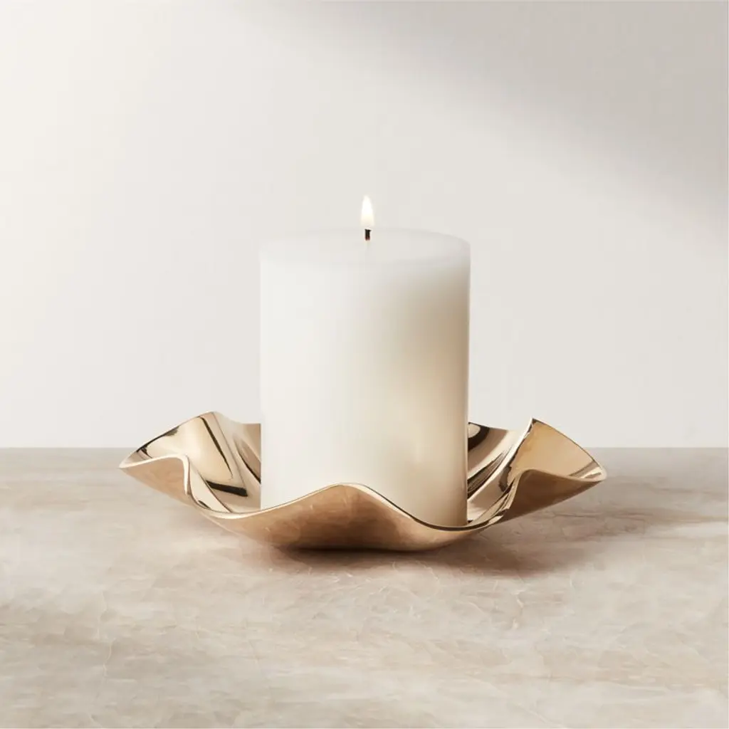 Designed to be multifunctional, polished brass catchall holds everything from pillar candles to wine bottles. The shallow vessel features a scalloped edge for sculptural detail. Brass is unlacquered, offering a living finish that will develop the patina of a vintage find. CB2 exclusive.Due to the nature of the material, brass patina will vary in color and darken over time.