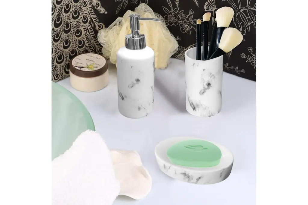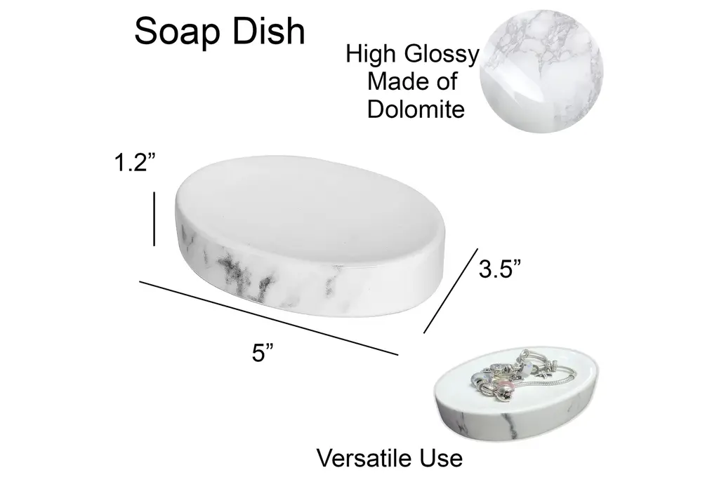 "MARBLE DESIGN: Enjoy the modern and stylish design of this Marble bath countertop soap dish cup, outlined with grey marble effect which brings a relaxing atmosphere to your bathroomHIGH-QUALITY: This bath countertop soap dish is made of dolomite which is rust free, the cup is curved to avoid any slippage of the bar soap. This oval shape soap bar holder fits perfectly on any vanity counter topPERFECT SIZE: 5""L x 3.5""W x 1.2""H. Larger than a bar of soap, it holds any regular soaps. Easy use for kids and adults. Ideal for your bath counter, kitchen sink, or utility room vanitySAVE ON SOAP : The curved shape keeps the soap in place and avoids the soap to melt too quickly. Easy to clean with soapy waterVERSATILE USE: our hand soap dispensers can be used in bathrooms, showers, tubs, kids' or guests' bathroom, kitchens, as dish sponge holders, jewelry containers and more""How to keep your bar soap perfectly in place? Our Marble soap dish cup dispenser is the right soap holder. It will let your bath counter or sink neat and tidy.Usually made of durable plastic, ceramic or bamboo soap holders fit on every vanity, sink, countertop or shelf. You can use also soap dispensers to hold items like jewelry, sponges and small accessories.Moreover, bar soap dishes are available in various shapes, colors and designs. So, this oval Marble soap dish cup dispenser will add both functional and aesthetic details to your bathroom.In addition, you can complete your decoration with other products of the same Marble collection. So add to your selection a matching tumbler, lotion soap dispenser or toilet brush just to name a few."""
