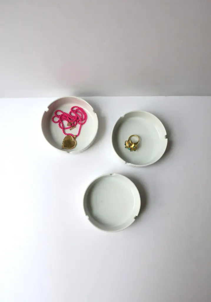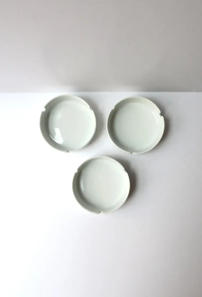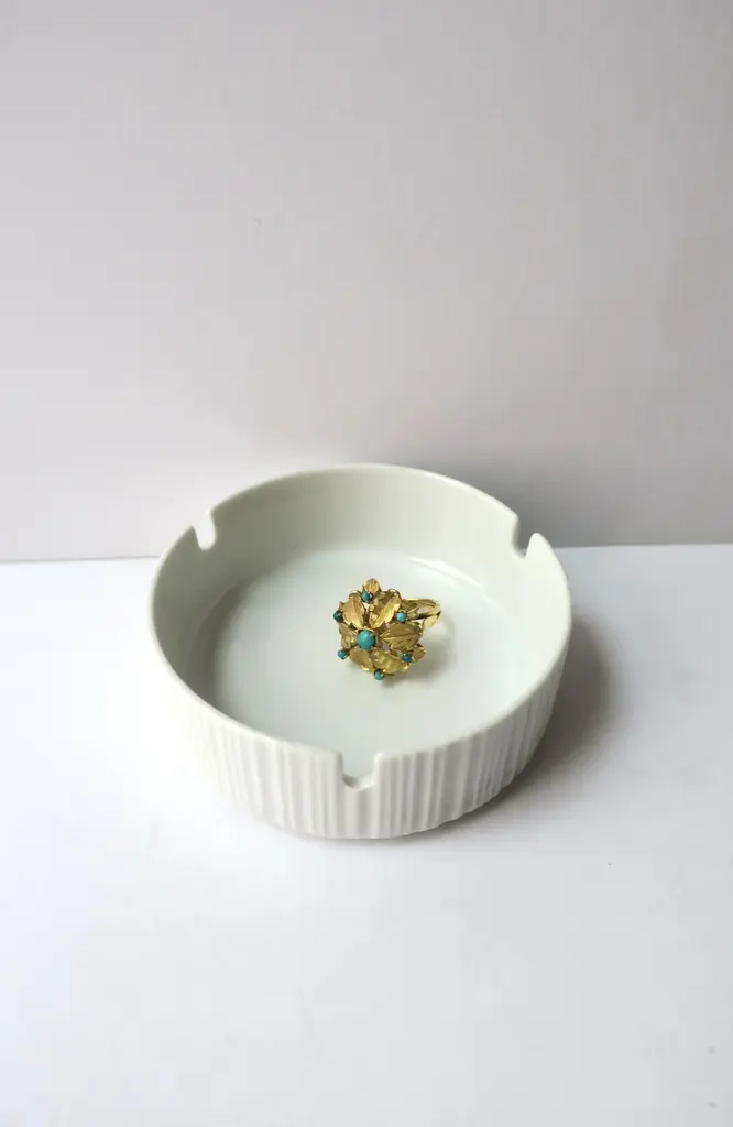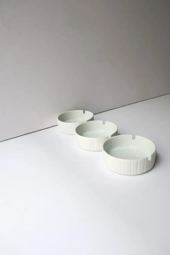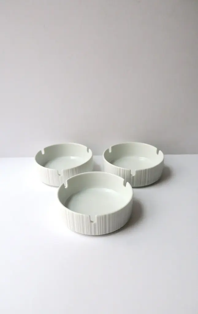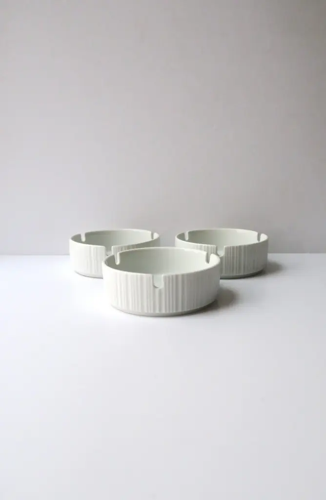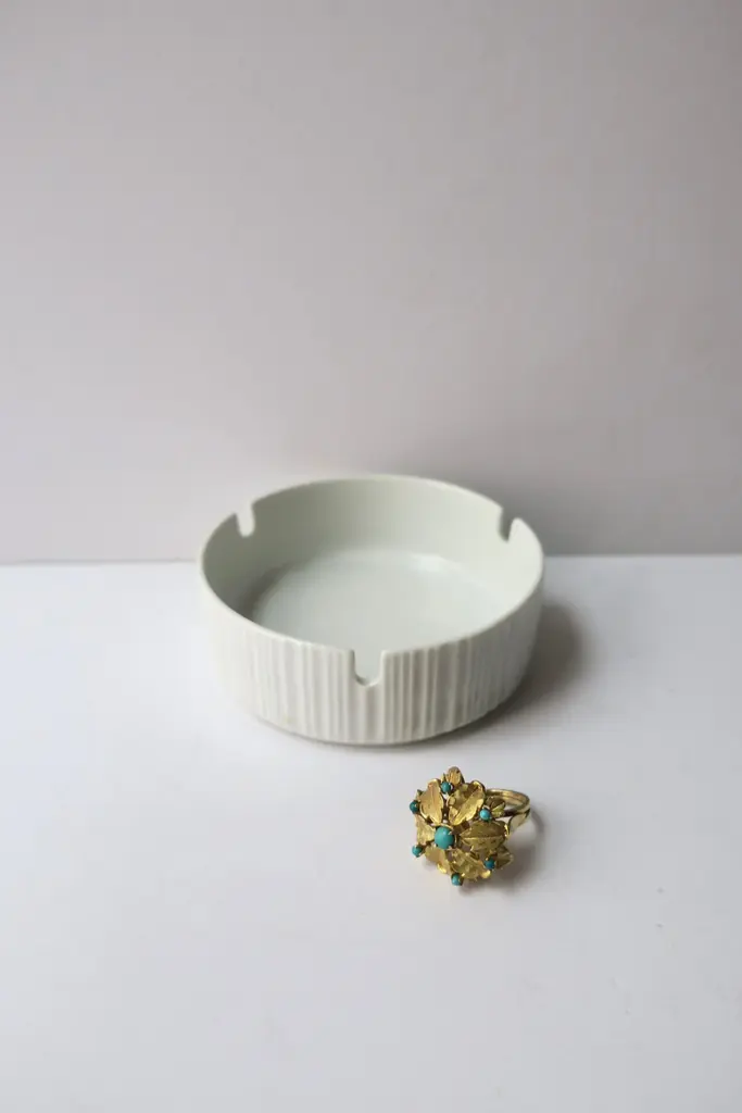 *Three (3) available, each sold separately, as per listing. German white porcelain ashtray (or catchall) in the 'variation' pattern, Midcentury Modern period, attributed to Finnish designer and sculptor, Tapio Wirkkala, for Rosenthal Studio-Line, Germany, circa mid-20th century. Exterior has a fluted design. Purchase for its intended use, an ashtray, or as a catchall for small items on a desk, to hold jewelry, etc. Very Good condition as shown in images. No chips noted. Never used. Dimension: 4" Diameter.