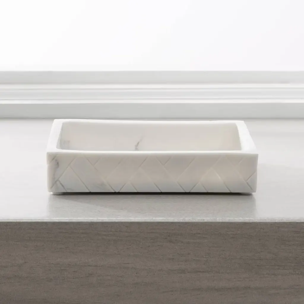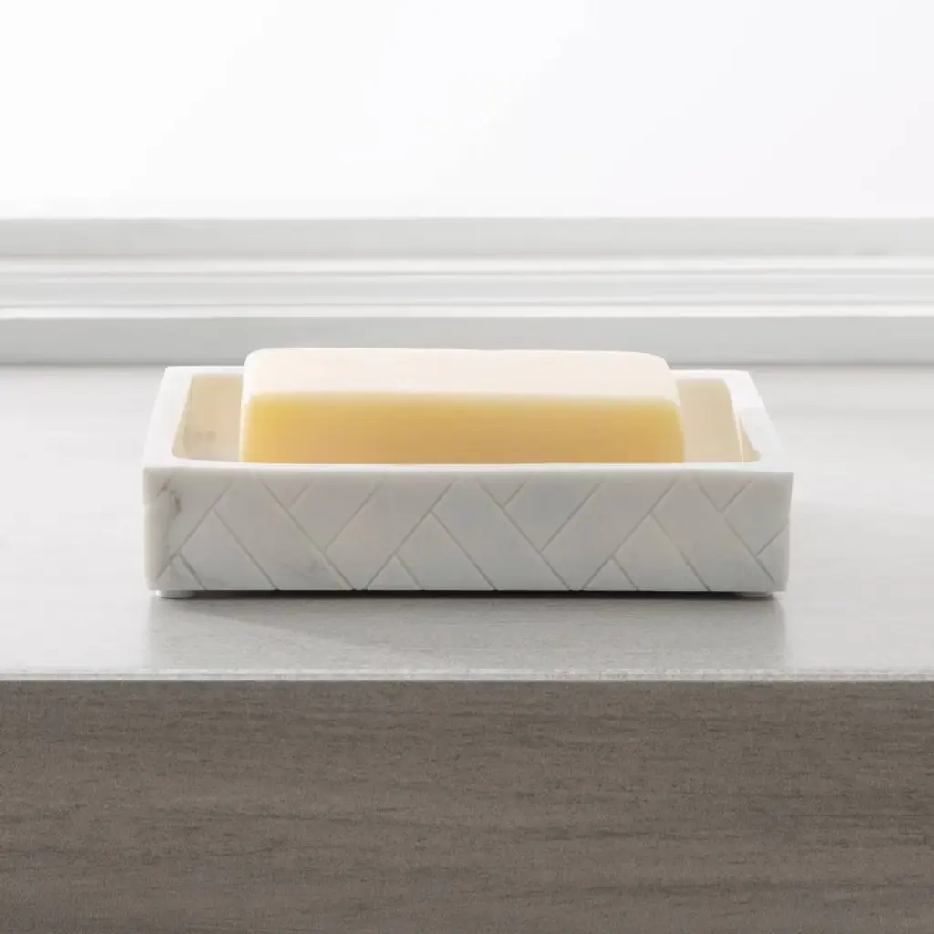 The Tripoli bath collection includes our resin soap dish with it's stunning herringbone pattern and marble faux-finish in classic white and grey. The intricate pattern is a work of art, adding sophistication to any bathroom. Crafted to withstand everyday use, this soap dish is both sturdy and durable. With a non-slip base, it stays firmly in place on your countertop.