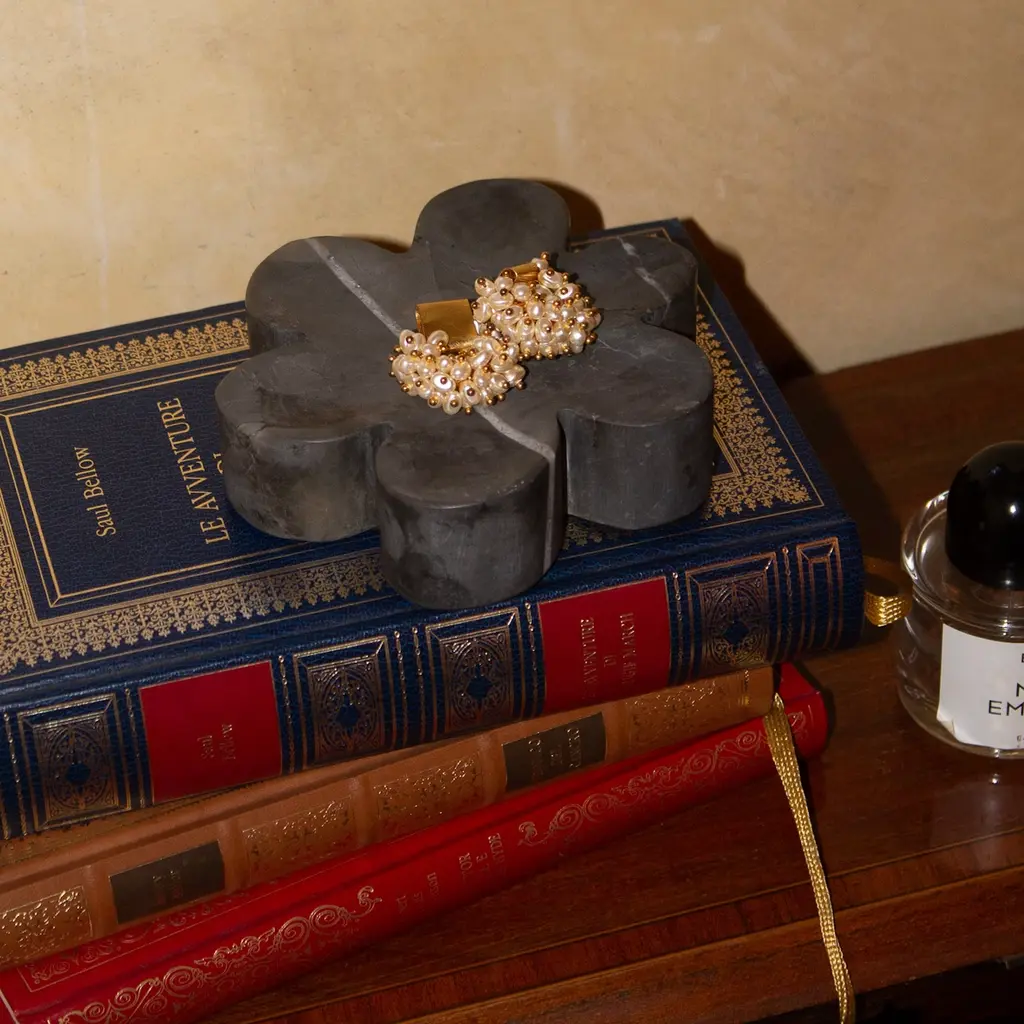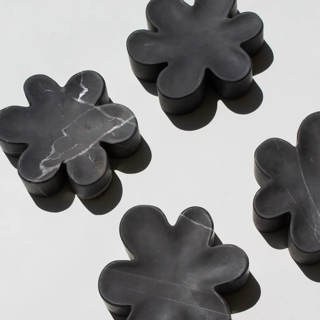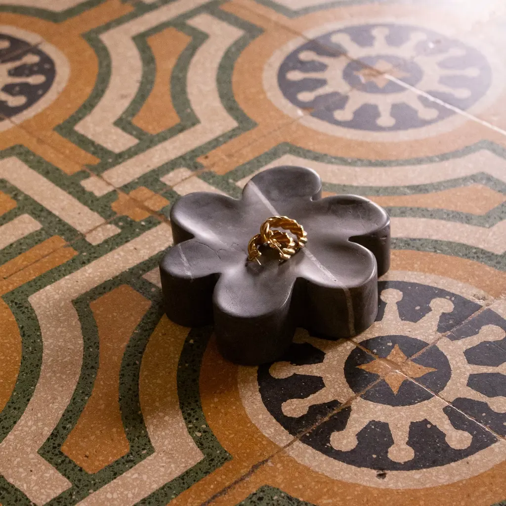We have teamed up with New York based jewelry brand NOTTE, to create a limited edition jewelry catchall. The Superbloom Marble Catchall, is made using Nero marble. Inspired and named after one of NOTTE's signature designs, the marble follows the same whimsical silhouette of the Superbloom pendant. The brands aim to introduce an intentional piece for your space that is both functional and ornamental while still embodying both brands’ ethos. The piece is fabricated by hand in a rough honed finish and is sustainably made by using off-cuts from past projects.