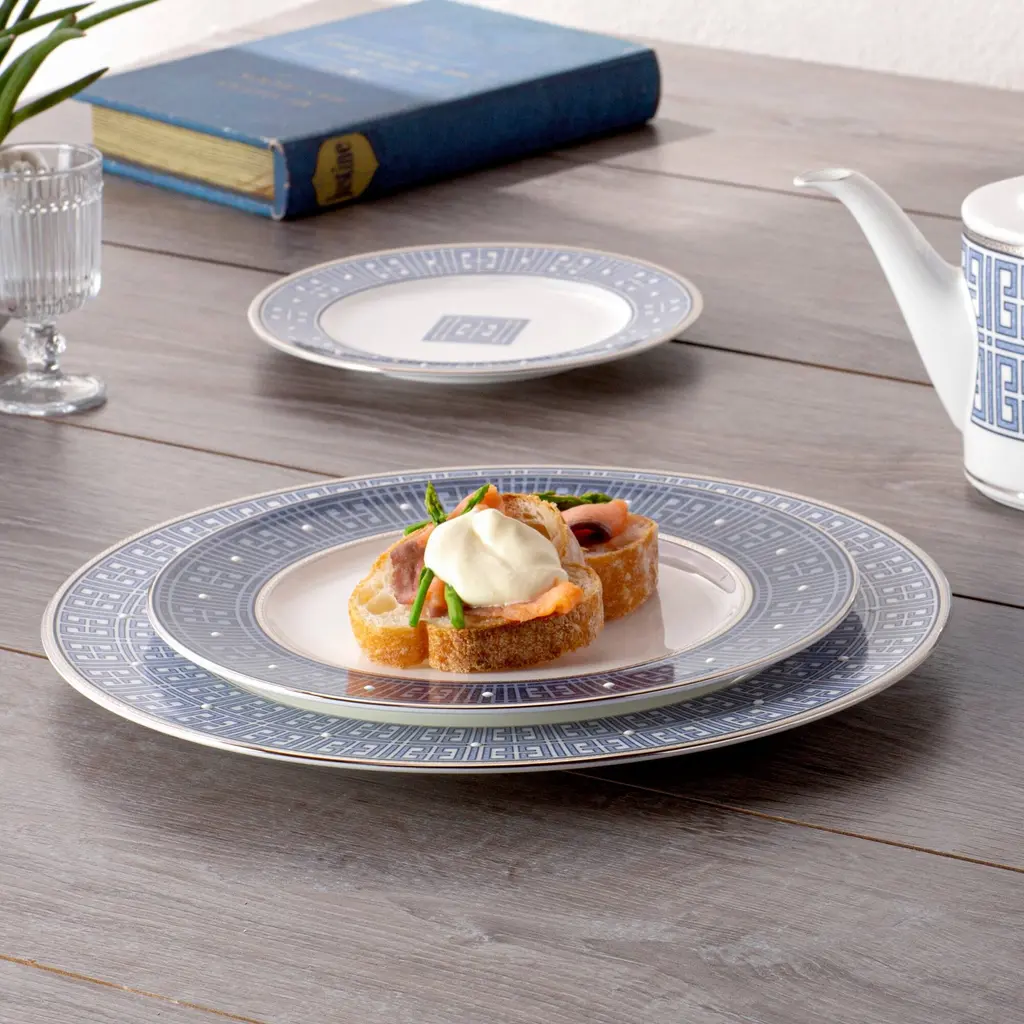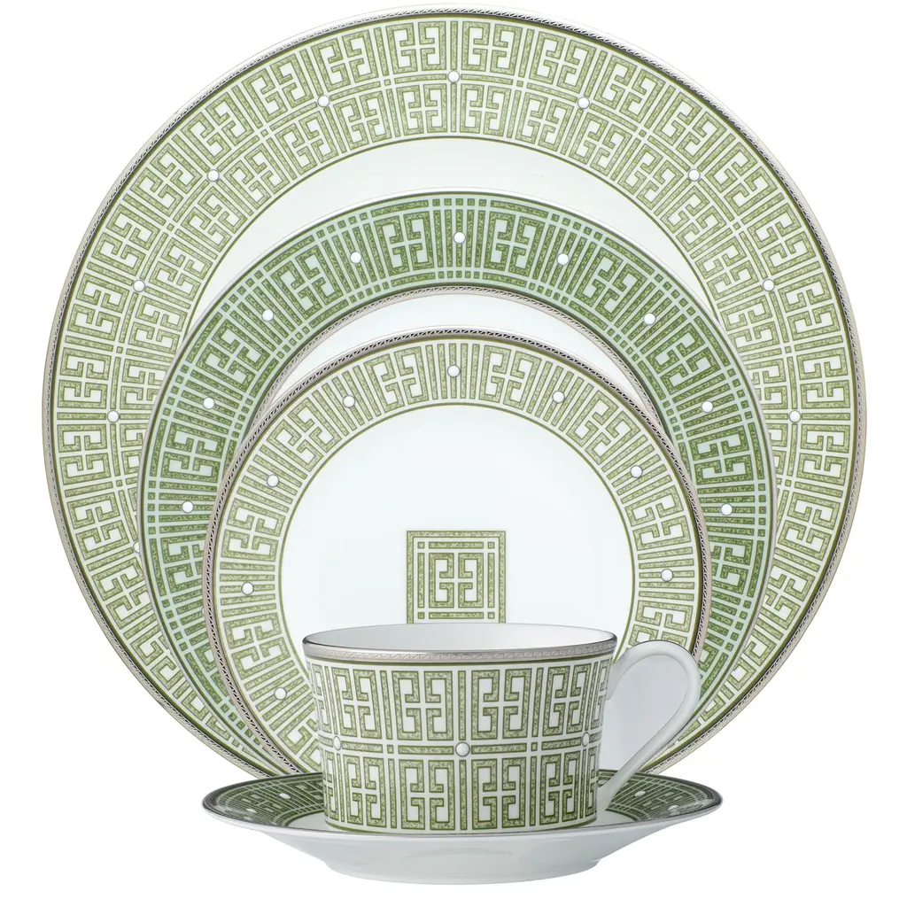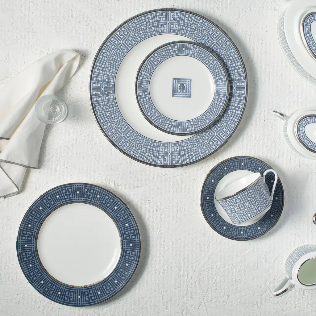 The Infinity Collection is a bold pattern on bone china. Each item is adorned with a fret pattern, interpreted as interlocking keys and blocks. Within each block is a marbled design. Additionally, Infinity items are embellished with raised enamel dots and 2 types of banding. One band is a solid presentation of hand-applied gold or platinum, while the other is an etched band of repeating right triangles. The Infinity Collection is dishwasher safe and intended for daily use.