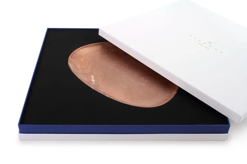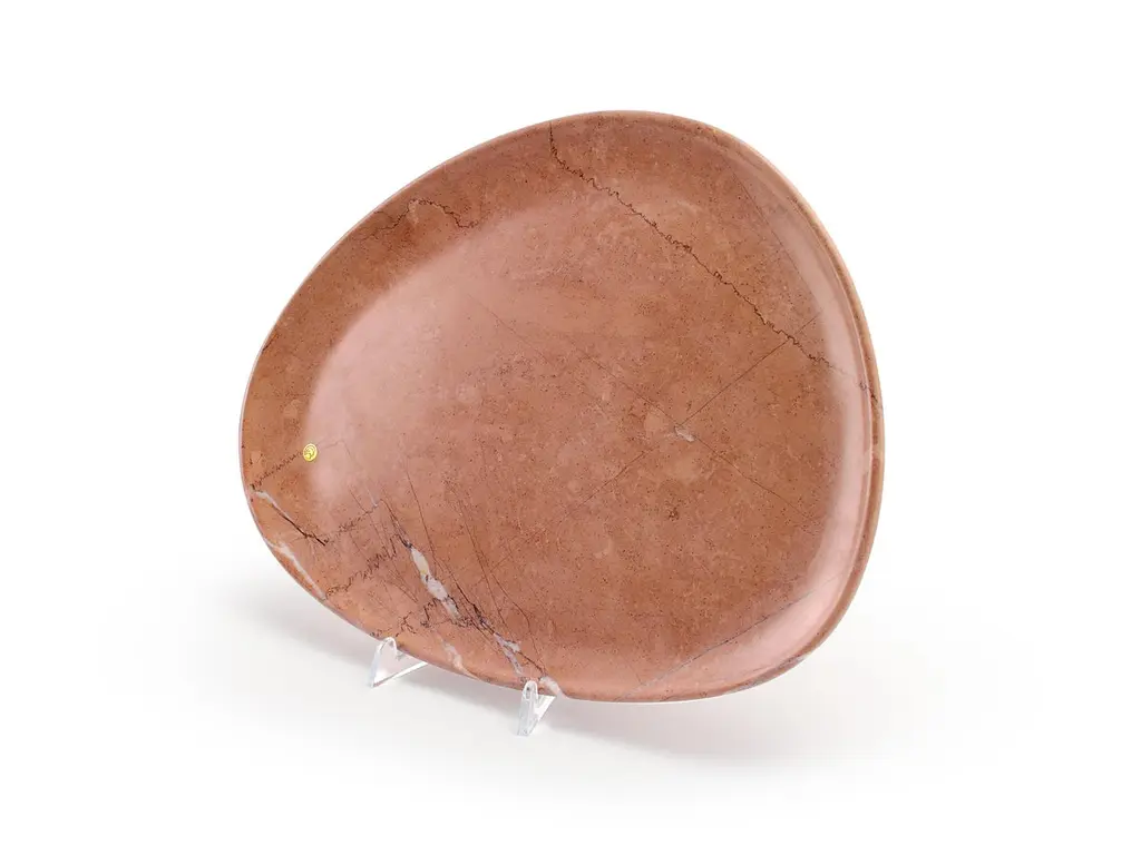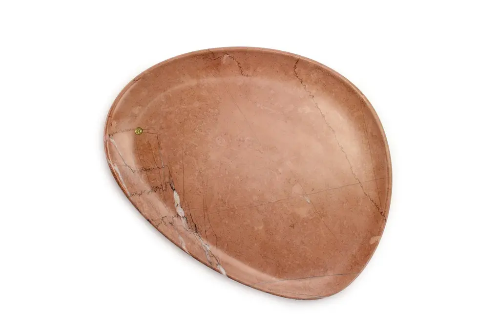 Hand carved presentation plate from pink Assisi stone. Multiple use as plates, platters and placers. Dimensions: Medium - L 30 W 28 H 1.8 cm, also available: Small - L 24 W 20 H 1.8 cm / Big - L 36 W 35 H 1.8 cm.Available in different marbles, onyx and quartzite. 100% Hand made in Italy. Marble is a natural material, every piece is unique as each marble block is different in veins and color shades. All of our creations are handmade by Italian artisans and can slightly vary in shape and size. This is to be considered as a guarantee of a handmade object. All Pieruga objects are made of precious and natural marbles and onyx. Marble is sensitive to acid-based liquids, especially a prolonged contact with substances such as wine, lemon, vinegar, fruit juices, cola and alcohol can stain the surface.Cleaning should be carried out with a soft sponge, water and neutral detergent. Do not use metallic or abrasive sponges, do not wash in the dishwasher, do not use in the microwave. The color of the marble after washing can undergo variations due to the humidity trapped in the surface’s micro-pores. Once fully dried it will regain its original color. The brass inlays tend to oxidize over time, to make them return to shine again use a soft cotton pad soaked in a solution of water and traditional Marseille soap, gently rub over the brass inserts and rinse the surface thoroughly. We are against the use of chemical products, all Pieruga objects are processed and polished through long manual processes without the use of polishing liquids.Pieruga proudly creates elegant accessories and complements in marble through artisanal processes, bringing into dialogue ancient techniques of sculpture with advanced technologies. 100% handmade in Italy.Our mission is a clear signal of opposition to the enormous waste that occurs in the extraction and processing of large blocks of marble, tons of material are discarded and thrown, in disfigurement to the generosity of our mountains.Rediscovering the ancient art of manual sculpture we give new life to even the smallest fragment of marble, bringing to light its millenary beauty that is lost in more than 2000 years of architecture and sculpture.Pieruga marble is a new brand by Barberini & Gunnell.The Atelier Barberini & Gunnell was founded by the architects and designers Francesco Barberini and Nina A. Gunnell The artworks by Barberini & Gunnell are regularly shown at international art fairs, such as PAD London, PAD Genève, PAD Monaco, Salon Art + Design New York, Art Miami.
