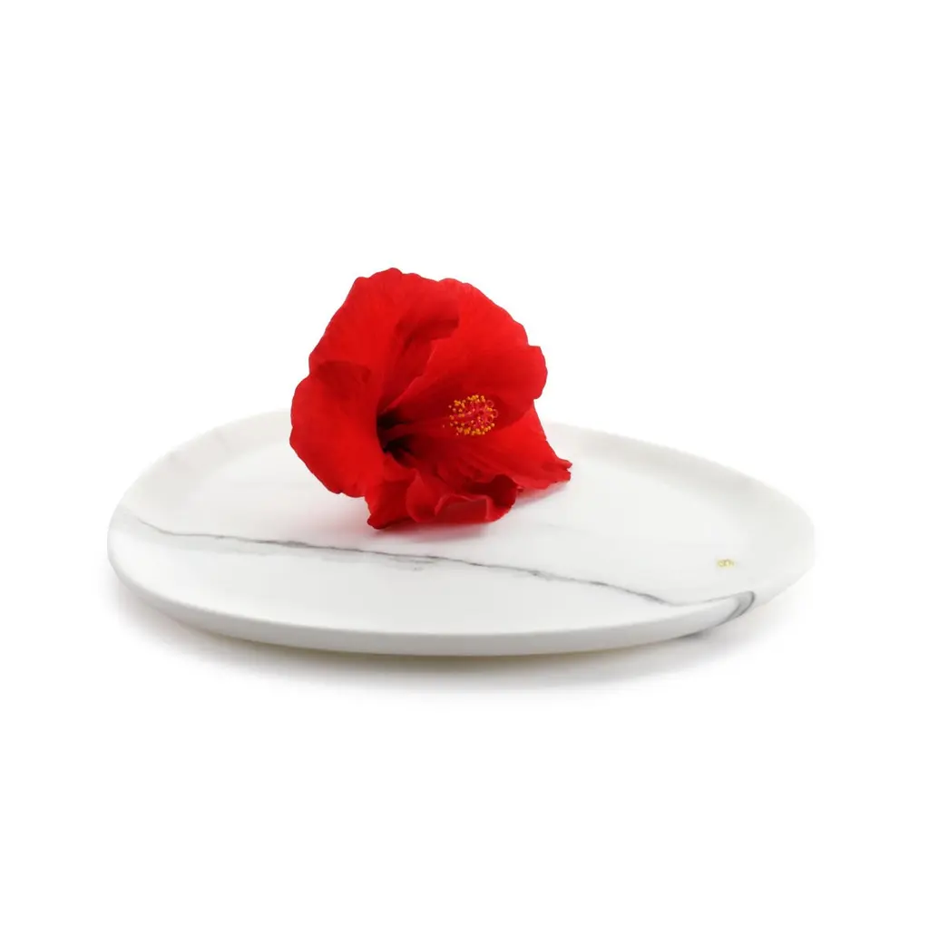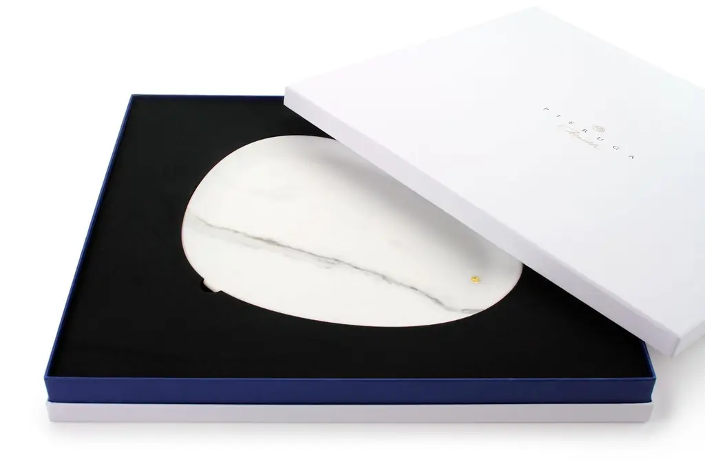 Hand carved presentation plate from Statuary marble. Multiple use as plates, platters and placers. The precious white statuary marble has always been the one preferred by sculptors and artists for their artworks. Known throughout the world, this beautiful marble has been used since Roman times in sculptural art for its luster and compact structure, characteristics that make it perfect to be worked with a chisel.Dimensions: Medium L 30, W 28, H 1.8 cm, also available: Small L 24, W 20, H 1.8 cm, big L 36, W 35, H 1.8 cm.Available in different marbles, onyx and quartzite. 100% Hand made in Italy. Marble is a natural material, every piece is unique as each marble block is different in veins and color shades. All of our creations are handmade by Italian artisans and can slightly vary in shape and size. This is to be considered as a guarantee of a handmade object. All Pieruga objects are made of precious and natural marbles and onyx. Marble is sensitive to acid-based liquids, especially a prolonged contact with substances such as wine, lemon, vinegar, fruit juices, cola and alcohol can stain the surface.Cleaning should be carried out with a soft sponge, water and neutral detergent. Do not use metallic or abrasive sponges, do not wash in the dishwasher, do not use in the microwave. The color of the marble after washing can undergo variations due to the humidity trapped in the surface’s micro-pores. Once fully dried it will regain its original color. The brass inlays tend to oxidize over time, to make them return to shine again use a soft cotton pad soaked in a solution of water and traditional Marseille soap, gently rub over the brass inserts and rinse the surface thoroughly. We are against the use of chemical products, all Pieruga objects are processed and polished through long manual processes without the use of polishing liquids.Pieruga proudly creates elegant accessories and complements in marble through artisanal processes, bringing into dialogue ancient techniques of sculpture with advanced technologies. 100% handmade in Italy.Our mission is a clear signal of opposition to the enormous waste that occurs in the extraction and processing of large blocks of marble, tons of material are discarded and thrown, in disfigurement to the generosity of our mountains.Rediscovering the ancient art of manual sculpture we give new life to even the smallest fragment of marble, bringing to light its millenary beauty that is lost in more than 2000 years of architecture and sculpture.Pieruga marble is a new brand by Barberini & Gunnell.The Atelier Barberini & Gunnell was founded by the architects and designers Francesco Barberini and Nina A. Gunnell The artworks by Barberini & Gunnell are regularly shown at international art fairs, such as PAD London, PAD Genève, PAD Monaco, Salon Art + Design New York, Art Miami.