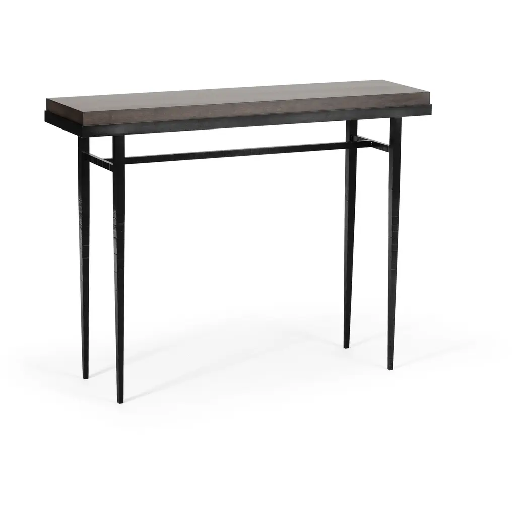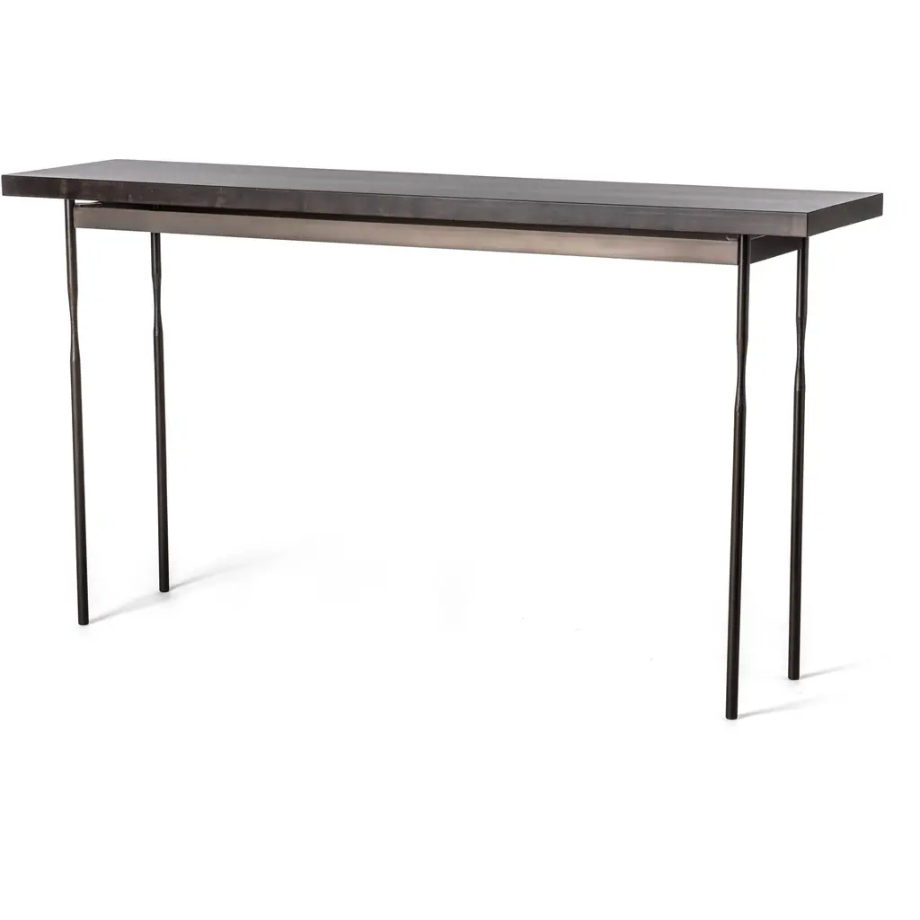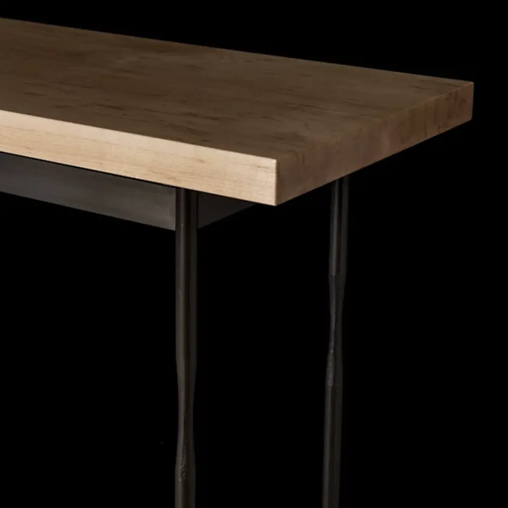Something for the minimalist, the modernist and the artisan. The Senza Wood Top Console Table by Hubbardton Forge is contemporary artistry at its finest, with a solid Vermont maple wood top that warms up the clean, linear silhouette. Each solid steel leg features a fullered detail that is crafted in Hubbardton Forge's Vermont forge. Set it behind a sofa for added surface space, or in an entryway to serve as a catch-all for keys, mail and other daily items.