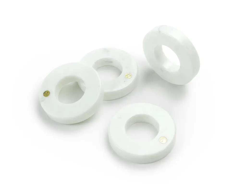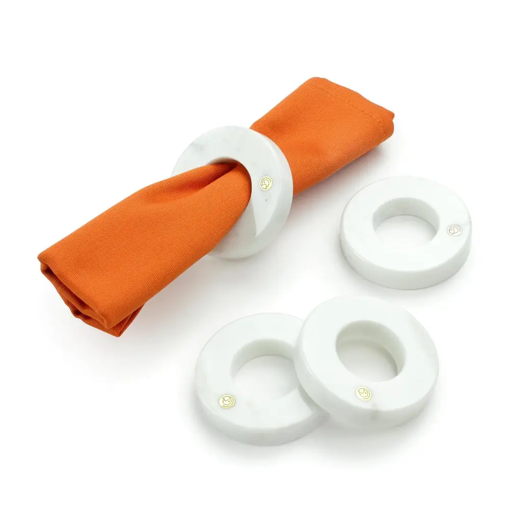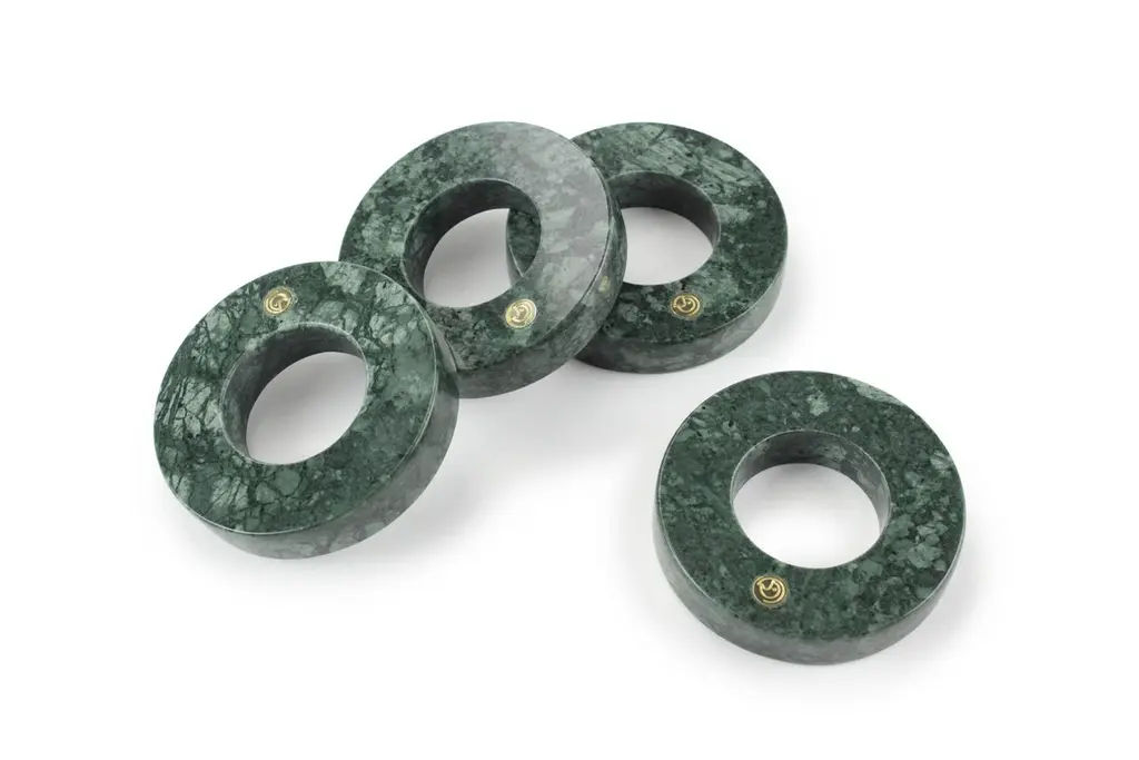 Hand carved serviette rings from Marquina marble with brass inlay. Set of 4 pieces.Dimensions: D 7.5, H 1.5 cmAvailable in different marbles, onyx and quartzite. 100% Hand made in Italy.Marble is a natural material, every piece is unique as each marble block is different in veins and color shades. All of our creations are handmade by Italian artisans and can slightly vary in shape and size. This is to be considered as a guarantee of a handmade object. All Pieruga objects are made of precious and natural marbles and onyx. Marble is sensitive to acid-based liquids, especially a prolonged contact with substances such as wine, lemon, vinegar, fruit juices, cola and alcohol can stain the surface.Cleaning should be carried out with a soft sponge, water and neutral detergent. Do not use metallic or abrasive sponges, do not wash in the dishwasher, do not use in the microwave. The color of the marble after washing can undergo variations due to the humidity trapped in the surface’s micro-pores. Once fully dried it will regain its original color. The brass inlays tend to oxidize over time, to make them return to shine again use a soft cotton pad soaked in a solution of water and traditional Marseille soap, gently rub over the brass inserts and rinse the surface thoroughly. We are against the use of chemical products, all Pieruga objects are processed and polished through long manual processes without the use of polishing liquids.Pieruga proudly creates elegant accessories and complements in marble through artisanal processes, bringing into dialogue ancient techniques of sculpture with advanced technologies. 100% handmade in Italy.Our mission is a clear signal of opposition to the enormous waste that occurs in the extraction and processing of large blocks of marble, tons of material are discarded and thrown, in disfigurement to the generosity of our mountains.Rediscovering the ancient art of manual sculpture we give new life to even the smallest fragment of marble, bringing to light its millenary beauty that is lost in more than 2000 years of architecture and sculpture.Pieruga marble is a new brand by Barberini & Gunnell.The Atelier Barberini & Gunnell was founded by the architects and designers Francesco Barberini and Nina A. Gunnell The artworks by Barberini & Gunnell are regularly shown at international art fairs, such as PAD London, PAD Genève, PAD Monaco, Salon Art + Design New York, Art Miami.