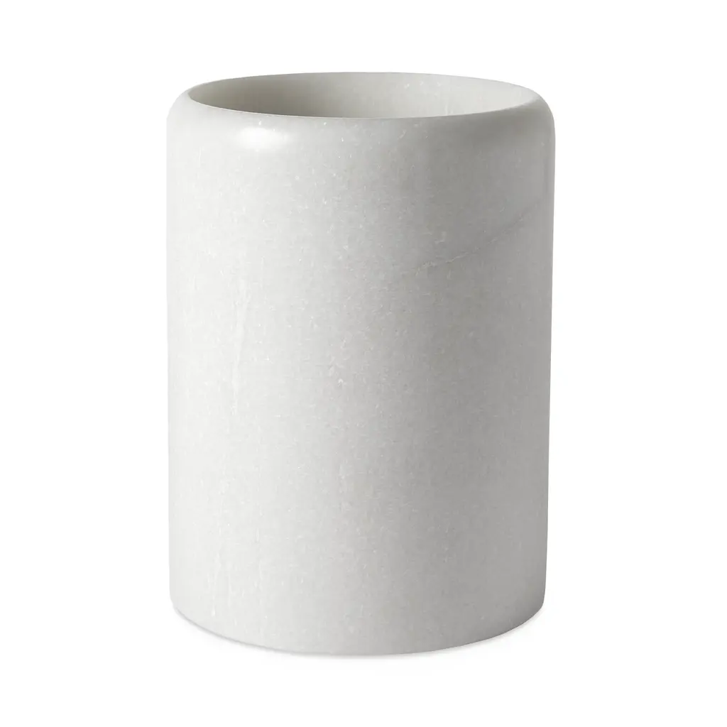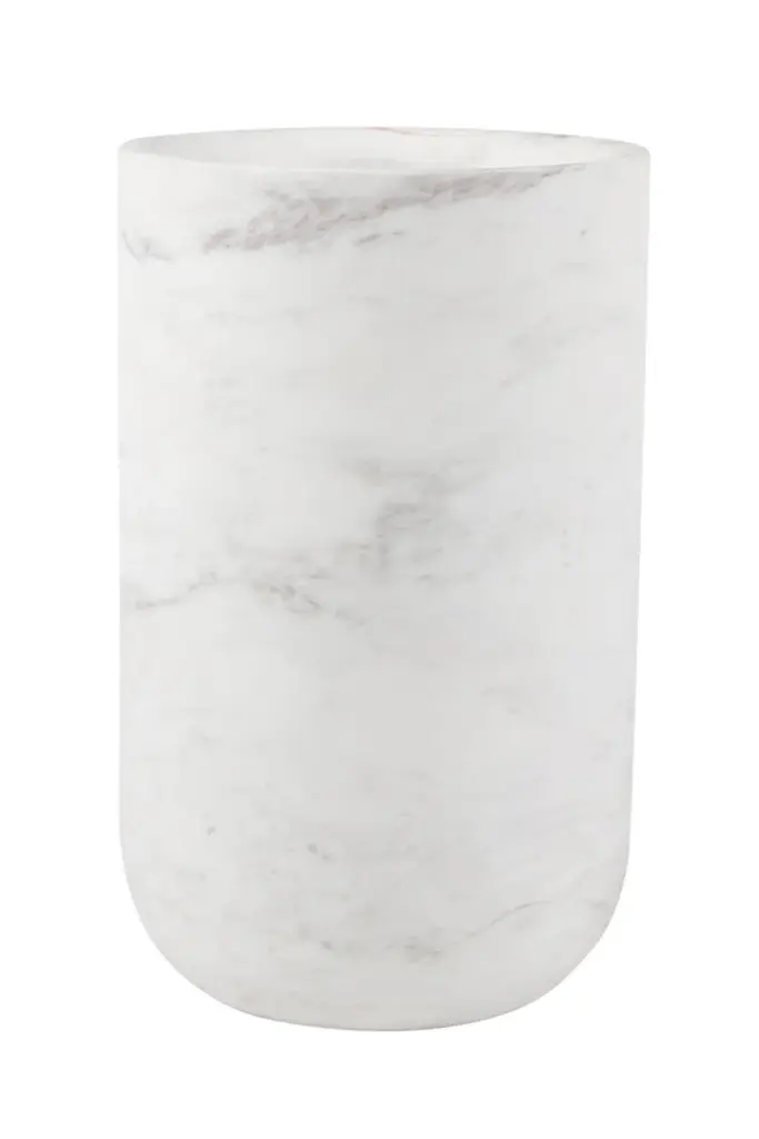 Water glass in satin white Carrara marble. Each piece is in a way unique (every marble block is different in veins and shades) and handmade by Italian artisans specialized over generations in processing marble. Slight variations in shape, color, and size are to be considered a guarantee of a handmade creation. It's important not to use lemon or vinegar on it, clean only with water and natural soap (like Marseilles soap), do not put in dishwasher.