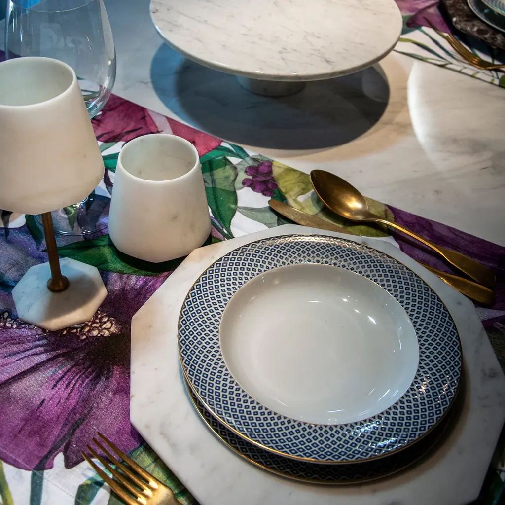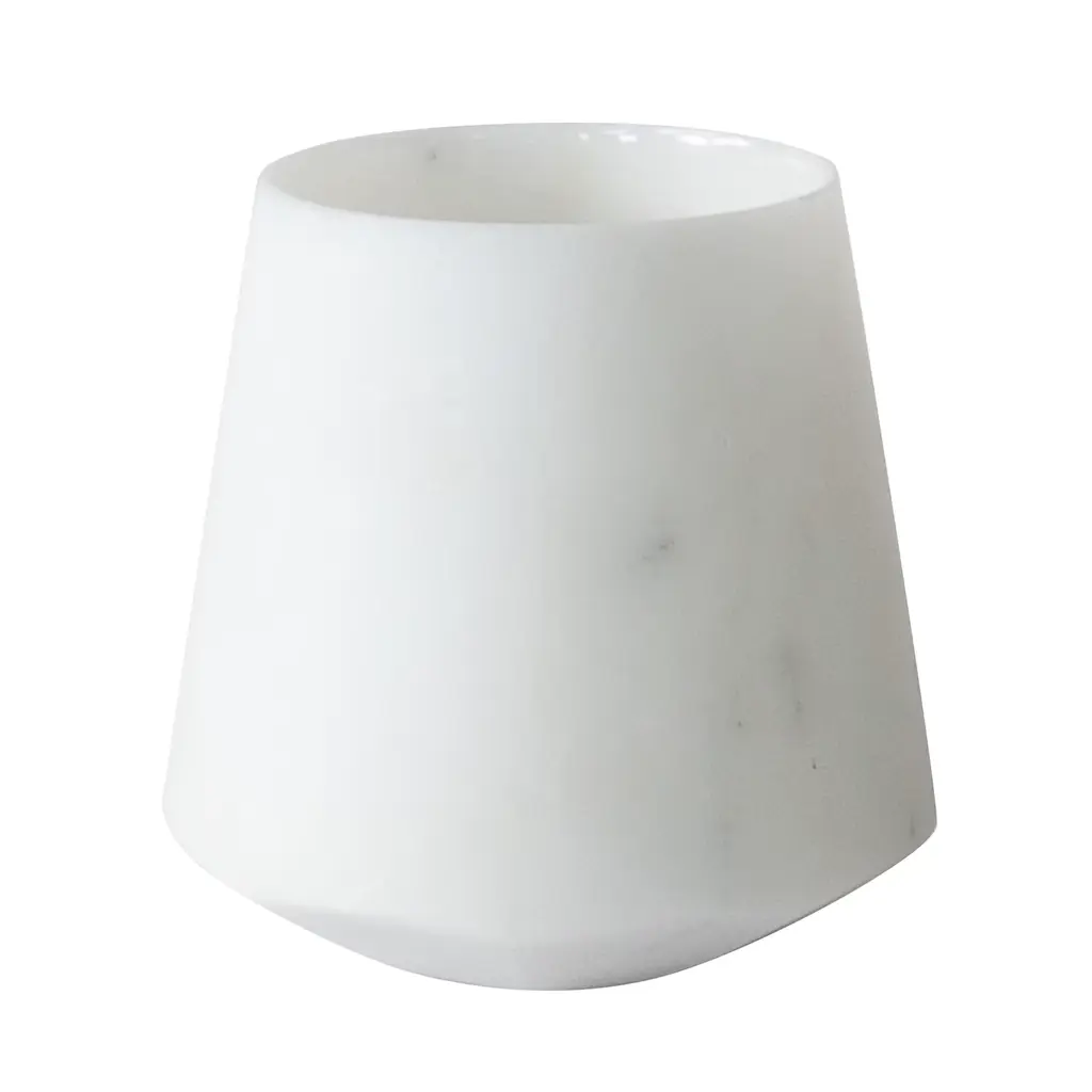 Water glass in satin white Carrara marble and brass underneath. Each piece is in a way unique (every marble block is different in veins and shades) and handmade by Italian artisans specialized over generations in processing marble. Slight variations in shape, color, and size are to be considered a guarantee of a handmade creation. It's important not to use lemon or vinegar on it, clean only with water and natural soap (like Marseilles soap), do not put it in the dishwasher.