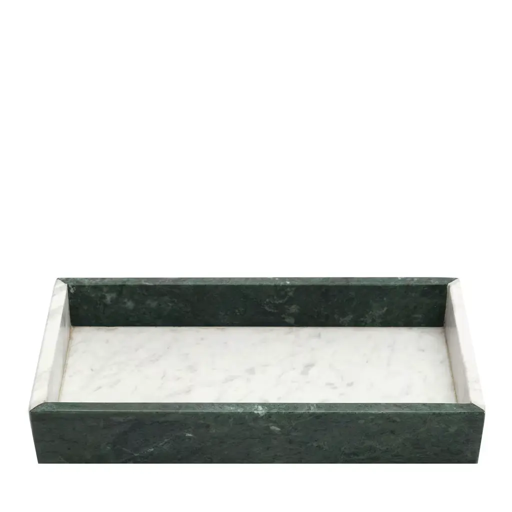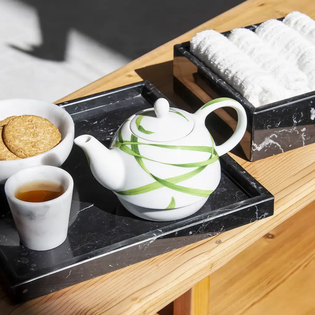 Set composed by one spa tray (26,5x26,5x2cm) and one towel tray (17,5x17x6cm) in black Marquina marble, one small bowl (12,5x5cm), and one small glass (6x6cm) in white Carrara satin marble. Each piece is in a way unique, slight variations in shape, color, and size are to be considered a guarantee of a handmade creation. It's important not to use lemon or vinegar on it, clean only with water and natural soap (like Marseilles soap), do not put it in the dishwasher.