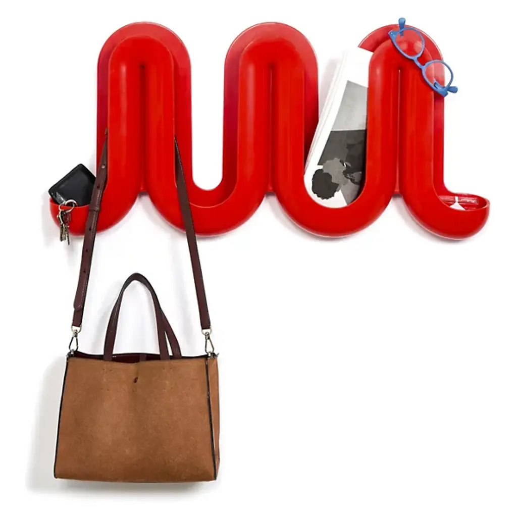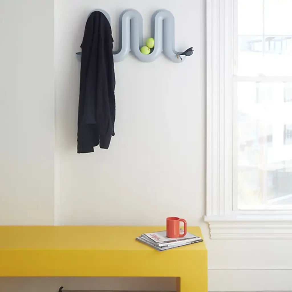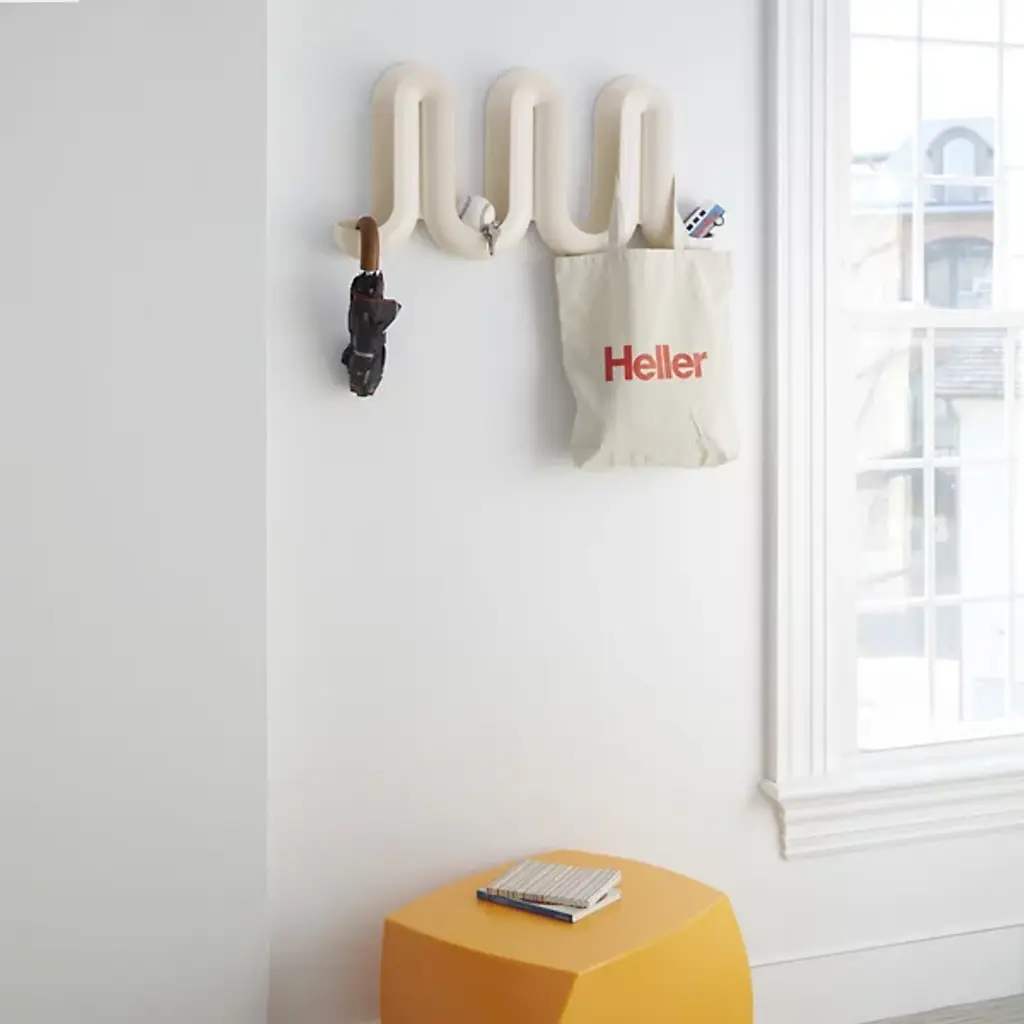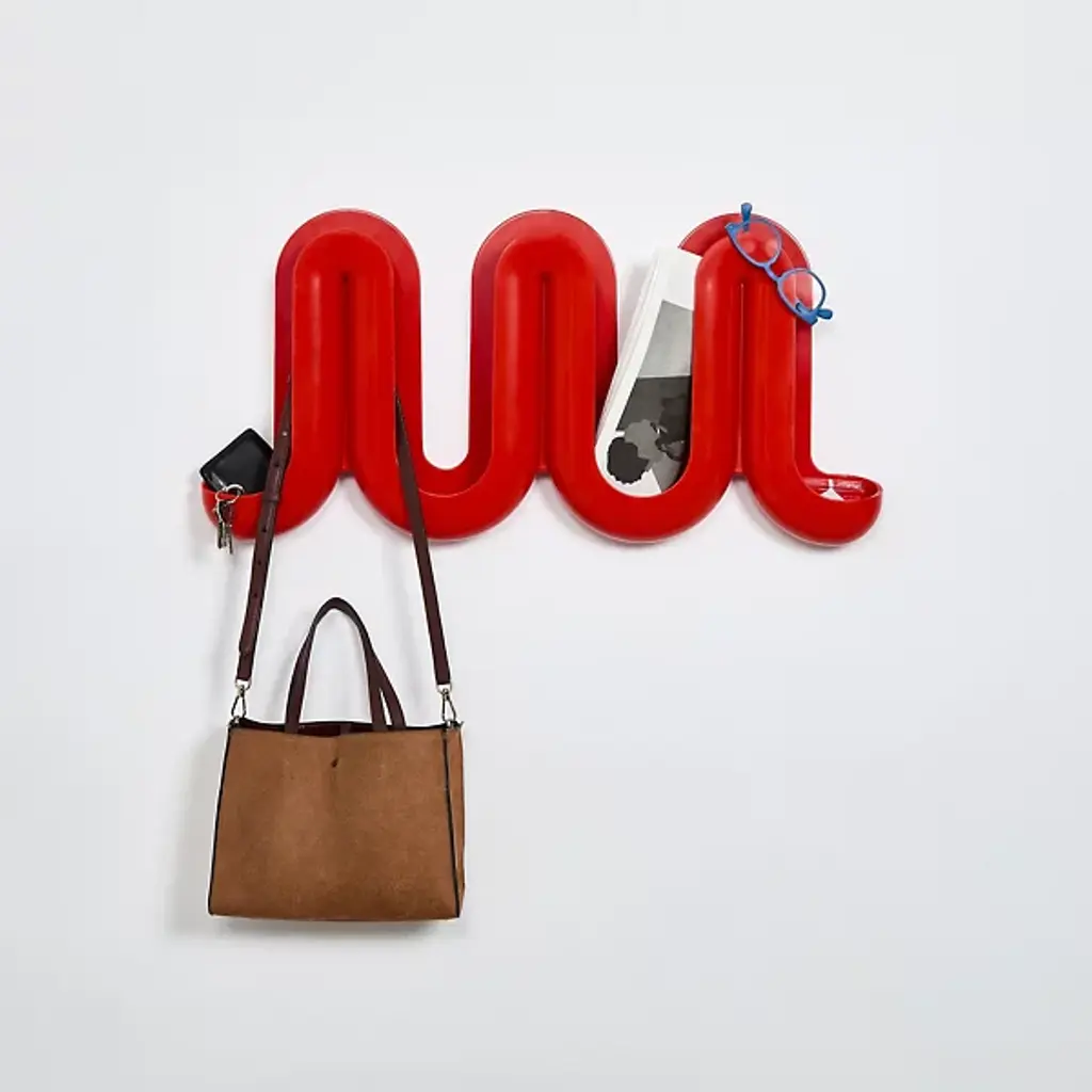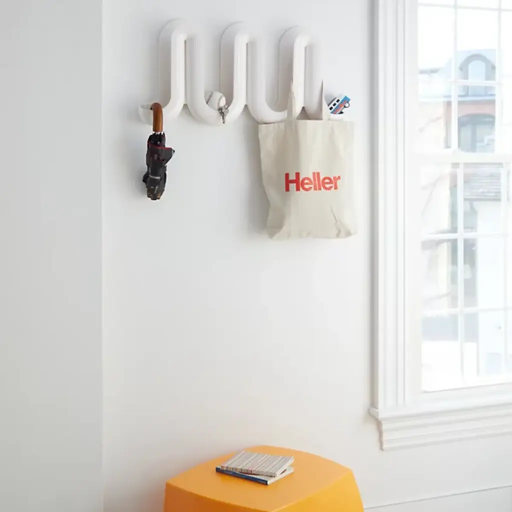 The Swell Wall Catchall from Heller simplifies coming and going from your home or office. Designed by Anna Dawson in 2022 and inspired by her California surfing lifestyle, this swooping, contemporary piece provides a convenient solution for hanging clothing and storing keys and wallets in its curving cups. Made from 100% recyclable ABS, it’s both functional and eco-friendly, perfect for holding small accessories and adding a whimsical appeal to its surroundings.