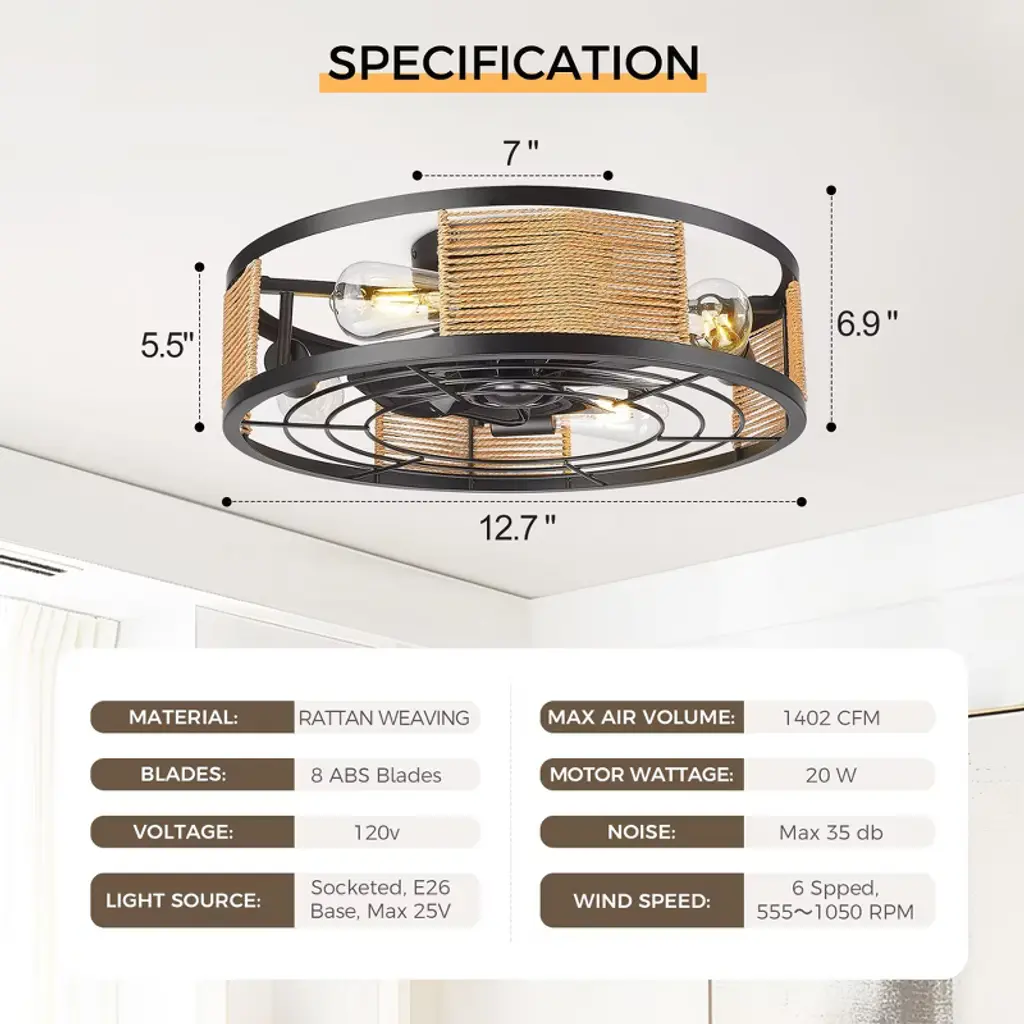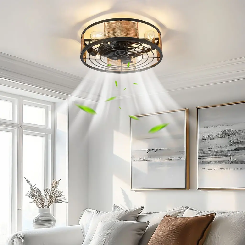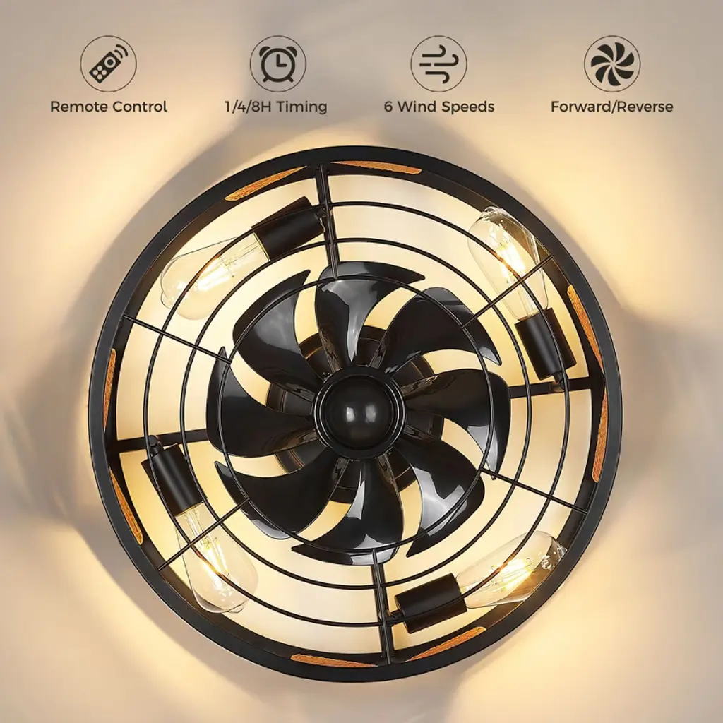 This 20-inch black LED reversible ceiling fan features an open cage design and high-quality ABS blades, showcasing a modern style. The remote control allows you to easily switch between six different speed settings to meet your room's requirements. We particularly appreciate its reversible motor, which cools your space in the summer and circulates warm air in the winter, making it an ideal choice for industrial-style interiors, such as bedrooms, living rooms, dining rooms, and hallways.