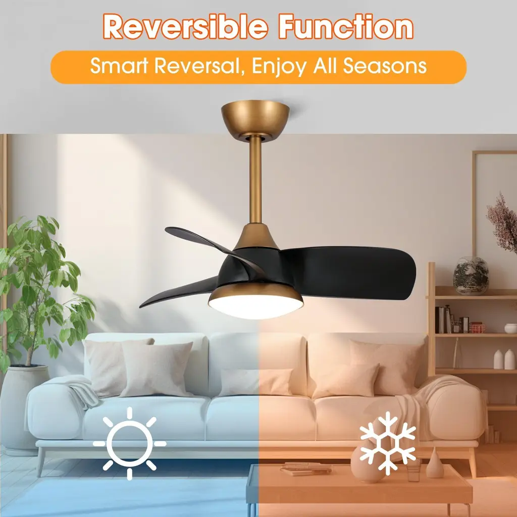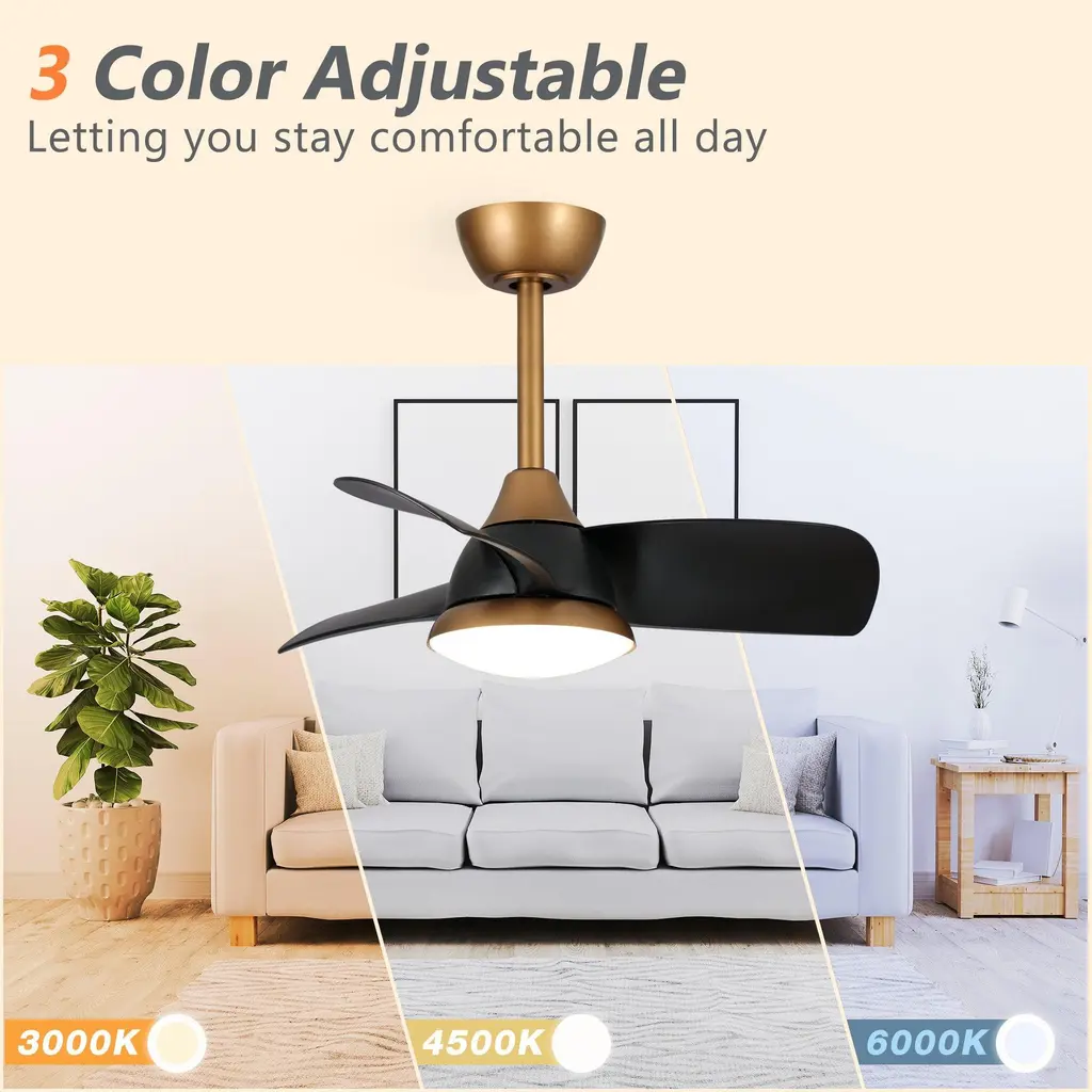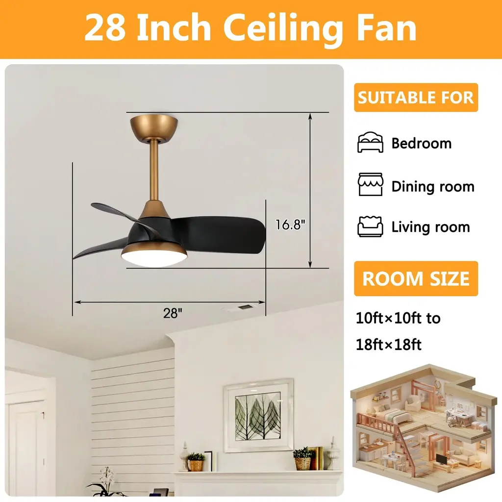 Keep your small bedroom cool with this stylish 28" ceiling fan. Boasting a bronze metal downrod and base, it also features three black fan blades for a contrasting, modern look. Moreover, an efficient LED light with a white glass shade enhances this sleek design. The quiet DC motor not only has a reverse function for year-round use but also uses downdraft mode to produce cool airflow in the summer. In winter, however, it switches to updraft mode to rotate and circulate warm air. Additionally, it offers three light color options: 3000/4000/6000K, and the light is dimmable. Therefore, our ceiling fans, which come with a light and a remote control, have all functions easily controlled by the remote, providing convenience and style in one package.