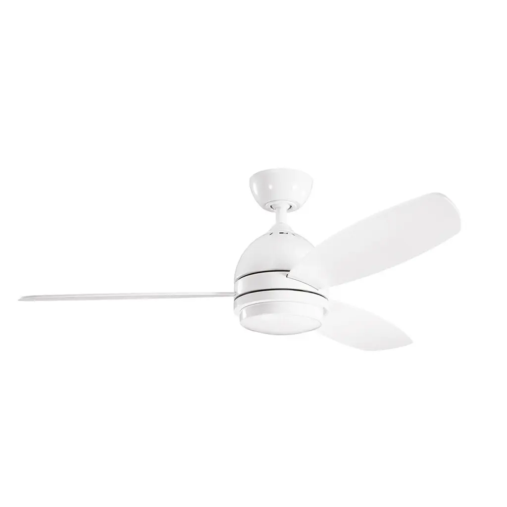 Bring a refreshing breeze to your porch or patio with the Kichler 34" Sola LED ceiling fan. This low-profile hugger design comes in matte white finish with three matte white finish molded ABS blades. It comes with an etched case opal glass light kit for the extra bonus of ambient lighting. UL listed for wet locations.