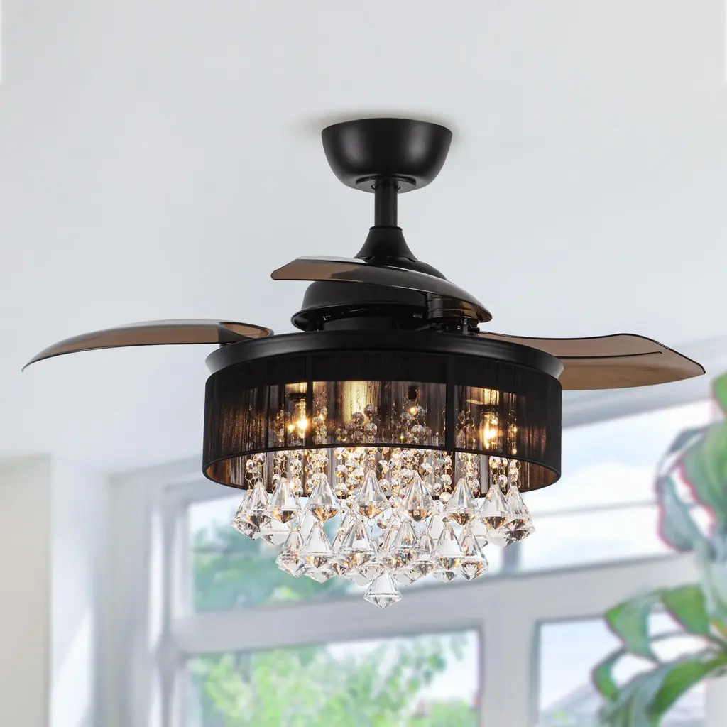 You will be shocked at this modern yet traditional chandelier that doubles as a fan The perfect combination of glam and function. It has an independent light. The blades retract when the fan is not in use. How cool is it that The crystals are beautiful and sparkly? Don't worry, the crystals do not move or make noise when the fan is on. It is perfect for your bedroom.