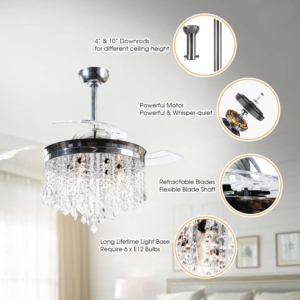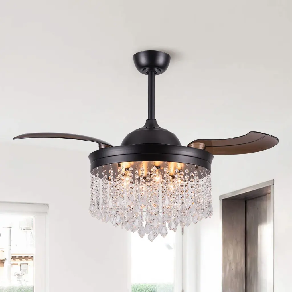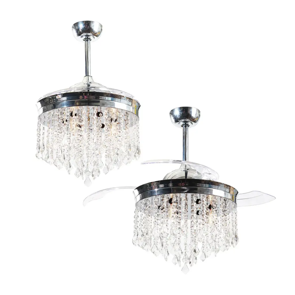 It is a combination of a retractable ceiling fan and a crystal chandelier. When switched off, the intrusive fan blades automatically retract and conceal, and visually the unit transforms into a slim, modern chandelier. This high-end remote control allows you to control the light and the fan speed separately, with 3 fan speeds.