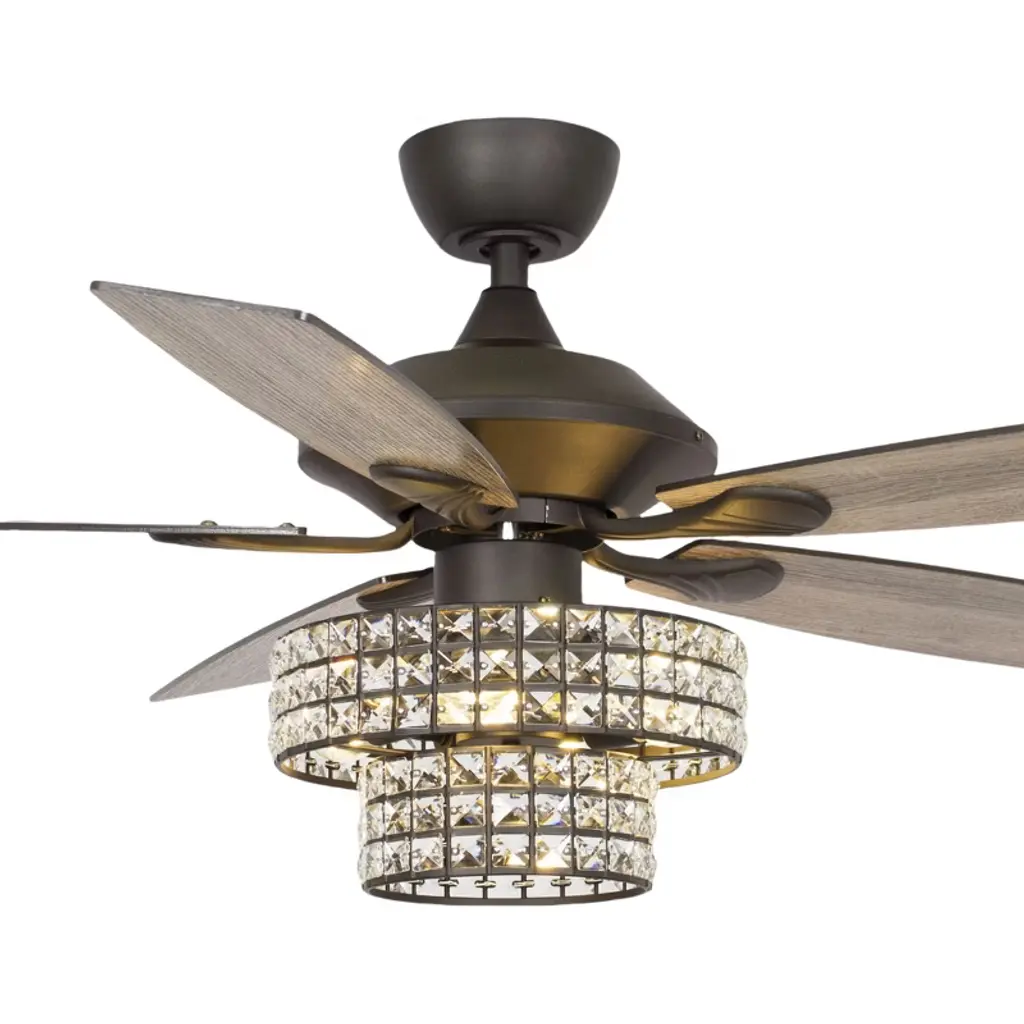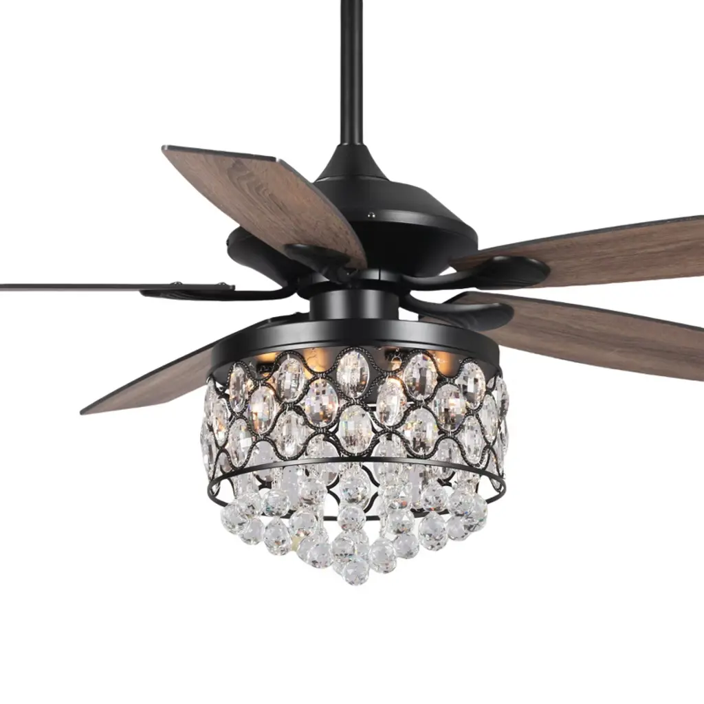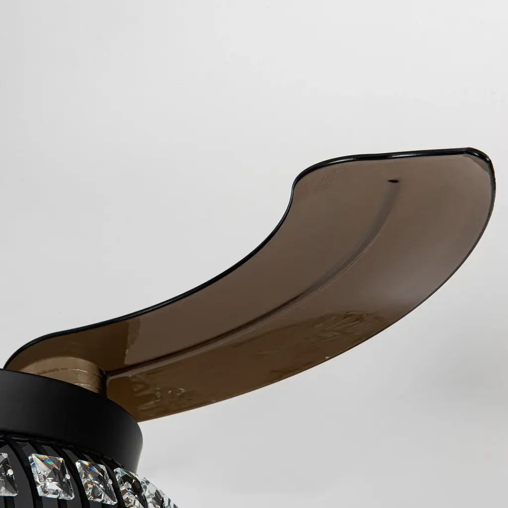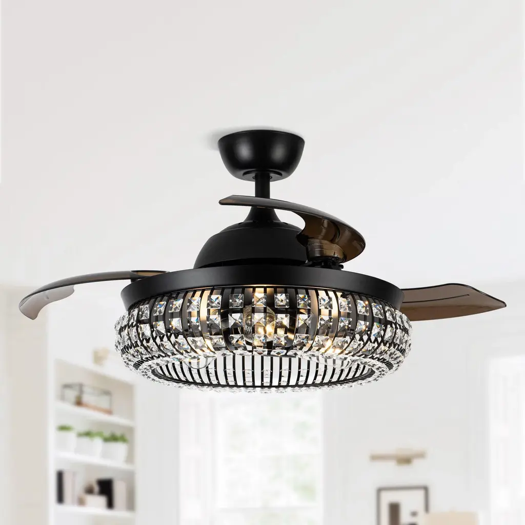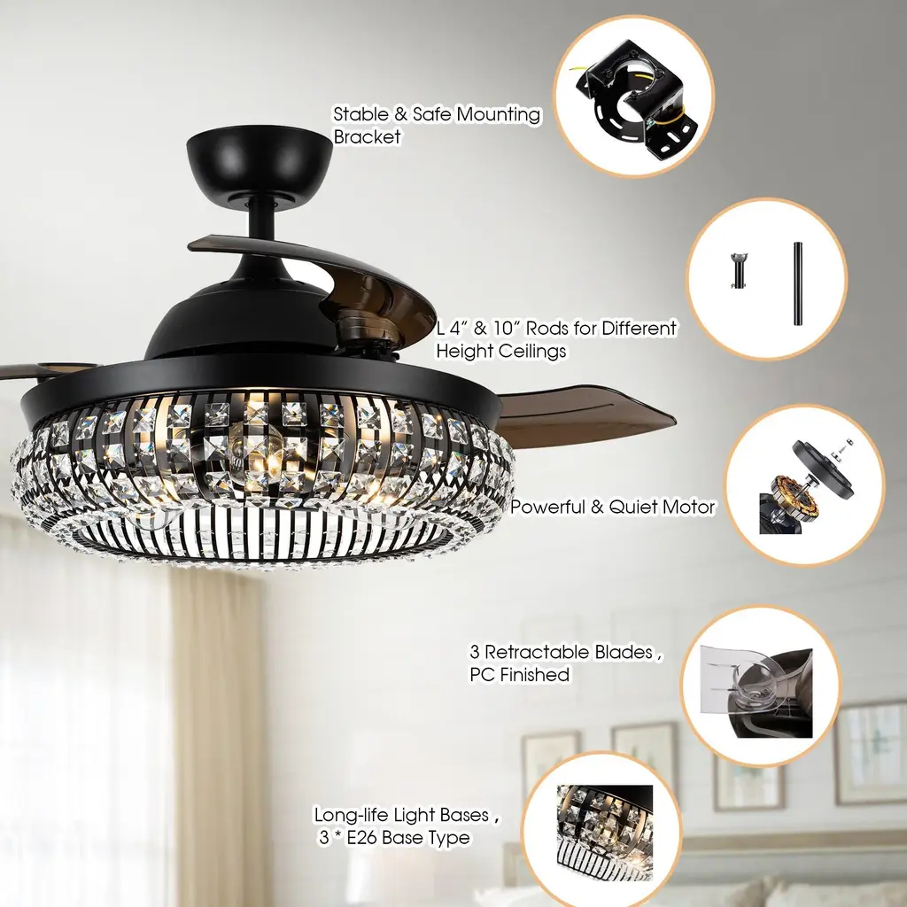Illuminate your room in style with this crystal ceiling fan. Function meets fashion in this radiant and chic 42-inch retractable chandelier ceiling fan. This fan boasts three LED lights for wonderful illumination surrounded by artful and elegant crystal-embedded shade for a delightfully distinctive look. Three dark brown blades allow for maximum air movement! This matte black ceiling fan adds the perfect touch of glamour to your home while also keeping air circulating with multi-speed functions. The handy remote control provides independent light operation and speed control. The motor technology delivers powerful air movement with whisper-quiet performance.