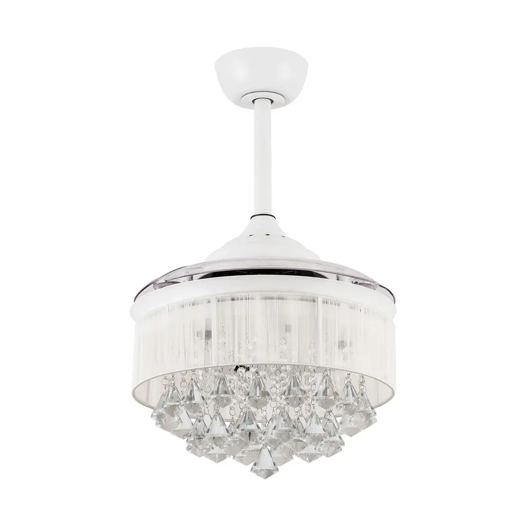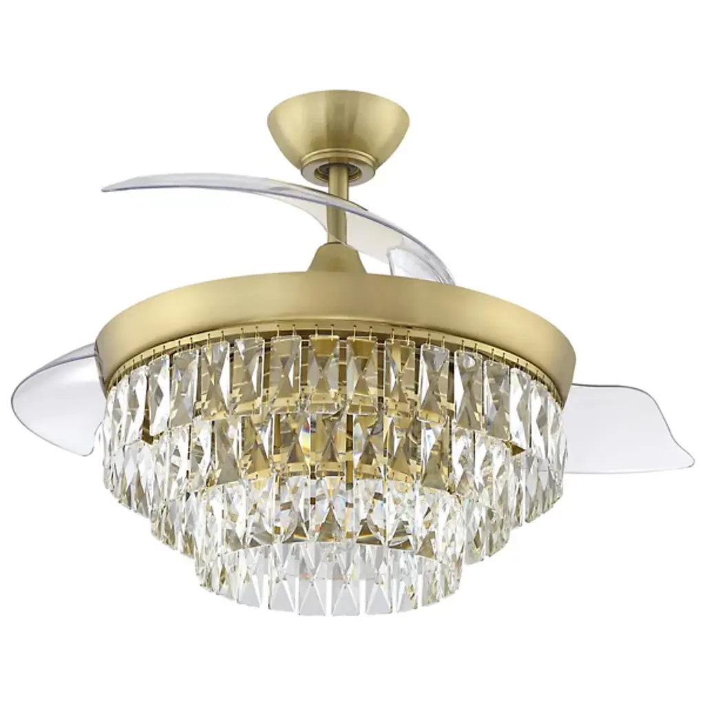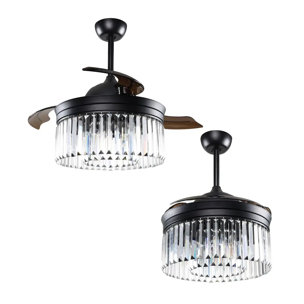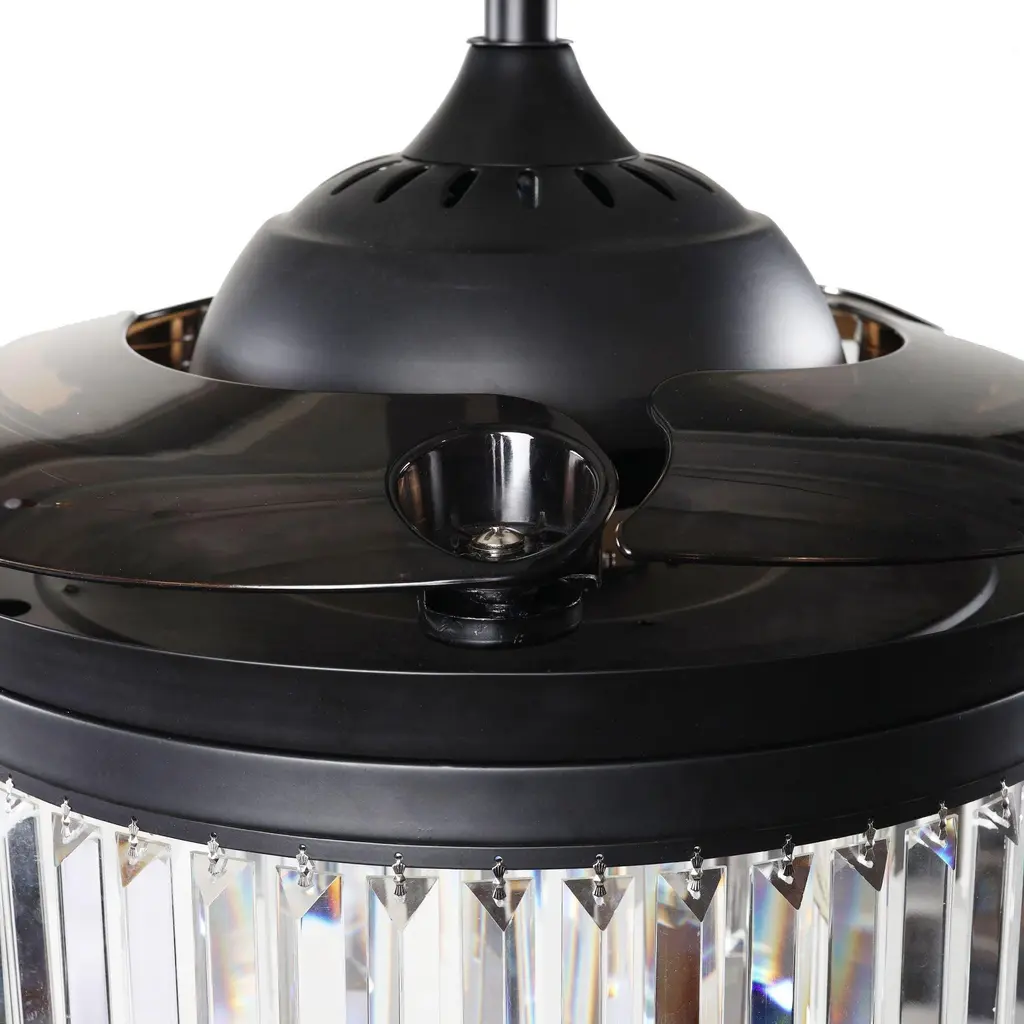 The 3-blade LED crystal chandelier ceiling fan with light, fan speed, and light can be controlled separately by remote control. Provided both functions of traditional lamps and fans. That makes it very convenient for you to use in the living room, bedroom, and so on. When you turn on the ceiling fan, the blades will stretch out, while when you turn off the fan, the blades will put inside automatically. Exclusive motor technology and a remote system ensure your fan will remain Quiet for life.