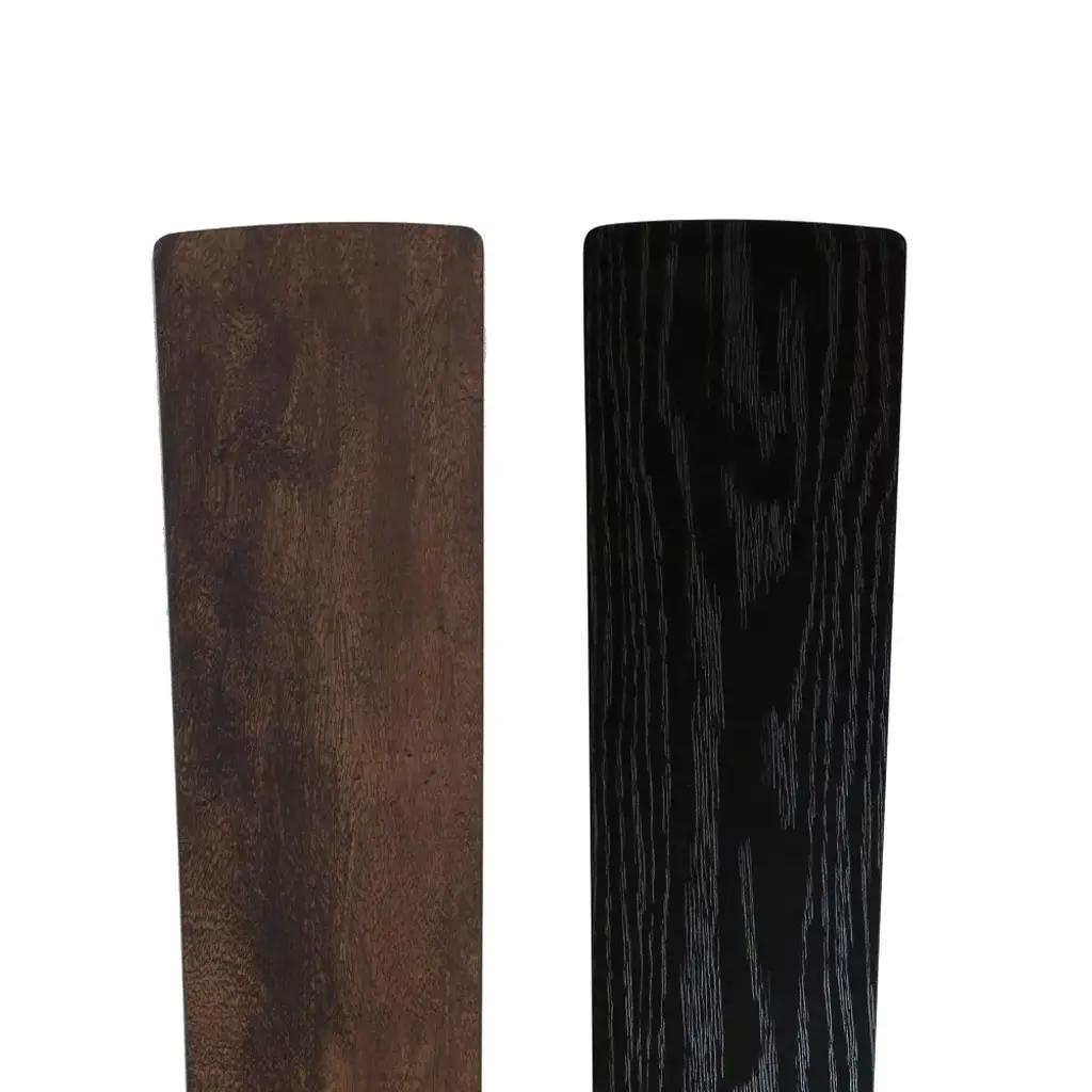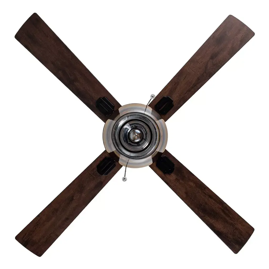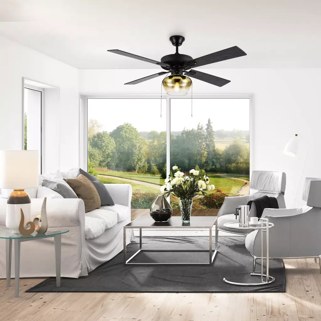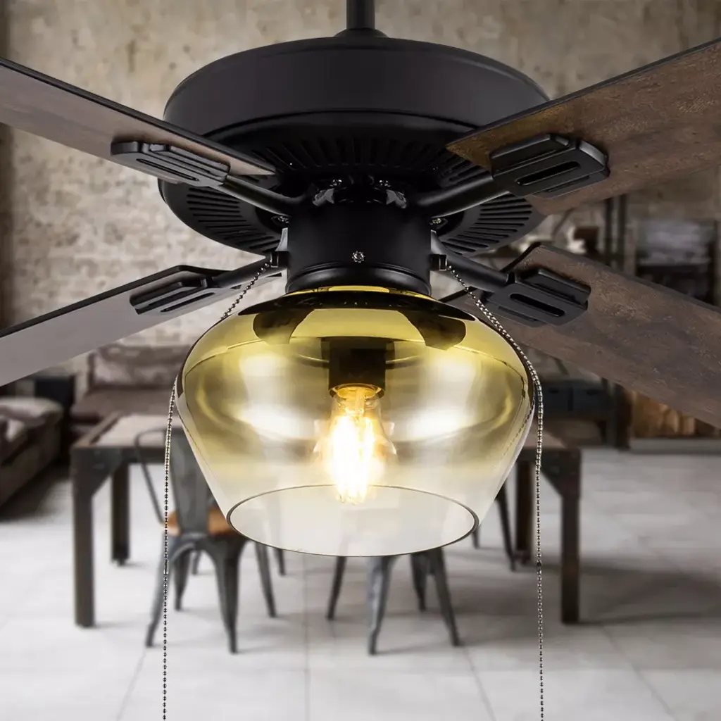 With a sophisticated base and a touch of industrial charm, the Liana Glass 52-Inch Flush-Mount Ceiling Fan with Light from River of Goods updates your space with lovely lighting and efficient airflow. Four reversible blades let you choose from black or rich barnwood finishes to coordinate with your interior decor, and a 40-watt motor with three speed settings is perfect for maximizing airflow in larger rooms for a more comfortable environment. Black fixtures with a satin finish give your space a polished touch while beautifully complementing the blades and conical shade for an all-around sleek aesthetic. beads dangle at the end of two 12-inch pull chains for glamorous appeal while also allowing for easy use. The light kit comes ready with one E26 8-watt bulb for quick setup, and you can either install it flush mounted into the ceiling or with the included 6-inch down rod. Place this metal ceiling fan with wood and glass accents anywhere from the entryway to the living room to dining room for a beautifully lit ambiance.