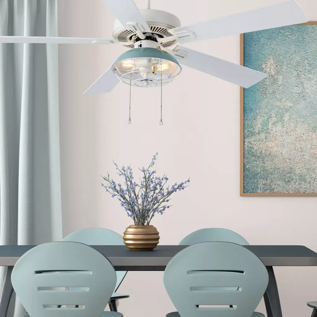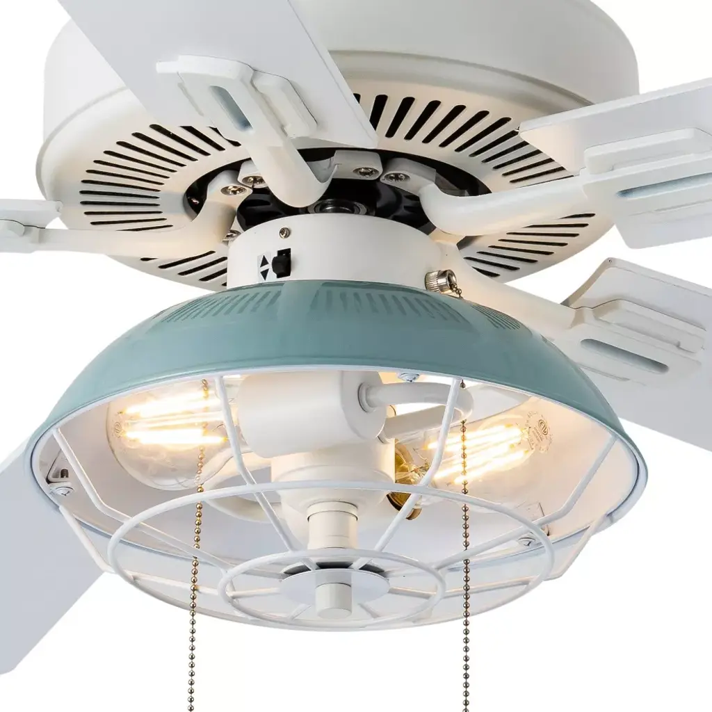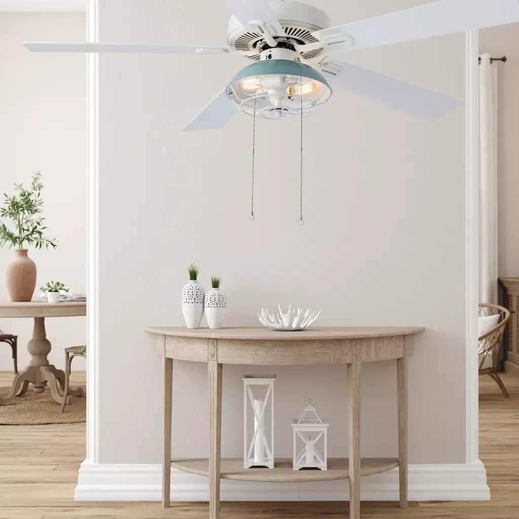 Add a subtly industrial touch to your coastal decor with the 52-Inch 5-Blade LED Coastal Caged Lantern Lighted Ceiling Fan from River of Goods. With five blades and a 41-watt motor, this ceiling fan helps to circulate the air in a large room for a more comfortable environment, while the 12.25-inch pull chain controls the light and three speed options to suit your comfort level. A blue painted shade makes for a crisp, coastal look, and it's accompanied by a caged wire design that encases the bulbs for a slightly industrial edge. The reversible fan blades feature a different color on each side, completing your decor with either white or a light oak shade, and it installs flush or with a 6-inch downrod, letting you pick the right style for the room.