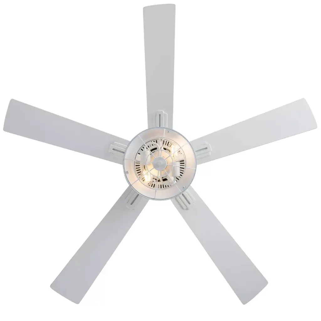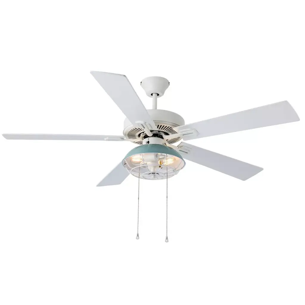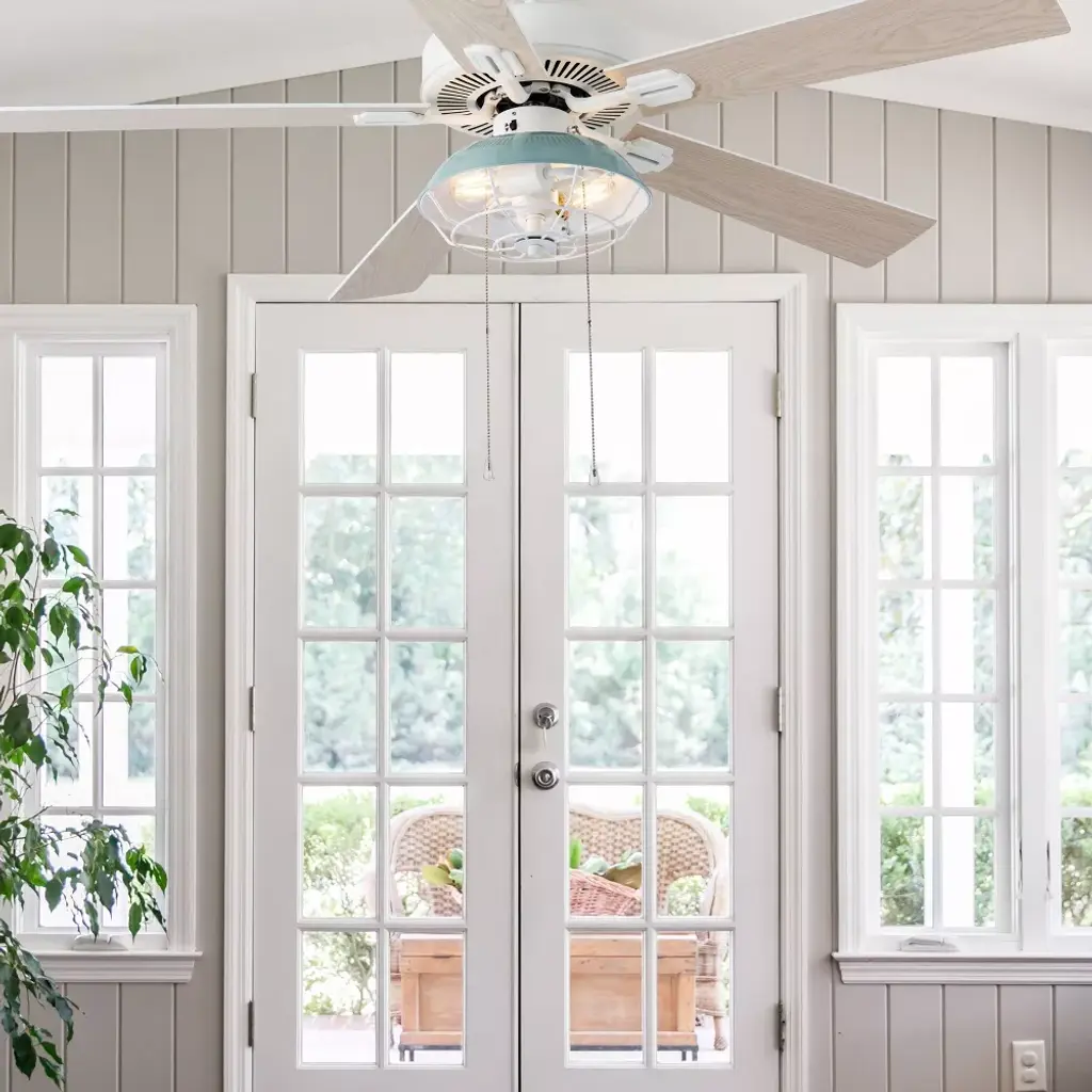 Add a subtly industrial touch to your coastal decor with the 52-Inch 5-Blade LED Coastal Caged Lantern Lighted Ceiling Fan from River of Goods. With five blades and a 41-watt motor, this ceiling fan helps to circulate the air in a large room for a more comfortable environment, while the 12.25-inch pull chain controls the light and three speed options to suit your comfort level. A blue painted shade makes for a crisp, coastal look, and it's accompanied by a caged wire design that encases the bulbs for a slightly industrial edge. The reversible fan blades feature a different color on each side, completing your decor with either white or a light oak shade, and it installs flush or with a 6-inch downrod, letting you pick the right style for the room.