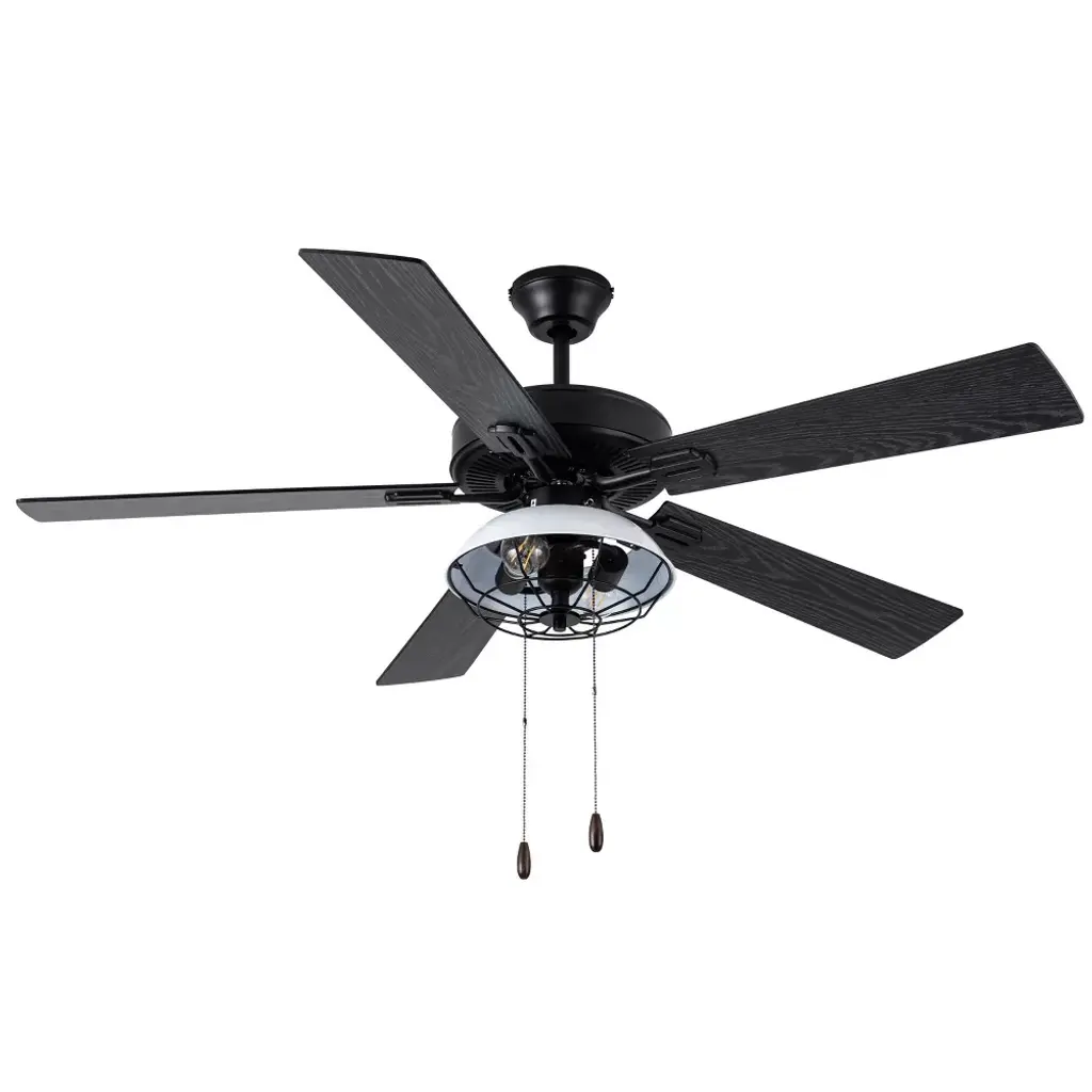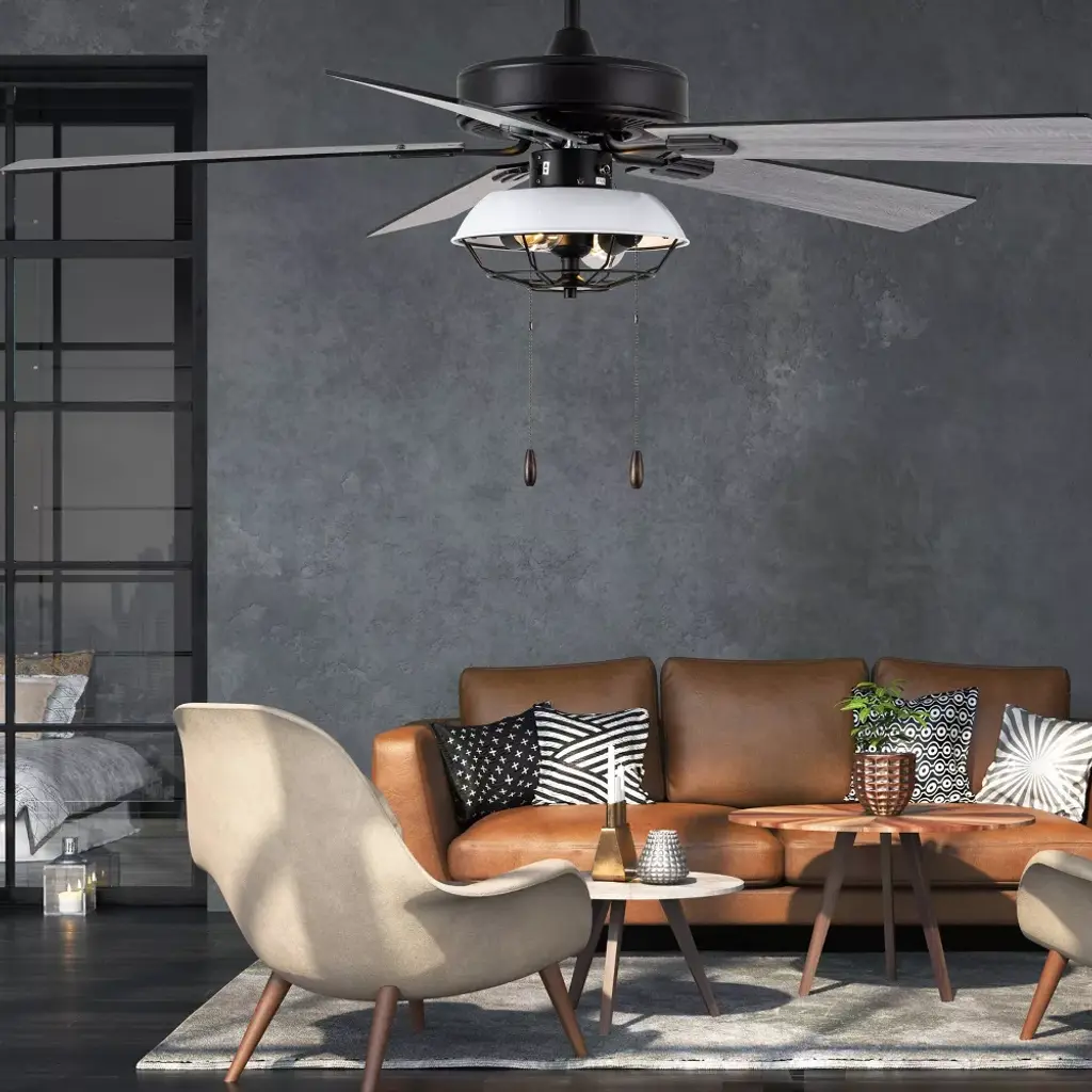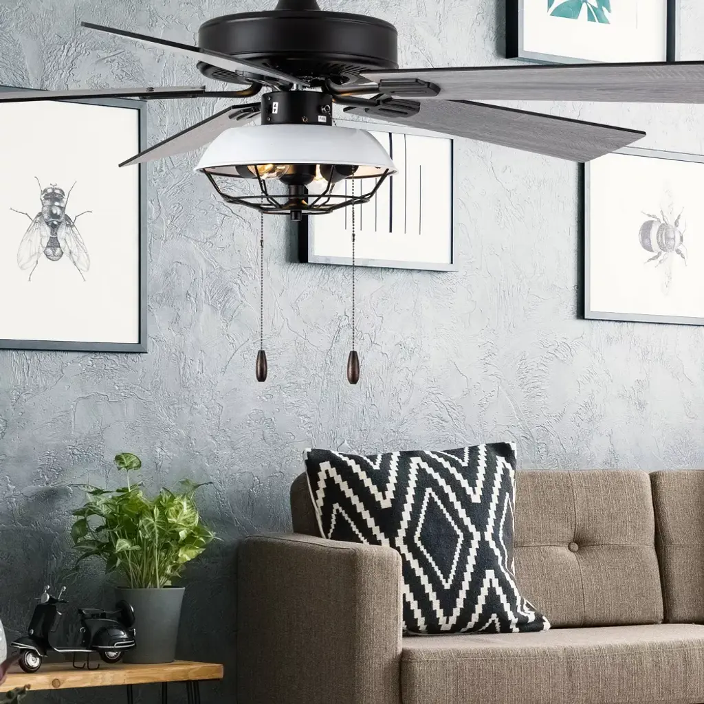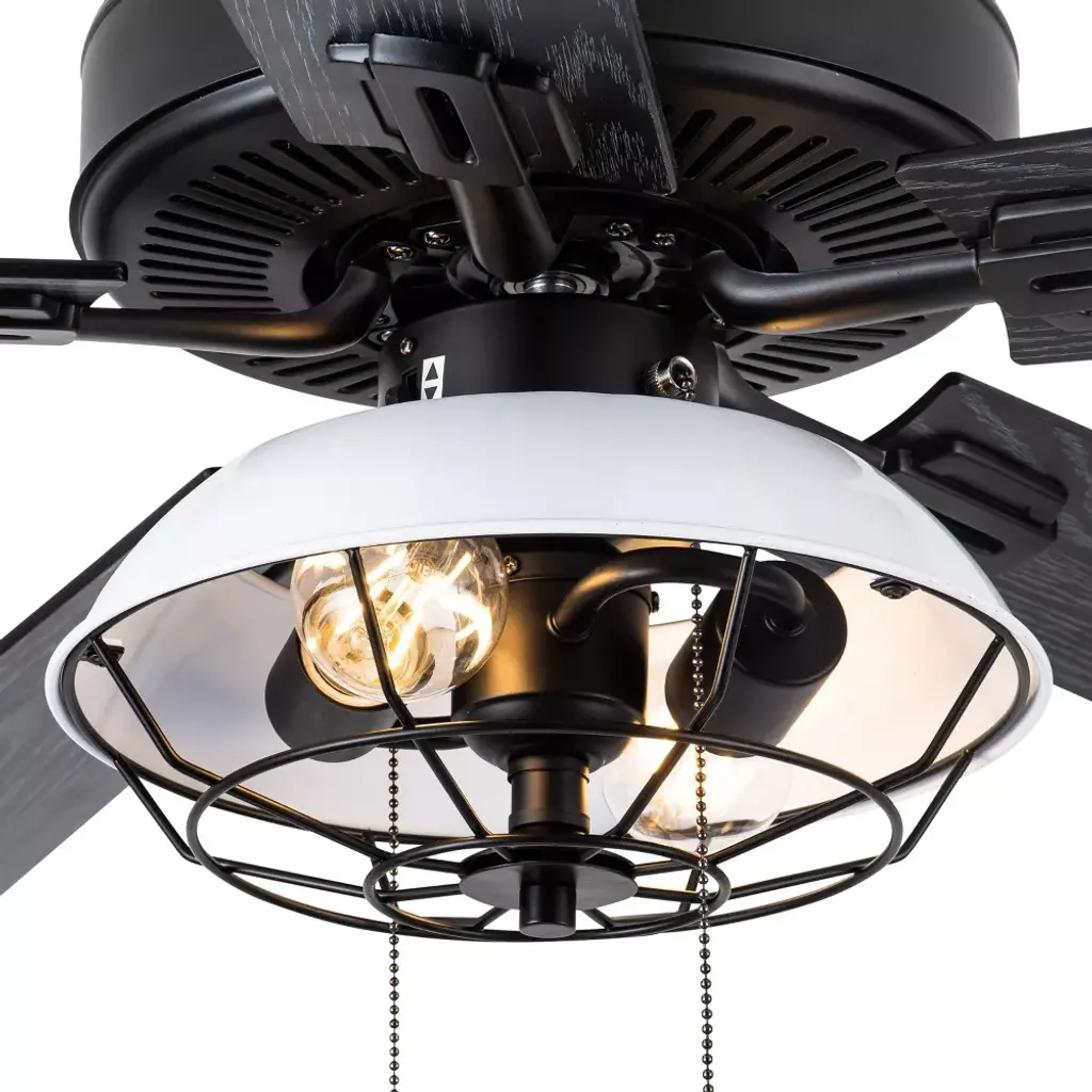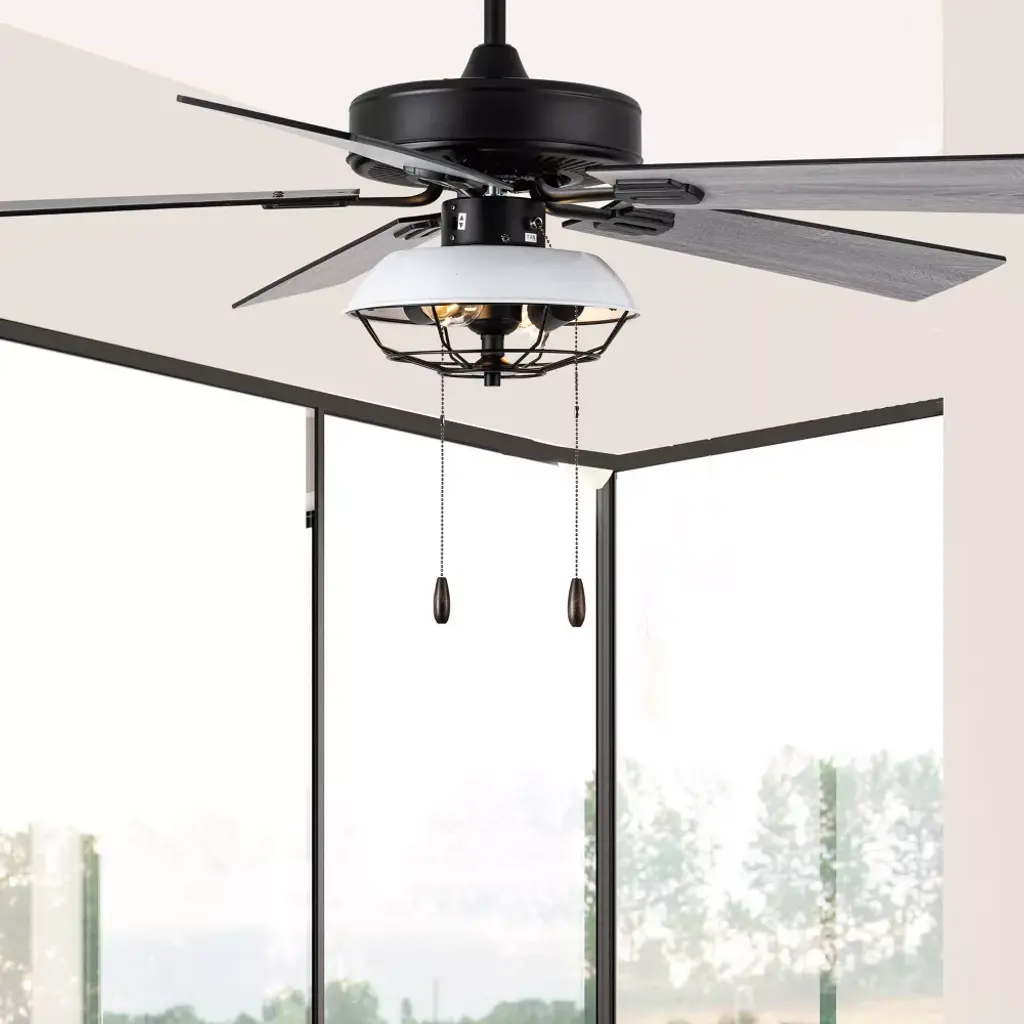 This 52-Inch 5-Blade LED Metal Lantern Lighting Ceiling Fan from River of Goods outfits your space in simply sleek style. Five blades and a 41-watt motor help circulate the air in a large room for a more comfortable environment, while the 12.25-inch pull chain makes it simple and convenient to operate. A white/black caged shade design surrounds the bulbs for an industrial look, bringing the simple yet modern aesthetic you love to your decor. The reversible fan blades offer different styling options with a black or soft gray color for an accommodating neutral, letting you choose the best shade for your space when you install the fan. This stylish structure is sure to make a wonderful addition in modern dining rooms and sleek living areas alike.