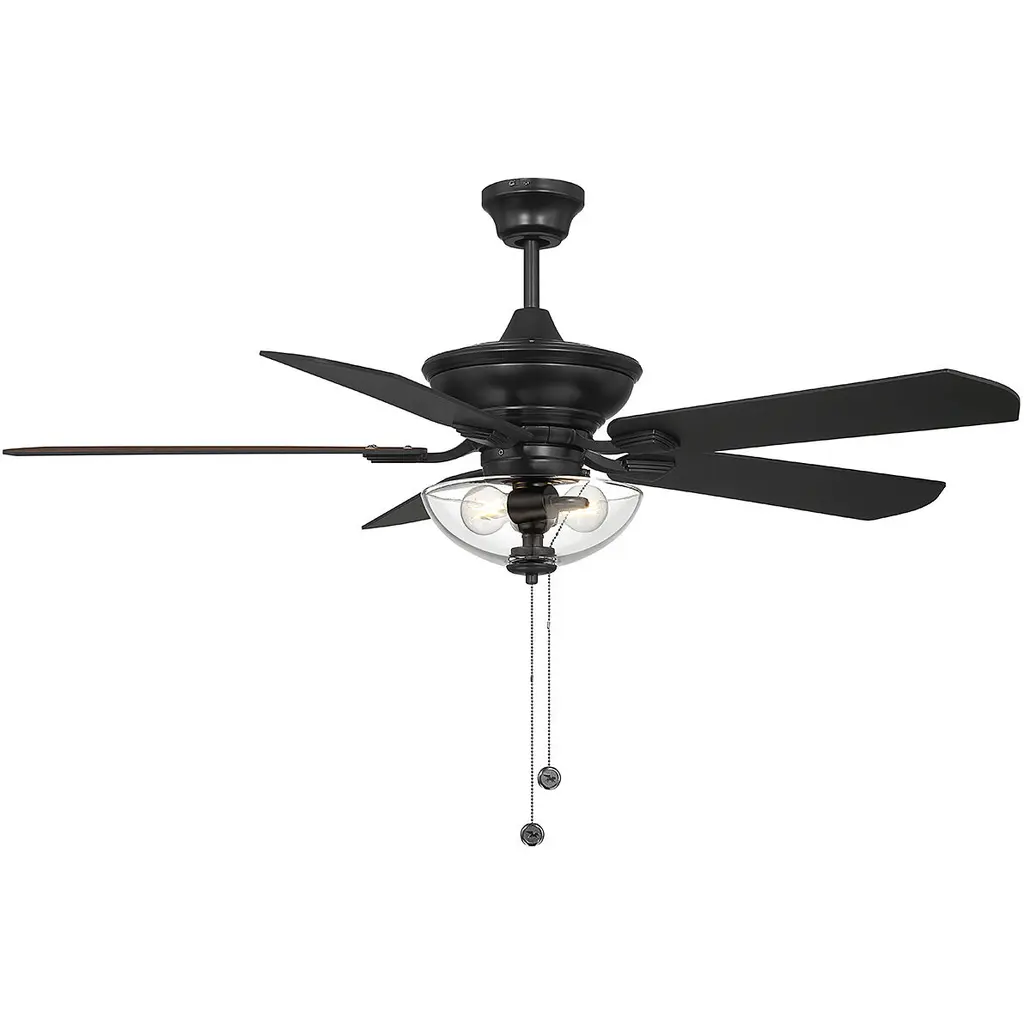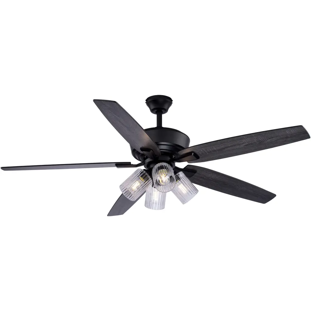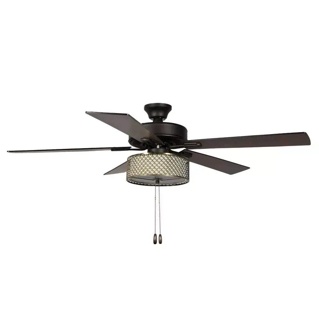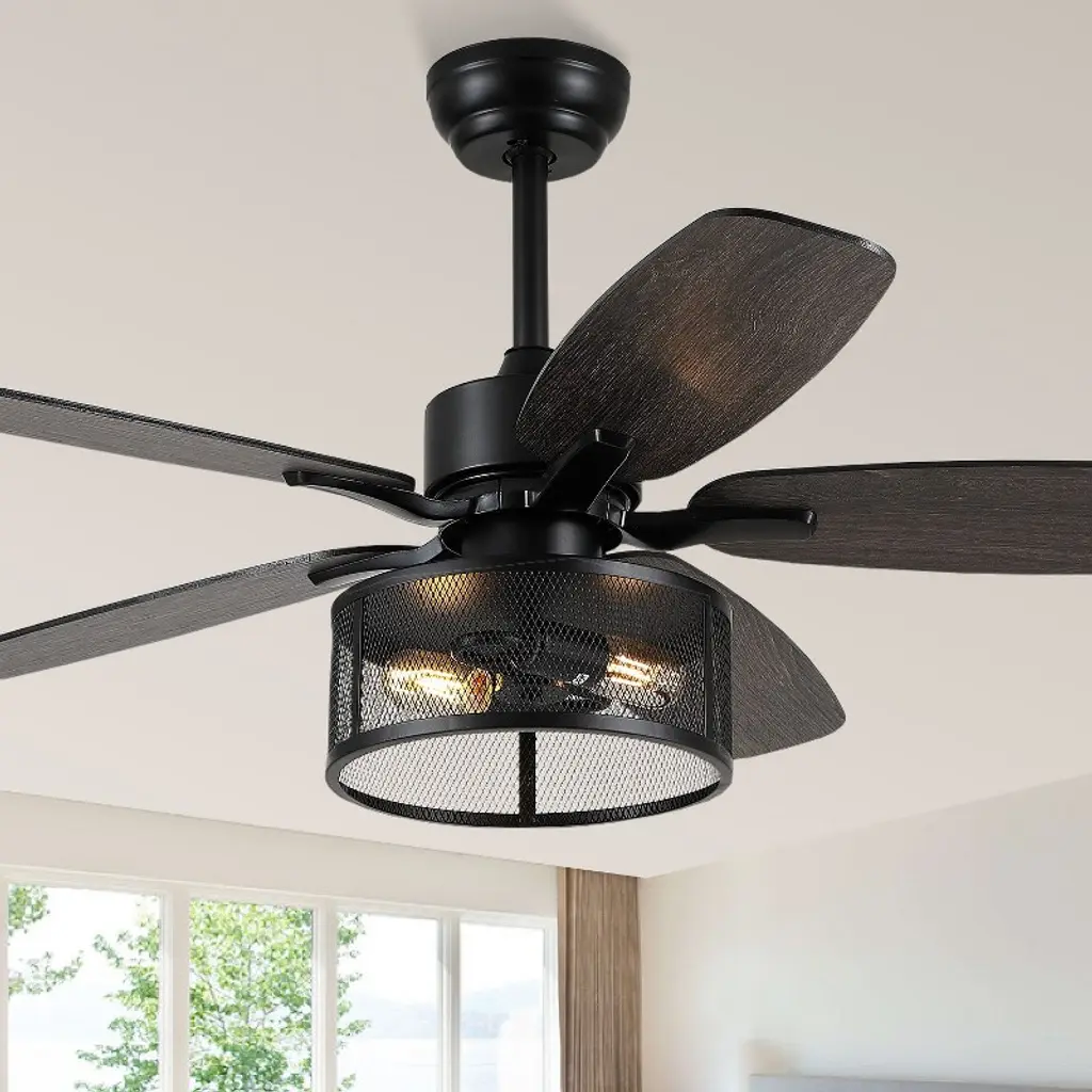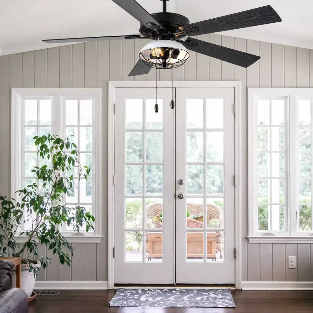 This 52-Inch 5-Blade LED Metal Lantern Lighting Ceiling Fan from River of Goods outfits your space in simply sleek style. Five blades and a 41-watt motor help circulate the air in a large room for a more comfortable environment, while the 12.25-inch pull chain makes it simple and convenient to operate. A white/black caged shade design surrounds the bulbs for an industrial look, bringing the simple yet modern aesthetic you love to your decor. The reversible fan blades offer different styling options with a black or soft gray color for an accommodating neutral, letting you choose the best shade for your space when you install the fan. This stylish structure is sure to make a wonderful addition in modern dining rooms and sleek living areas alike.