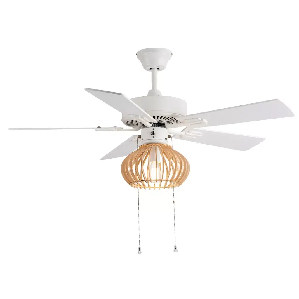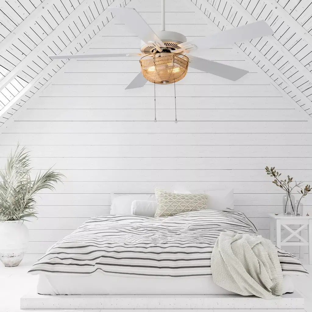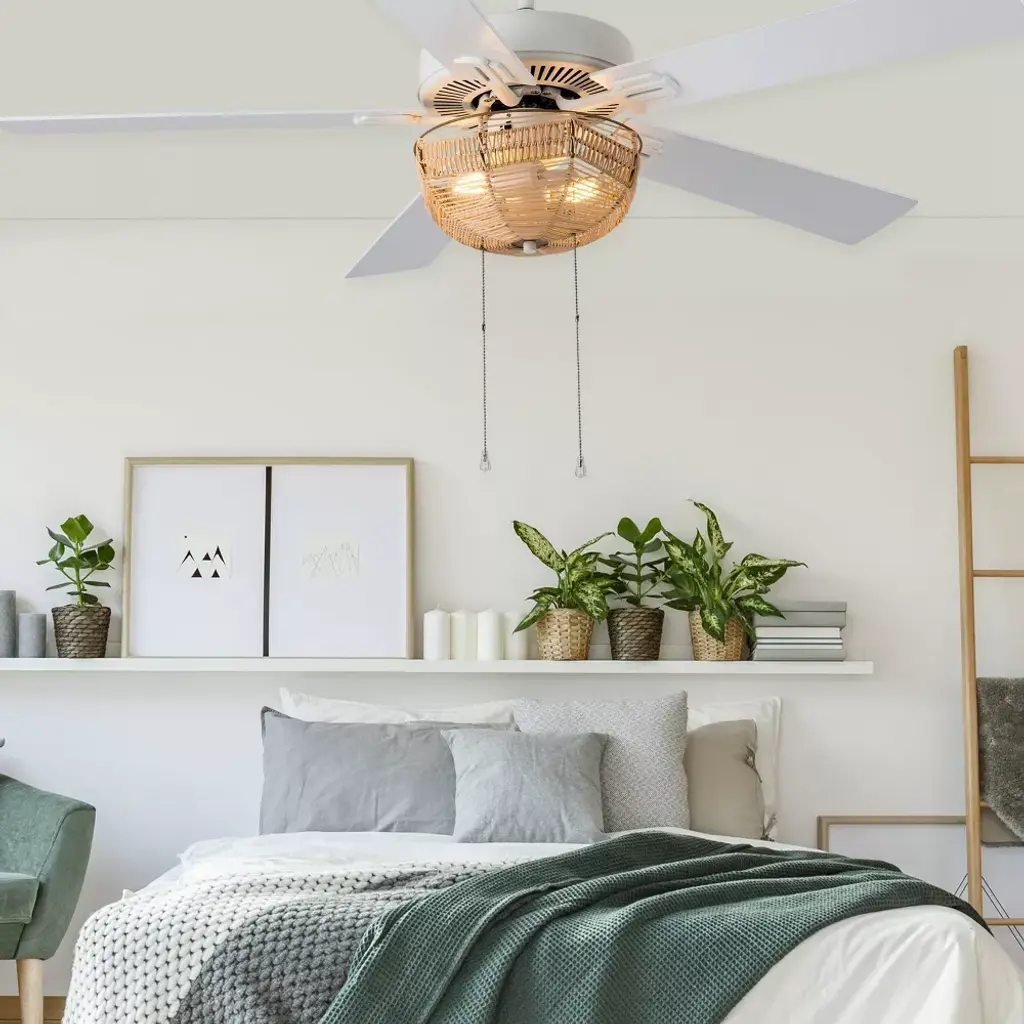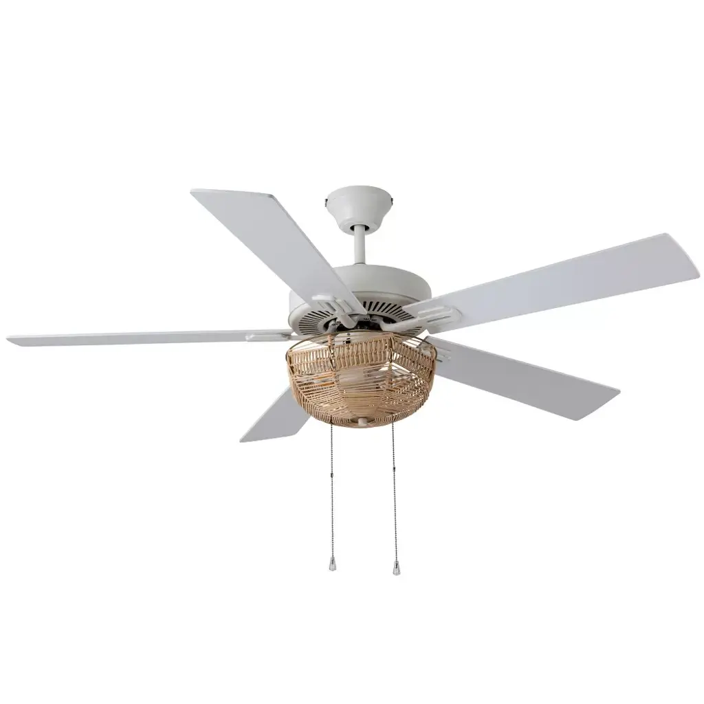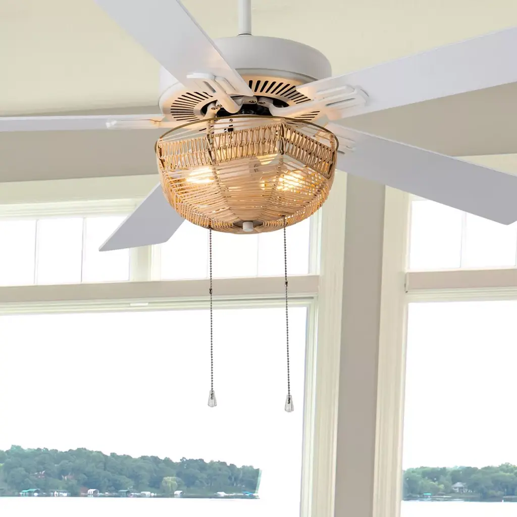 Take care of your space and your soul with the breezy, nautical style of the 52-Inch Tan Rattan Ceiling Fan from River of Goods. Five blades and a 41-watt motor help circulate the air in a large room for a more comfortable environment, while the 12.25-inch pull chain makes it simple and convenient to operate. Rattan material makes for a woven look around the bulbs, bringing the beachy feel you love along with white and cream hues. The reversible fan blades offer different styling options with light oak or white for an accommodating neutral, letting you choose the best shade for your space when you install the fan. From open living areas to airy guest bedrooms, this fan lets you revel in the light and carefree feel of coastal style.