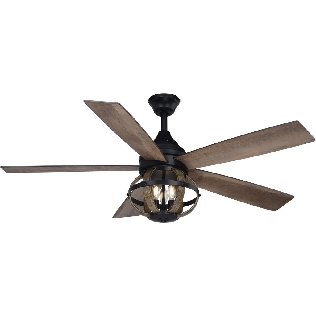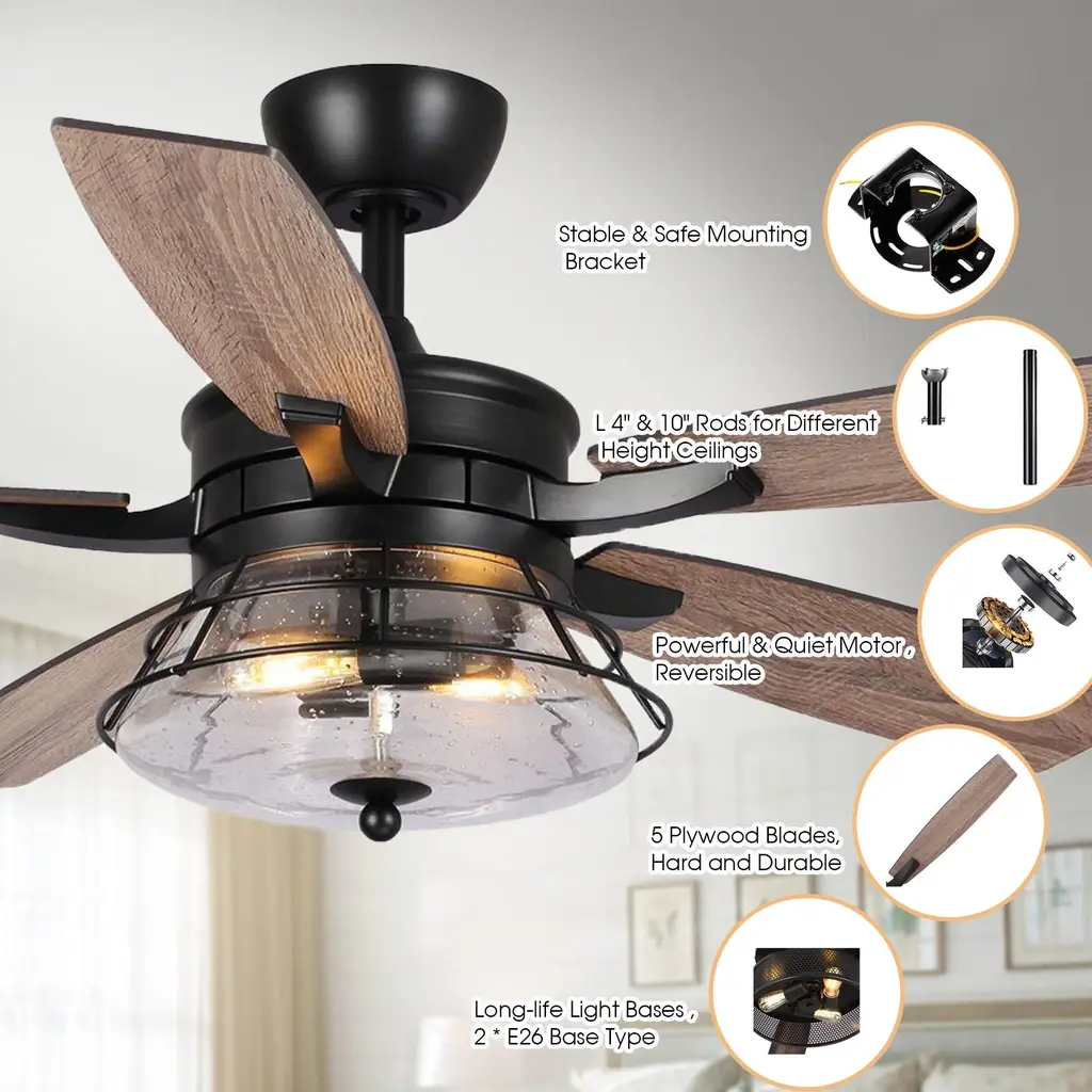 Gorgeous glasswork meets flawless vintage woodwork and ironwork in this 52-inch ceiling fan. Designed with aged iron and 5 reversible wood blades, featuring a weathered light brown distressed finish. Complemented by a rustic industrial light kit with clear glass shade, it is a farmhouse focal mood point for any living space.