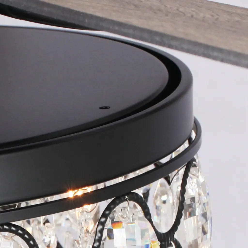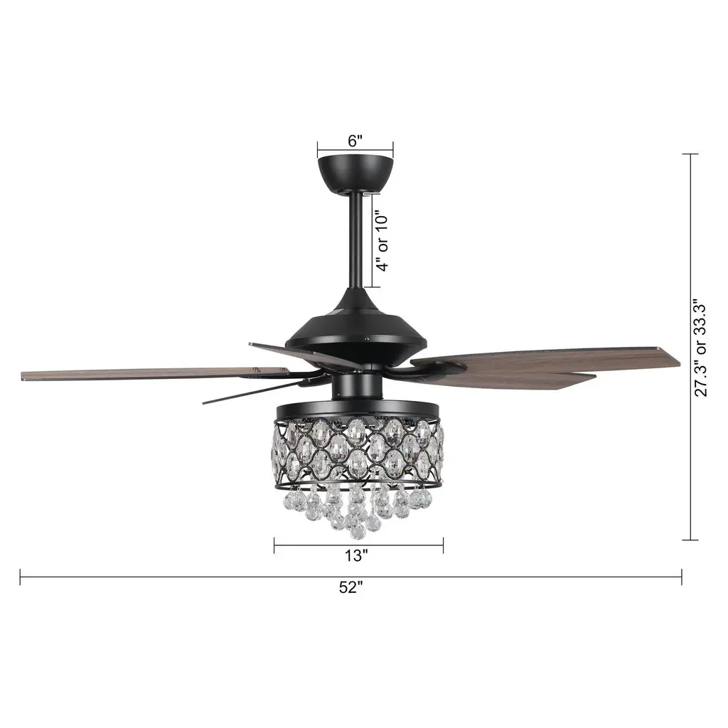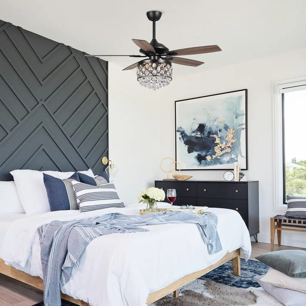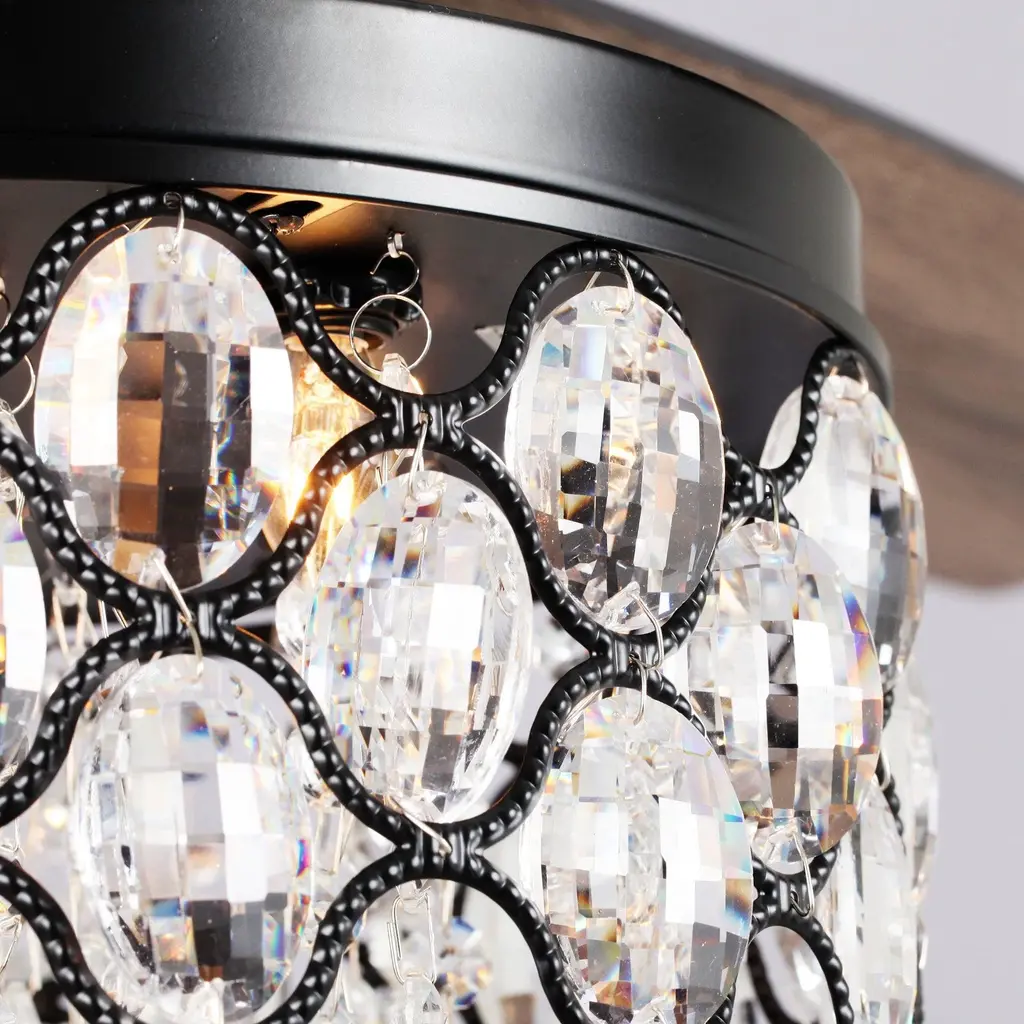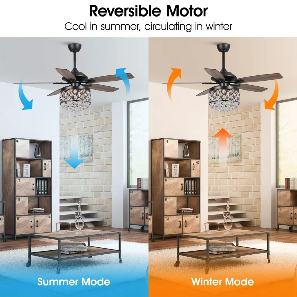 These Crystal ceiling fans with lights are the most cost-efficient option for bringing the temperature down and moving stale air out of your room. This lighted chandelier ceiling fan is the perfect solution for your cooling and lighting needs. A full crystal shade combines to fill your home with a grandeur rarely found in such a functional package. The matching wooden blades move an impressive amount of air. The 3-speed motor ensures you find the exact setting for your stimulating comfort.