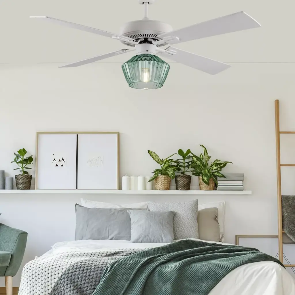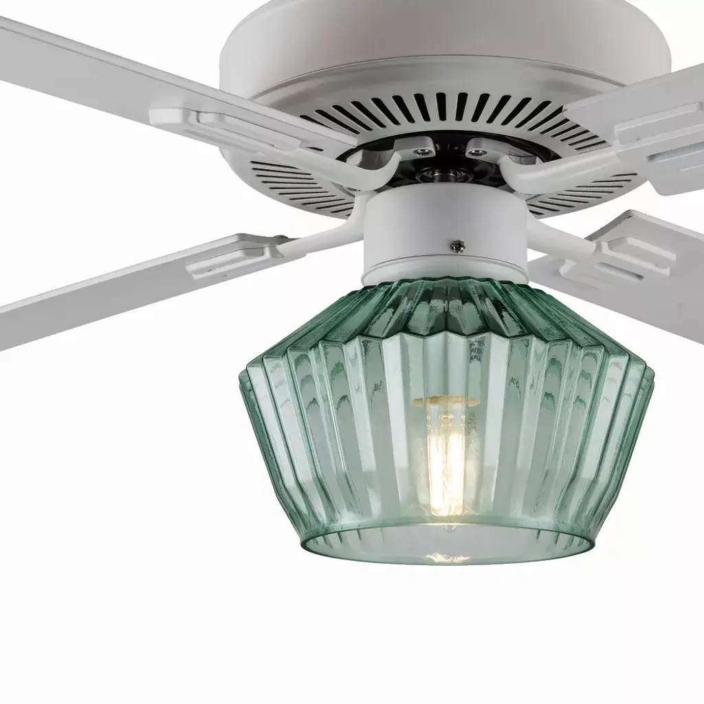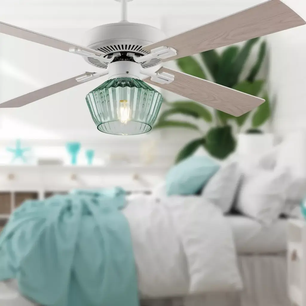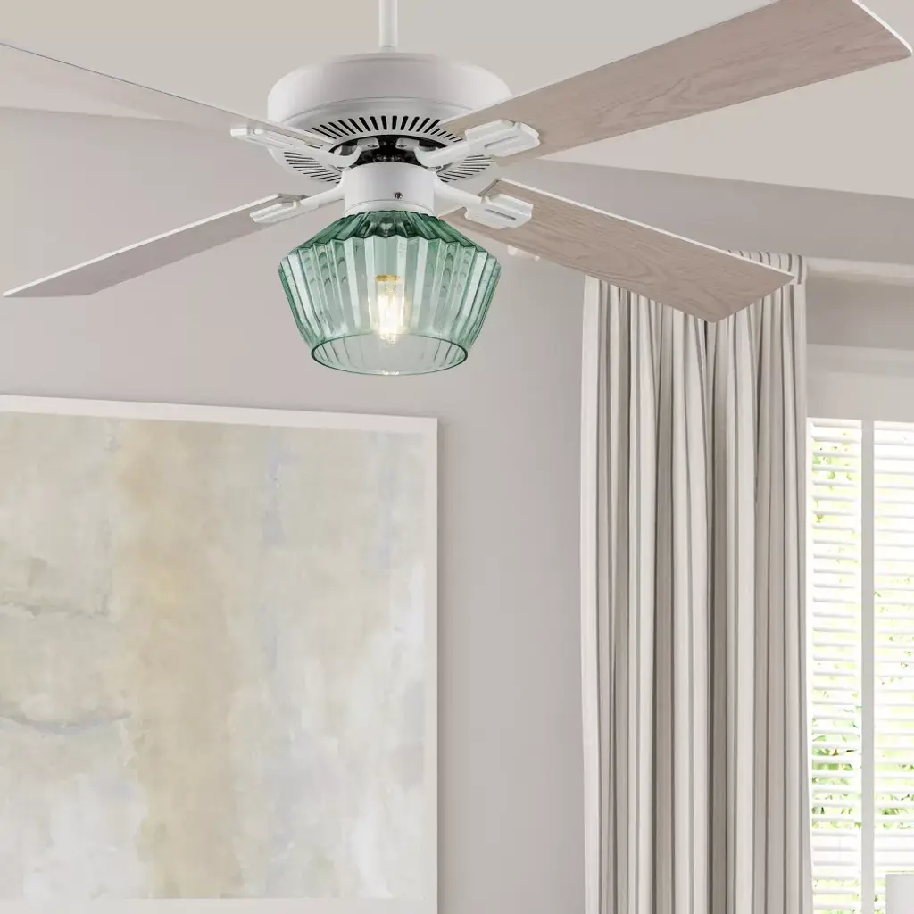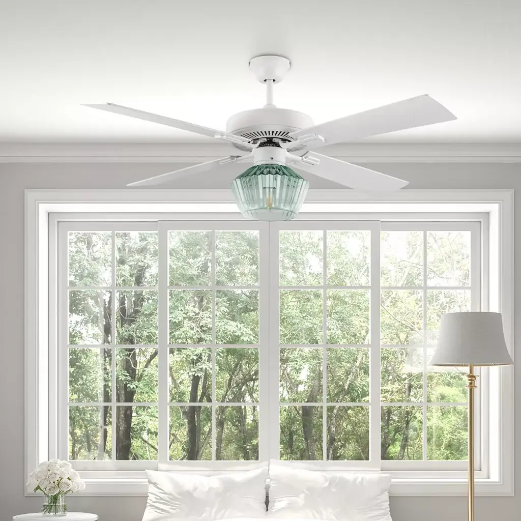 The 52-Inch Elisse White Painted Glass-Shade Ceiling Fan from River of Goods combines easy elegance with airflow reminiscent of a gentle ocean breeze — while also providing convenient overhead lighting. Featuring a beach-inspired aesthetic with four blades and a 1-light kit inside a faceted green glass shade, this casually sophisticated ceiling fan helps provide comfortable, efficient airflow in your living area with three speeds to accommodate climbing temperatures. One 8W E26 light bulb (included) provides ambiance above your coffee table or dining area through the green faceted glass shade. Its versatile design can be installed flush mount to your ceiling, or using the included six-inch downrod to give you multiple options to best suit your space.