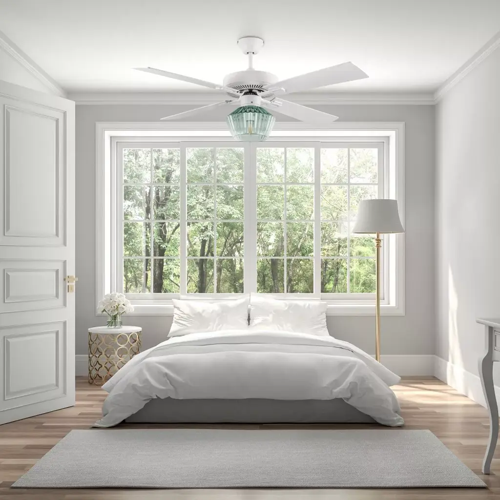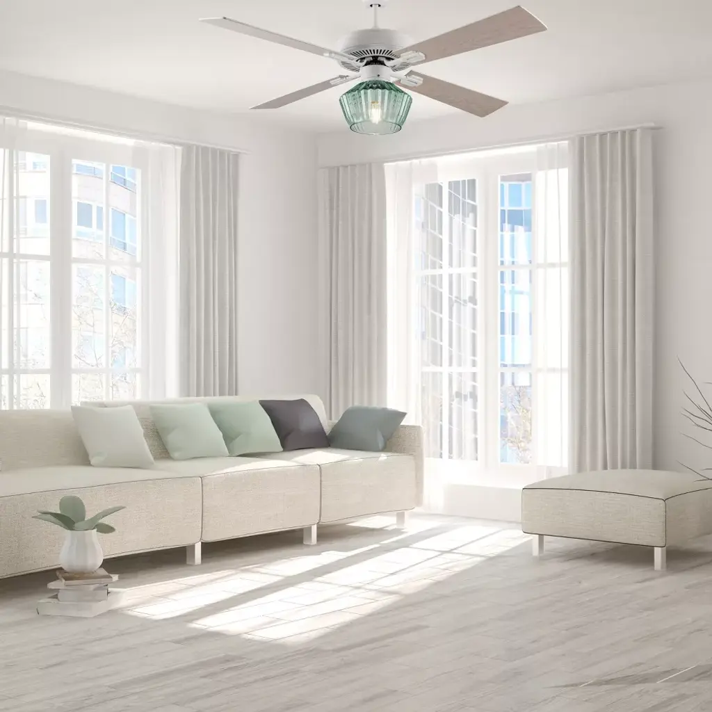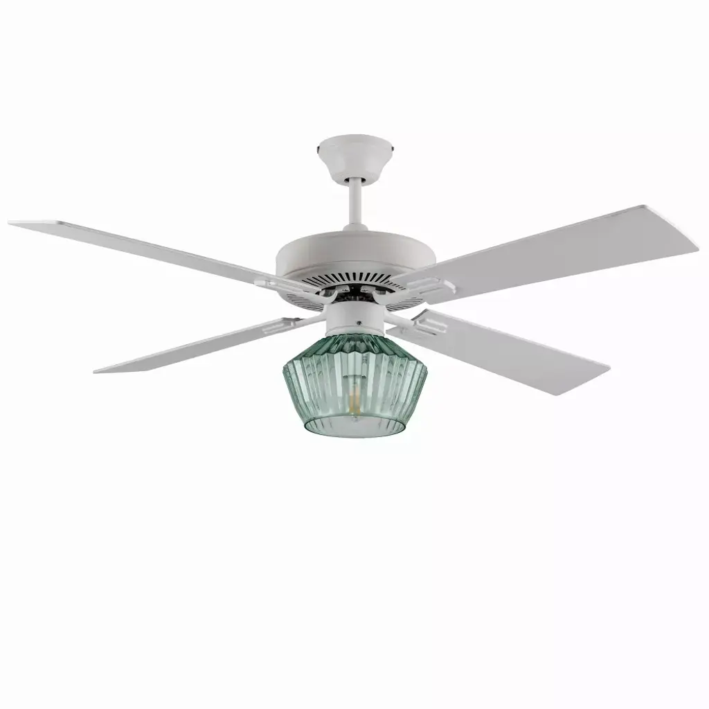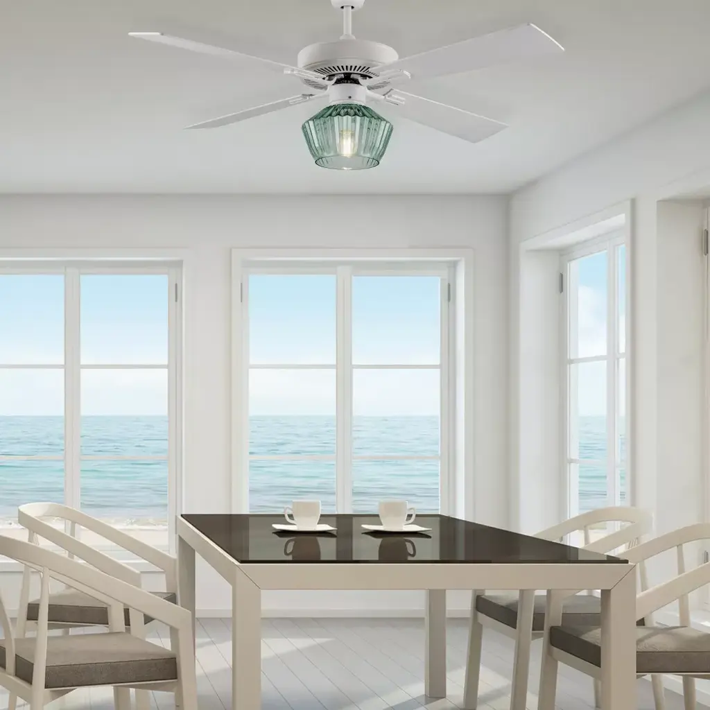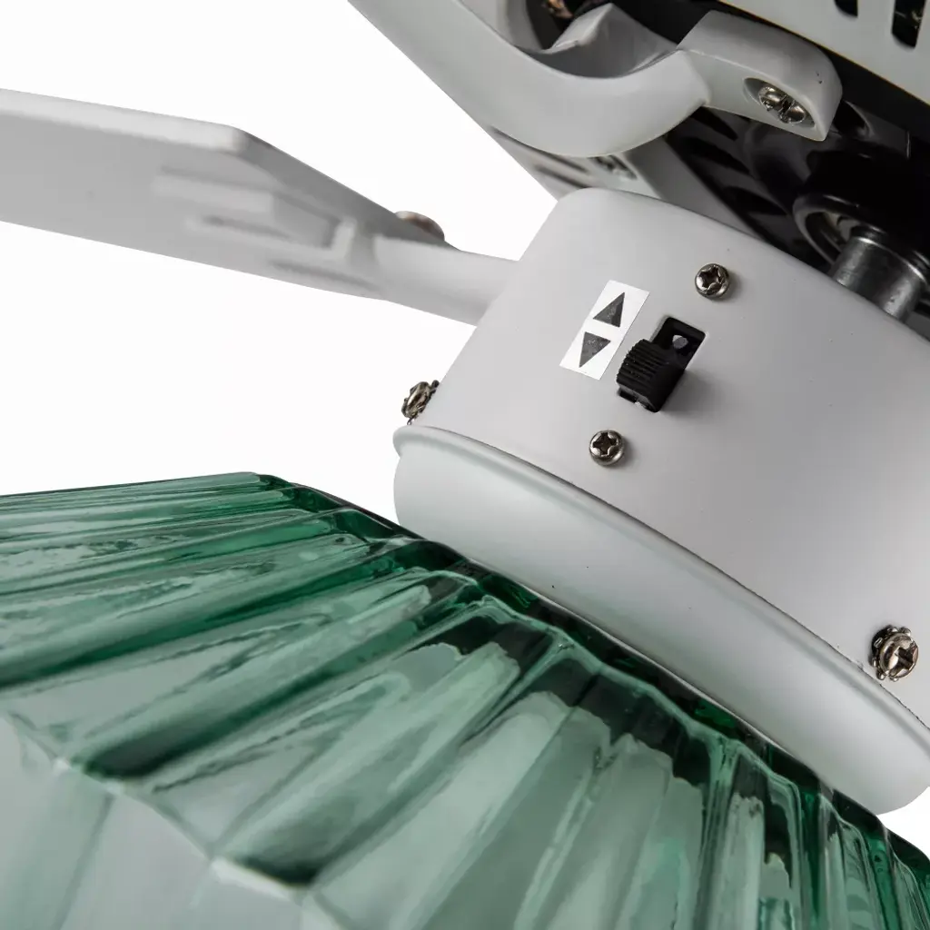The 52-Inch Elisse White Painted Glass-Shade Ceiling Fan from River of Goods combines easy elegance with airflow reminiscent of a gentle ocean breeze — while also providing convenient overhead lighting. Featuring a beach-inspired aesthetic with four blades and a 1-light kit inside a faceted green glass shade, this casually sophisticated ceiling fan helps provide comfortable, efficient airflow in your living area with three speeds to accommodate climbing temperatures. One 8W E26 light bulb (included) provides ambiance above your coffee table or dining area through the green faceted glass shade. Its versatile design can be installed flush mount to your ceiling, or using the included six-inch downrod to give you multiple options to best suit your space.