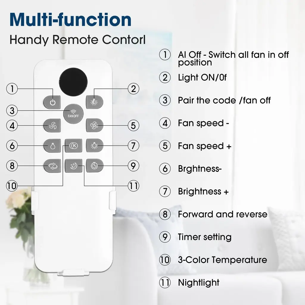 This 52-inch DC Motor Industrial Downrod Ceiling Fan with LED Light is a perfect blend of style and functionality. 【Powerful Performance】: Equipped with a high-powered DC motor, this 52-inch industrial ceiling fan ensures efficient air circulation in large spaces.【Integrated LED Light】: Features an energy-efficient LED light that provides bright illumination, with adjustable color temperature to suit your needs.【Downrod Mount System】: The fan comes with a downrod mount system that ensures stability and balance, making it ideal for industrial settings.【Multi-Speed Remote Control】: Comes with a convenient remote control that allows you to easily adjust the fan speed and light intensity.【Stylish and Durable】: Its sleek industrial design adds a modern touch to any space, while its robust construction ensures long-lasting performance.