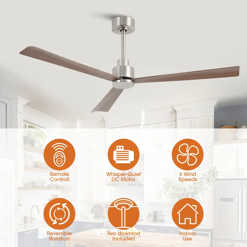 52-inch DC fan: whisper-quiet, remote-cooled comfort. 【52-inch large air volume design】: Three-blade 52-inch ceiling fan, 5800 CFM strong air volume, suitable for large rooms (about 350 square feet).【DC motor energy-saving and silent】: 40W DC motor, quiet operation and efficient power saving.【Modern three-blade simple style】: Modern style design, optional brown/white/nickel color, reversible ABS wood grain blades.【Convenient remote control operation】: Standard remote control, easy to adjust the wind speed (6 gears) and switch.【Complete accessories for easy installation】: Includes two lower hanging rods of 5 inches and 10 inches, suitable for different floor heights, ETL certified safe and reliable.