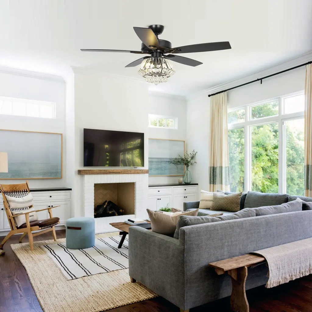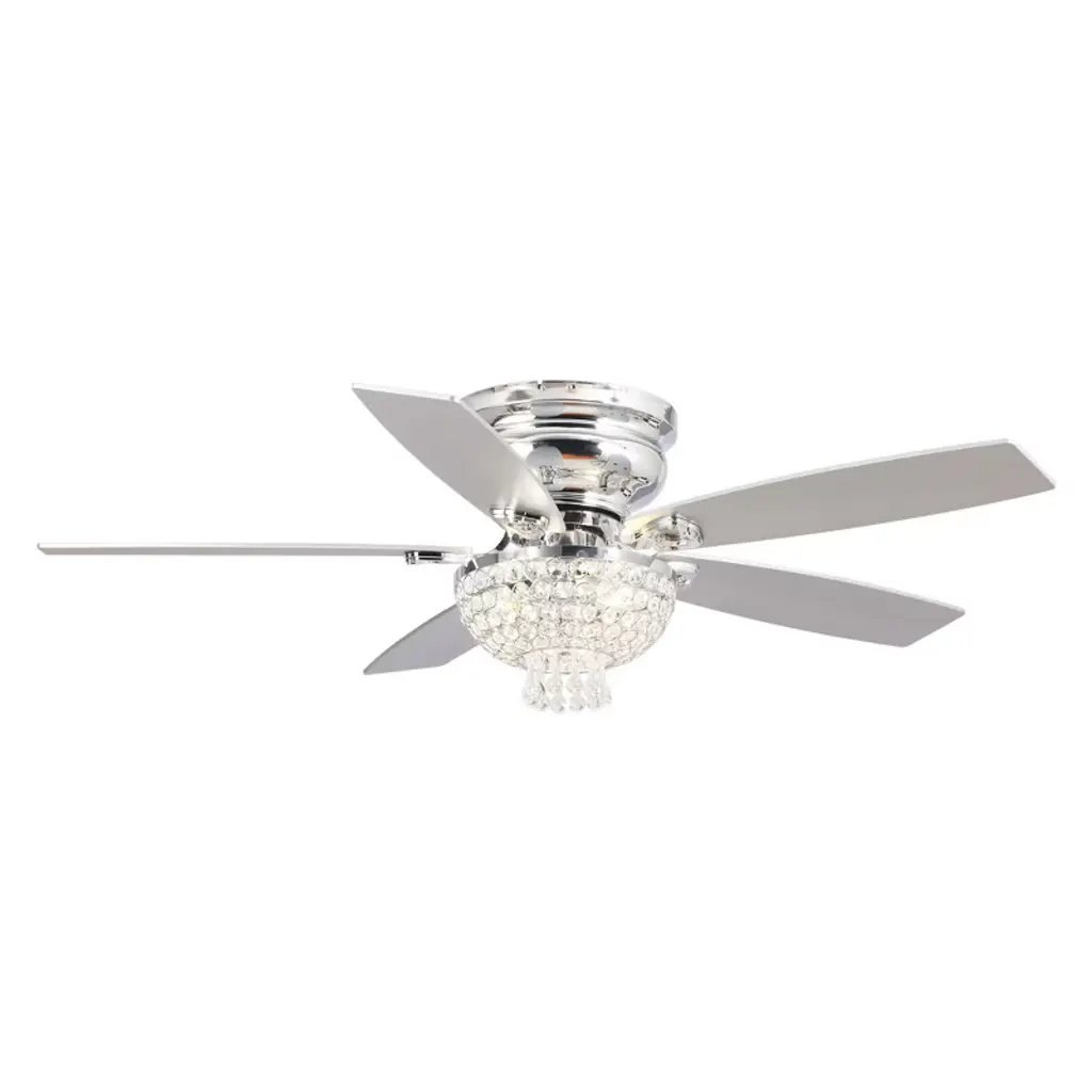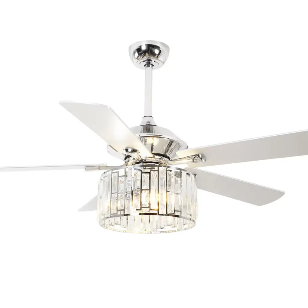 These crystal chandelier ceiling fans with lights are the most cost-efficient option for bringing the temperature down and moving stale air out of your room. This lighted chandelier ceiling fan is the perfect solution for your cooling and lighting needs. A full crystal shade combines to fill your home with a grandeur rarely found in such a functional package. The matching silver-stained wooden blades move an impressive amount of air. The 3-speed motor ensures you find the exact setting for your stimulating comfort.
