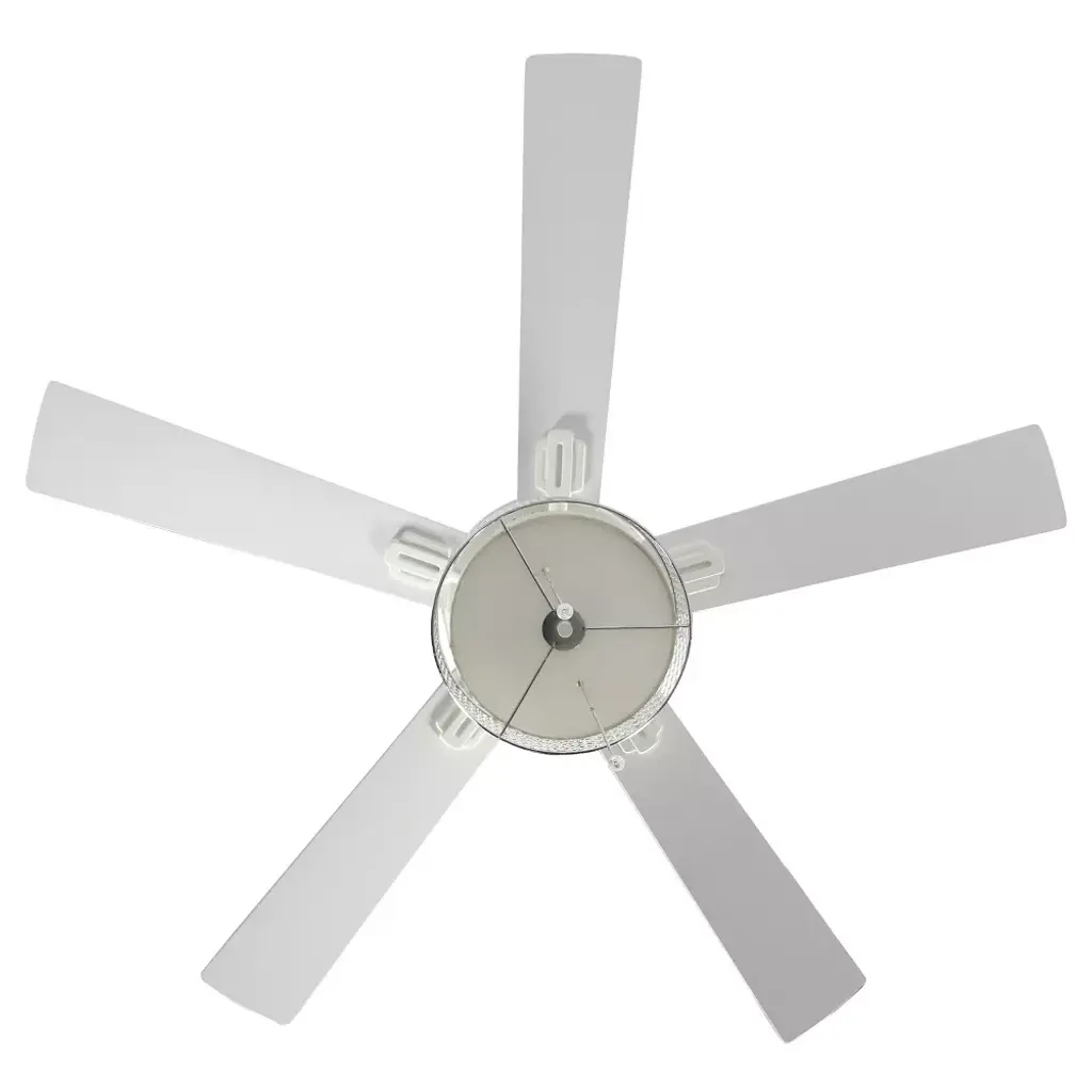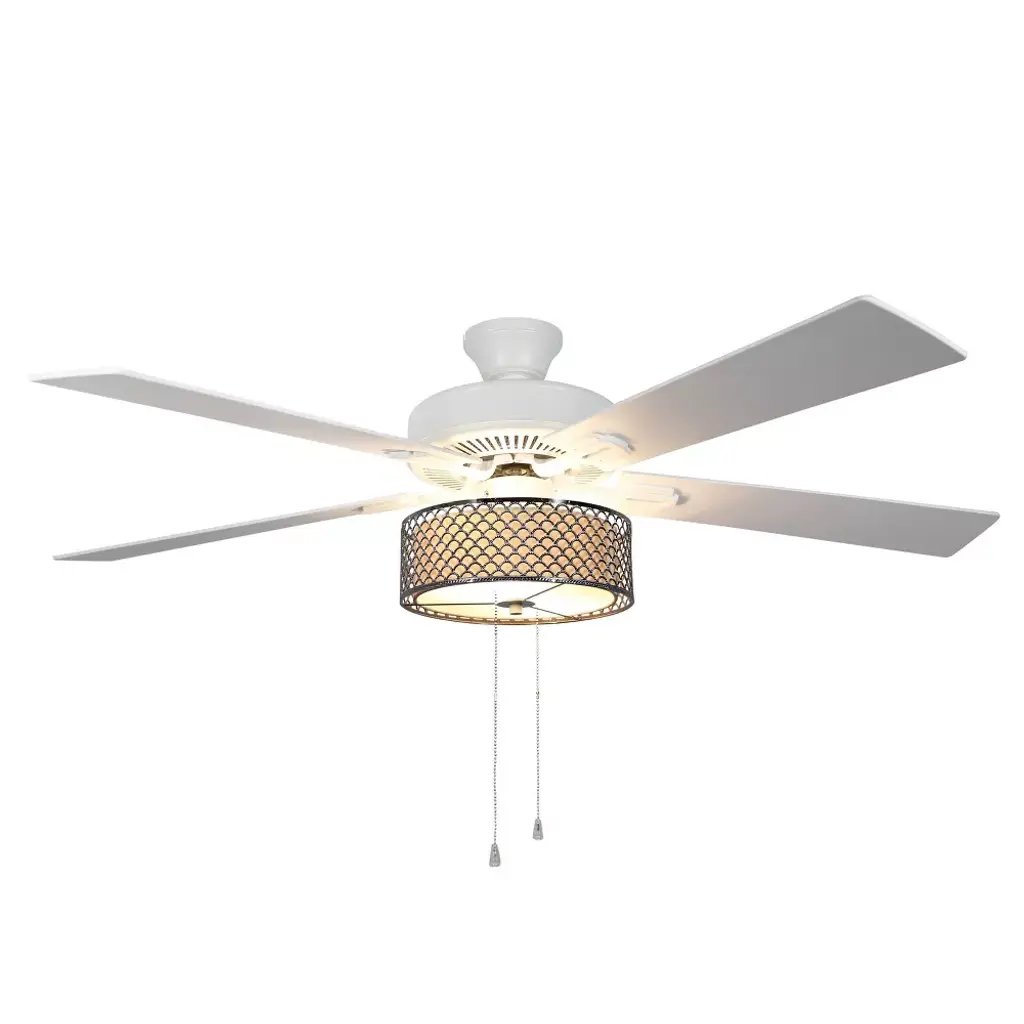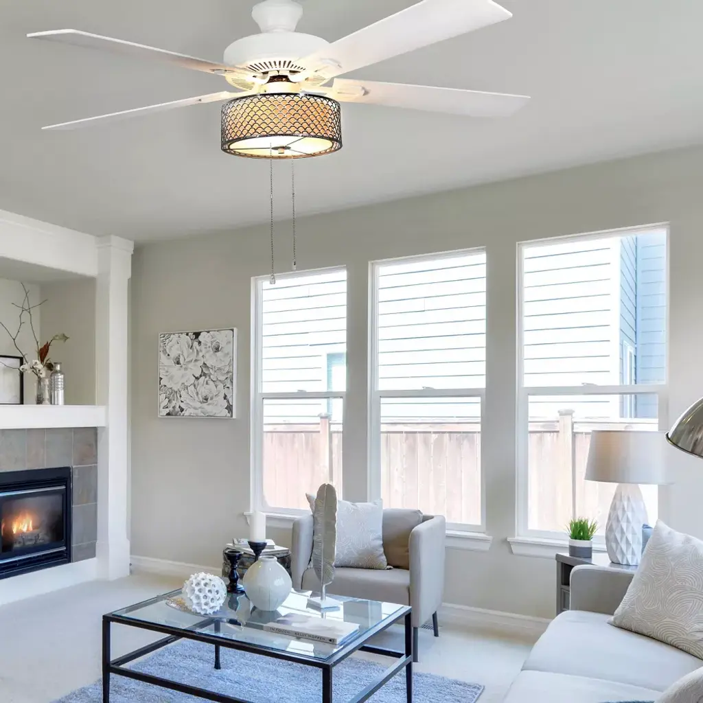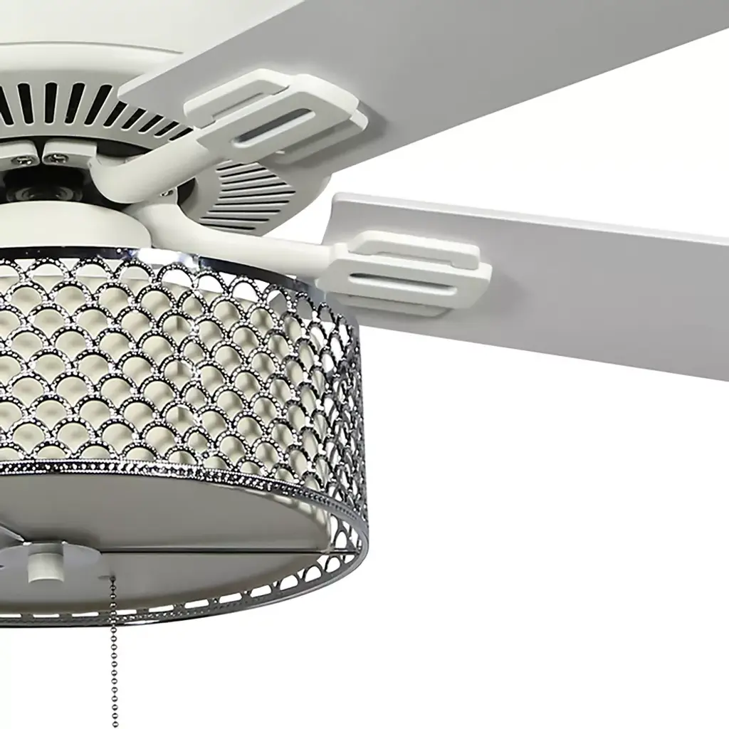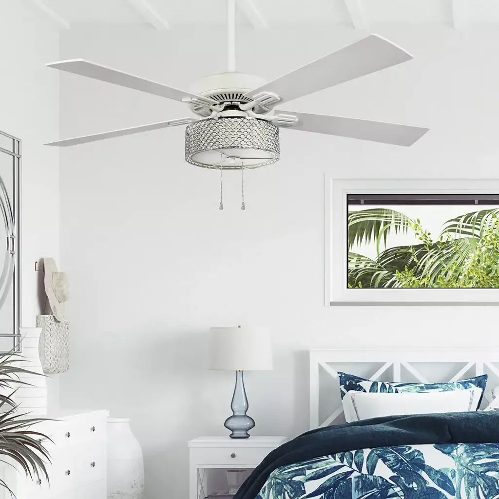 From modern decor styles to more traditional aesthetics, it's easy to bring a touch of luxury and plenty of illumination to your space with the 52"W Chromed Wave 5-Blade LED Ceiling Fan from River of Goods. Perfect for placing in the entryway, living room, bedroom or dining room, this metal ceiling fan offers a transitional coastal feel with its chrome scallop metal exterior and cream fabric interior shade. The blades give you the choice of displaying a white or oak finish for easy coordination with your existing decor, and are controlled with a metal pull chain to manually turn on and off, as well as change both light strength and the three blade speeds using the reversible motor. The scallop metal ceiling fan has an energy-efficient design that lets you circulate cool air or heat year-round for maximum airflow and comfort. Two dimmable E26 LED 8W/40W incandescent equivalent warm white light bulbs are included for added convenience to immediately illuminate a room when installed. This item must be hardwired and installed by a qualified electrician.