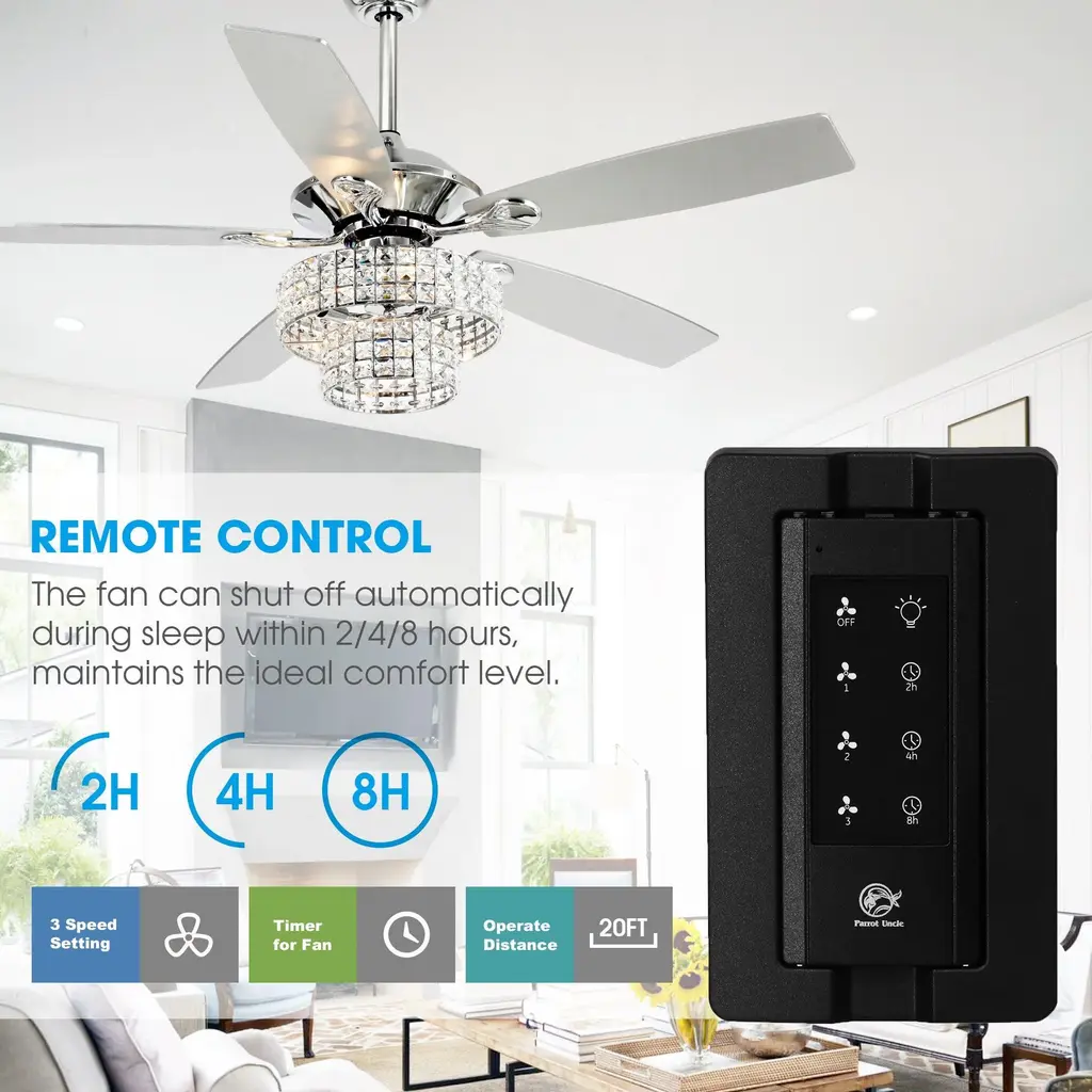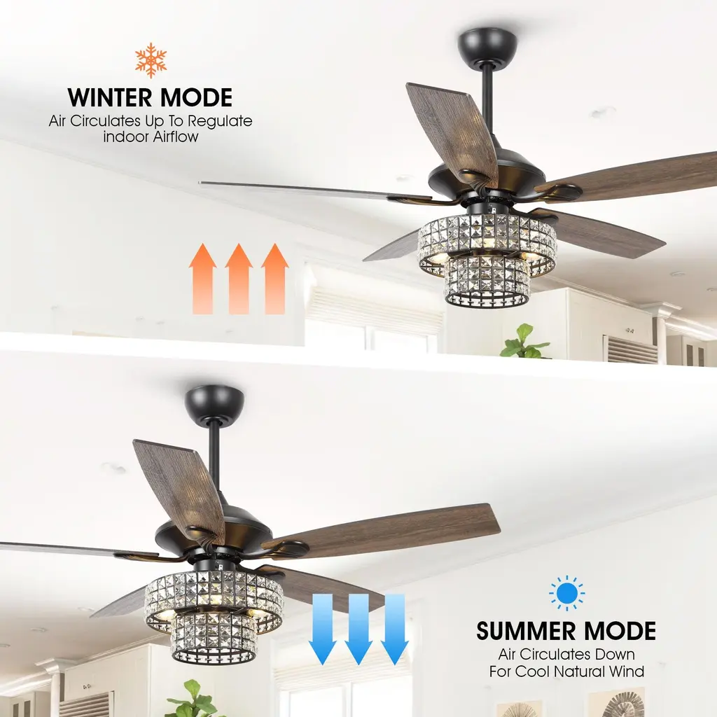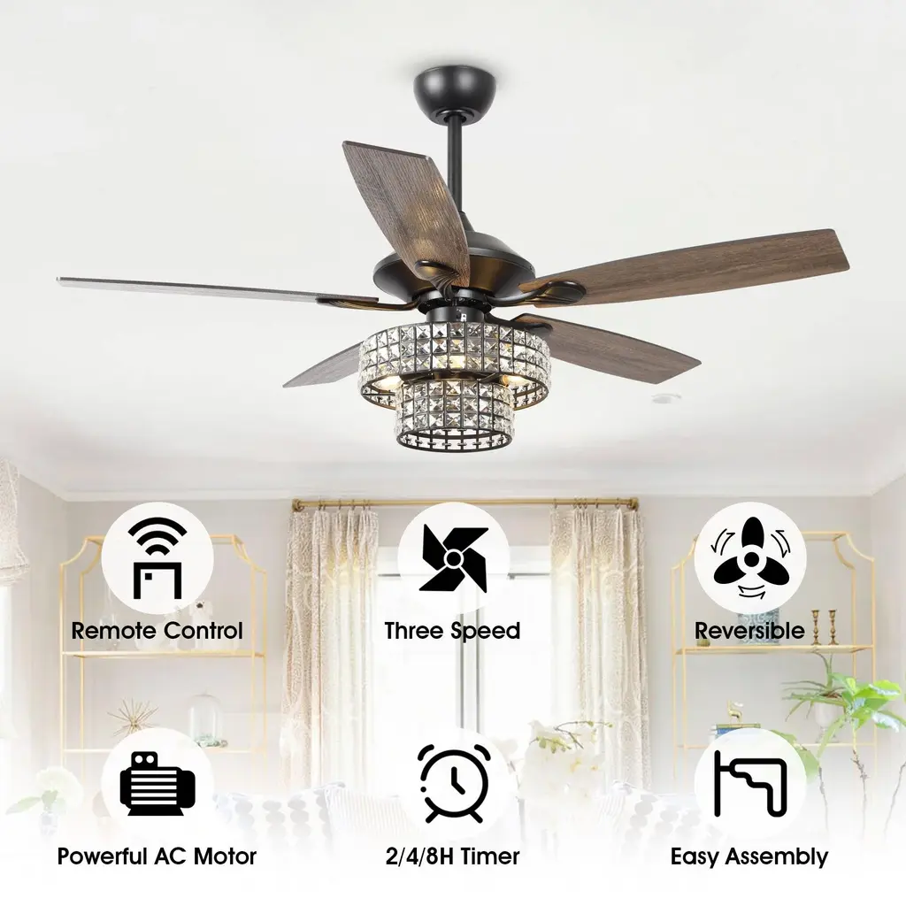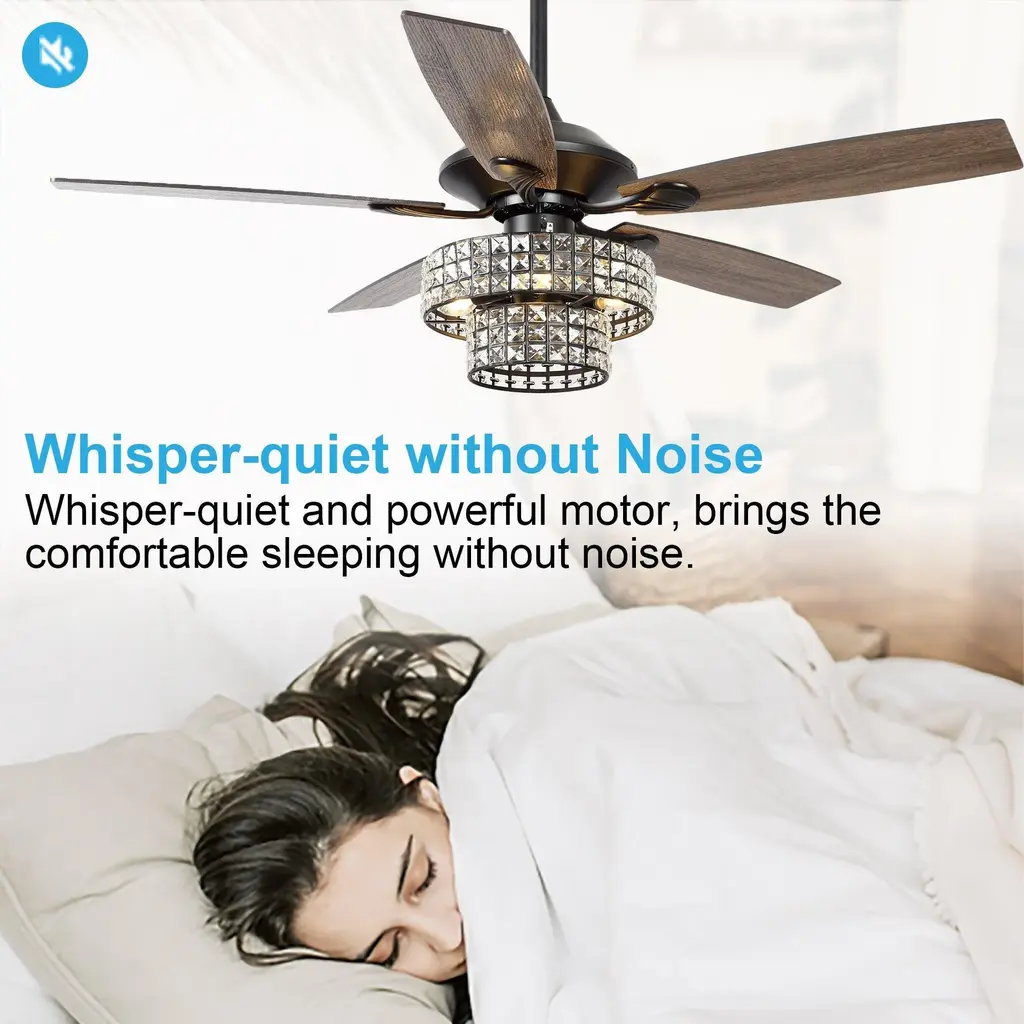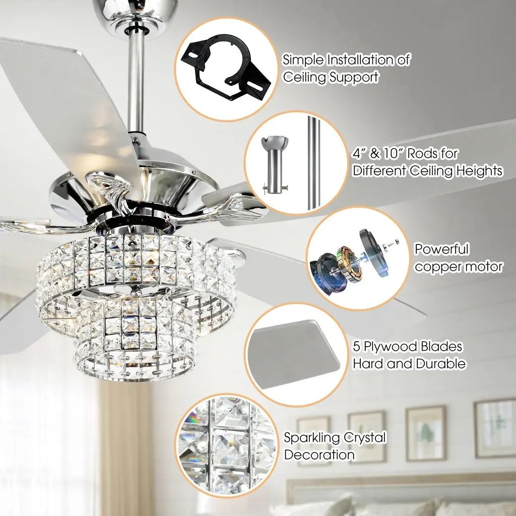 Beautiful crystal chandelier ceiling fan with lights work with high-quality mechanical elements coalesces into an elegant lighted ceiling fan. The shade is two-tiered with crystal-embedded stamped metal walls. The richly traditional design is meant to complement any luxurious space.