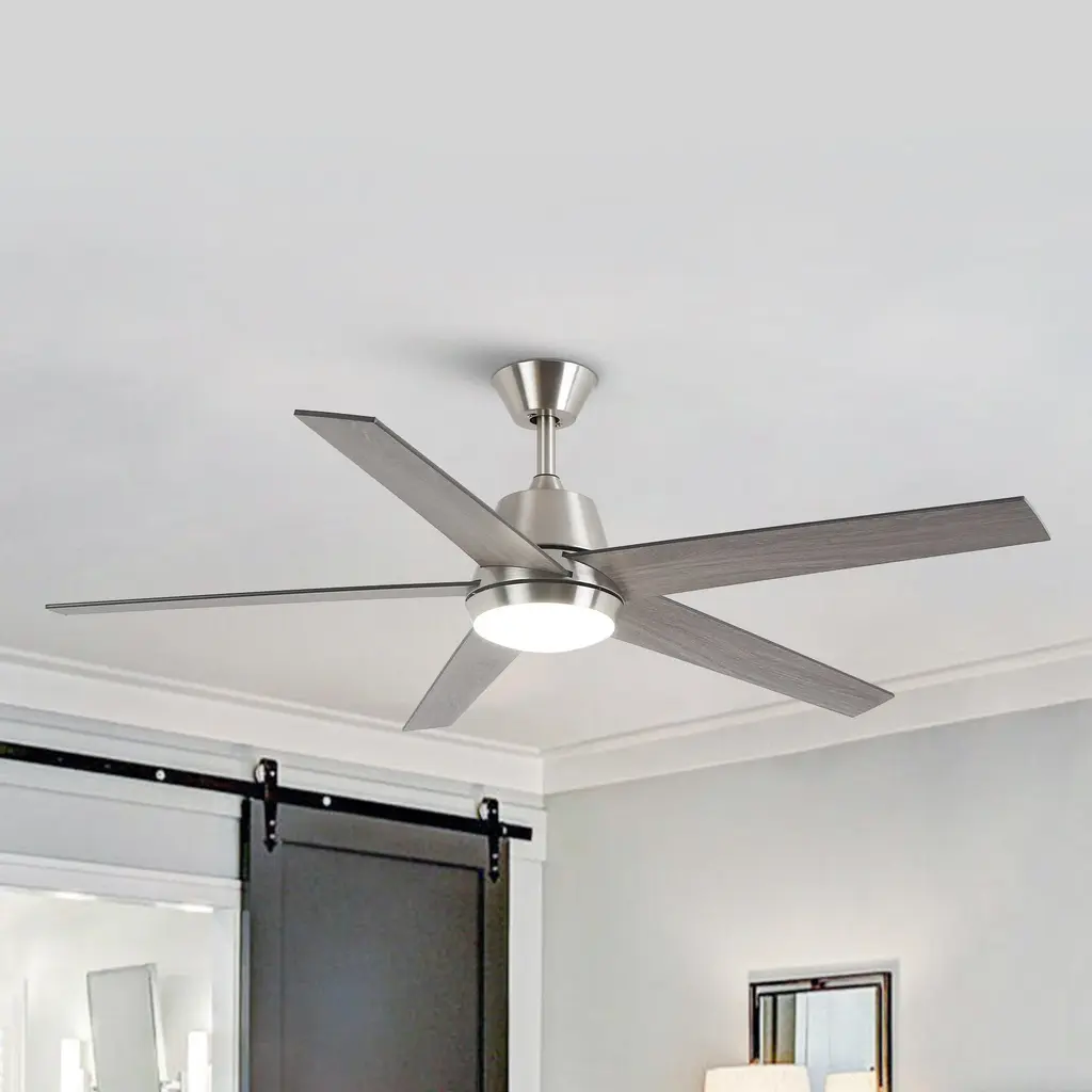 Enhance your home's aesthetic with this sleek 52" LED ceiling fan. Its modern design features a stylish black/brushed nickel/white finish that beautifully complements the minimalist LED lights. The energy-efficient LED module not only offers ambient lighting but also promotes sustainability. With a reversible motor that adjusts to six speeds, you can customize your comfort level with ease. The added convenience of a remote control allows you to effortlessly adjust both the fan speed and light intensity. Furthermore, this ceiling fan also showcases a timer function, adding to its functionality and appeal.