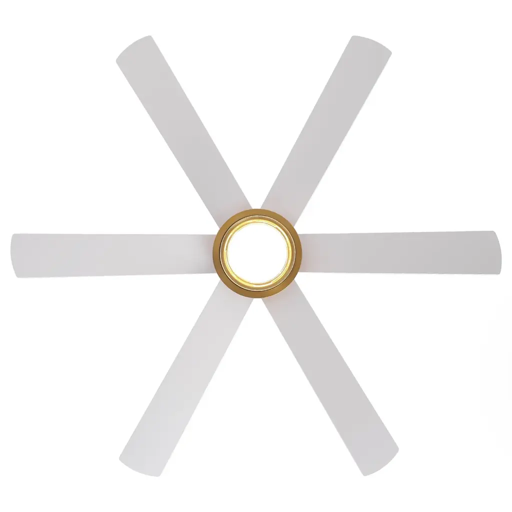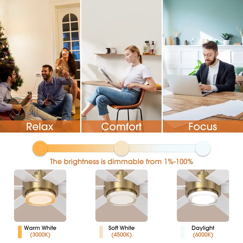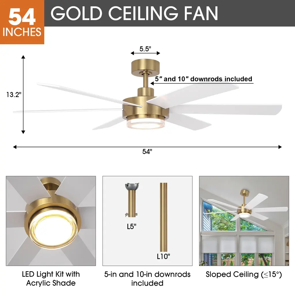 Experience powerful airflow and modern elegance with this 54-inch ceiling fan featuring integrated dimmable LED lighting and convenient remote control.【Large air volume and wide coverage】: 54-inch 6-blade fan, 7760CFM strong wind, suitable for 350sqft large space.【Three-color temperature LED light】: Integrated 22W LED light, 2200 lumens brightness, 3000K/4500K/6000K color temperature adjustable.【Silent energy-saving DC motor】: DC motor, 35dB low noise operation, 210CFM/W high efficiency energy saving.【Multi-function remote control】: Standard remote control, adjust wind speed/light (switch/brightness/color temperature), support timing + memory.【Modern design and easy installation】: Streamlined gold body, prominent light design, white wood grain fan blades, with 5" & 10" downrods.
