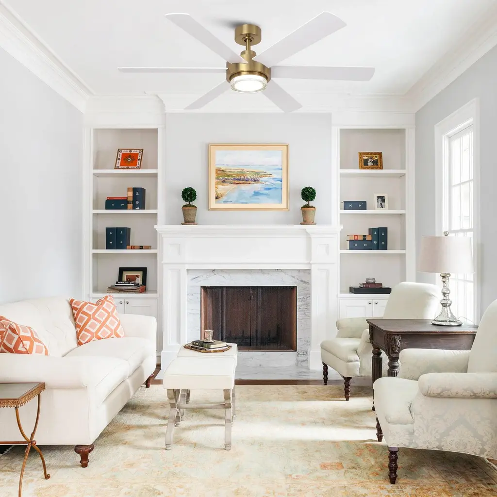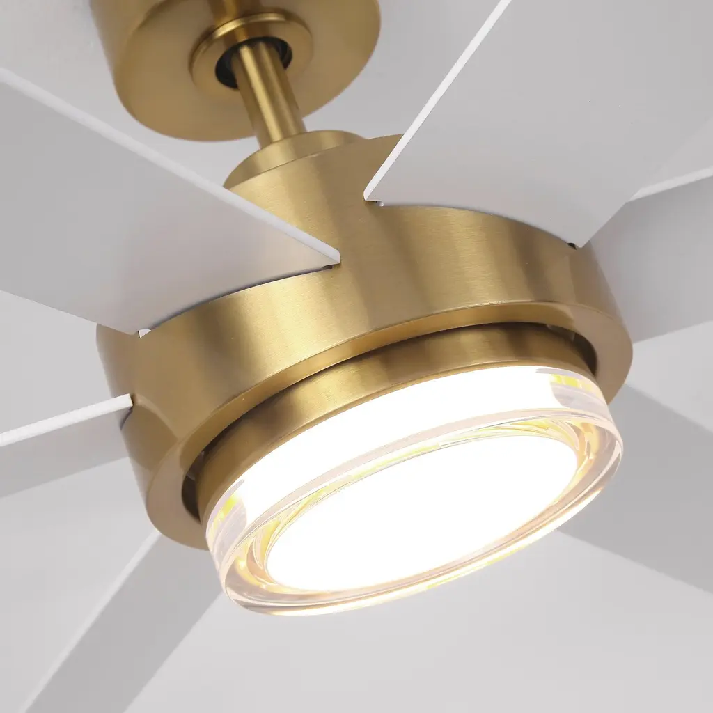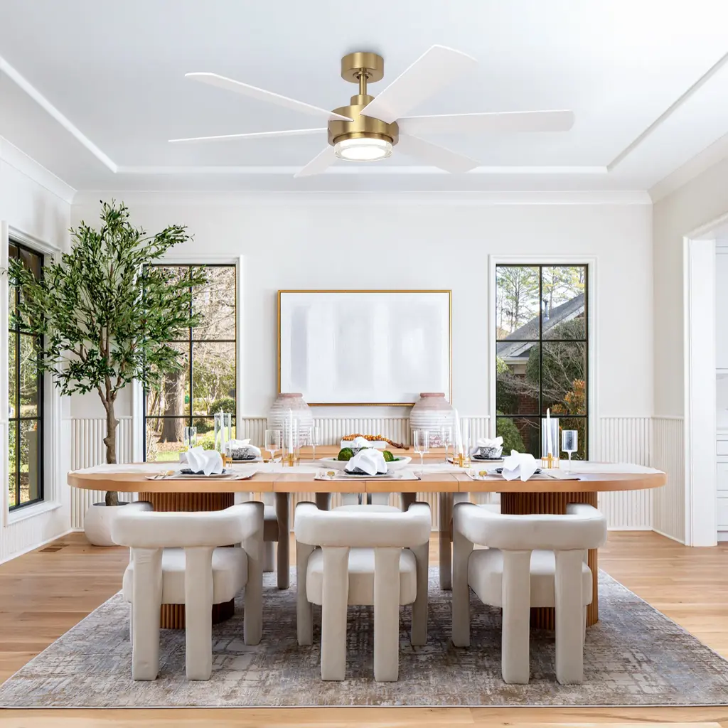 Experience powerful airflow and modern elegance with this 54-inch ceiling fan featuring integrated dimmable LED lighting and convenient remote control.【Large air volume and wide coverage】: 54-inch 6-blade fan, 7760CFM strong wind, suitable for 350sqft large space.【Three-color temperature LED light】: Integrated 22W LED light, 2200 lumens brightness, 3000K/4500K/6000K color temperature adjustable.【Silent energy-saving DC motor】: DC motor, 35dB low noise operation, 210CFM/W high efficiency energy saving.【Multi-function remote control】: Standard remote control, adjust wind speed/light (switch/brightness/color temperature), support timing + memory.【Modern design and easy installation】: Streamlined gold body, prominent light design, white wood grain fan blades, with 5" & 10" downrods.