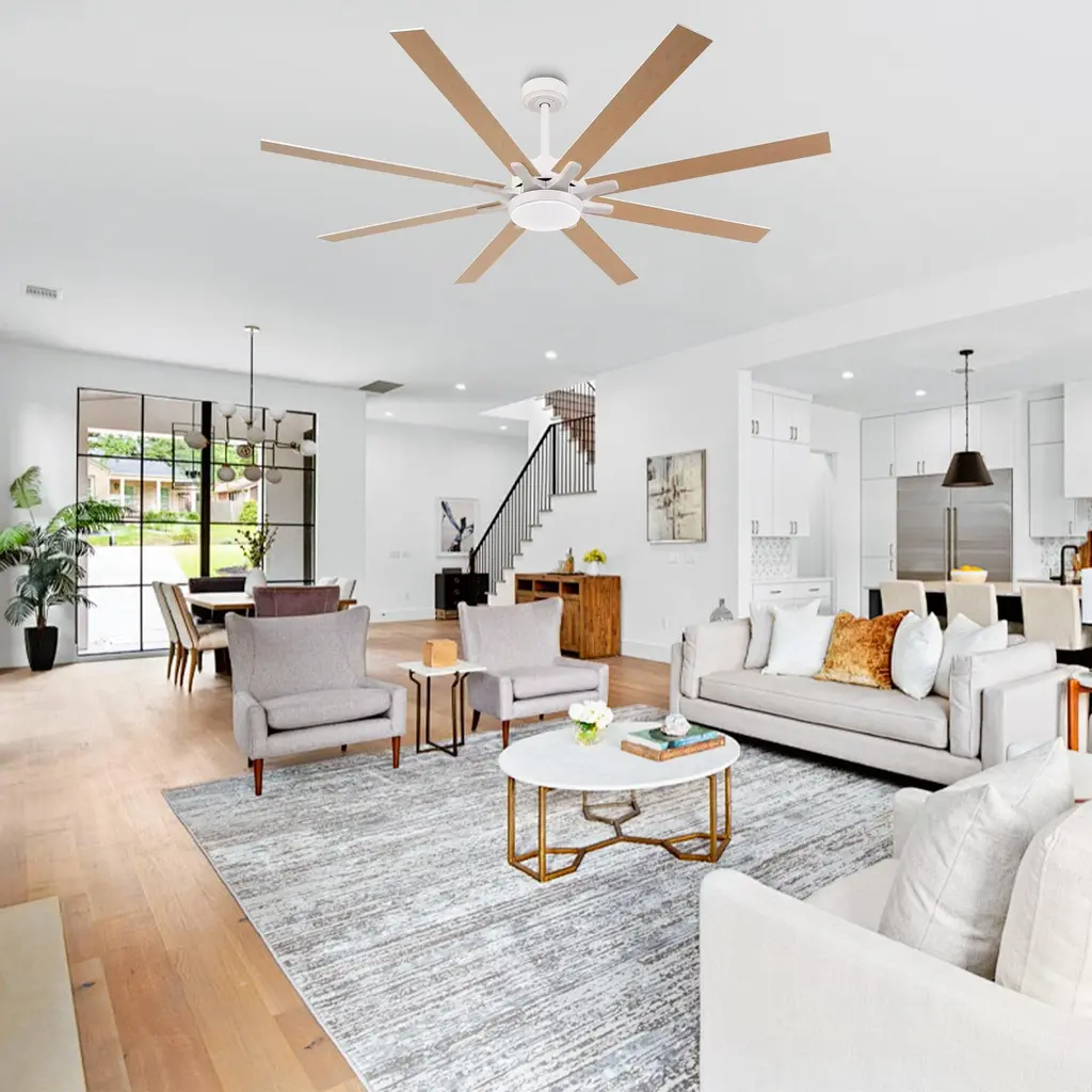 The 65-inch double-sided ceiling fan creates an efficient and comfortable experience for large homes.【Double-sided blade design】: The reversible blades are available in black/smoked and white/woodgrain colors, easily adapting to modern home styles and meeting diverse decoration needs.【Powerful and large air volume】: The 65-inch super-large fan blades are equipped with a DC motor, with a strong airflow of 4840CFM, efficiently covering a large space of 350+ square feet.【Smart remote control + three-color LED lights】: Remotely adjust 6 wind speeds and timing functions, integrated 24W LED lights, and support free switching of 3000 K- 5000 K color temperature.【Energy-saving and silent】: The 38W DC motor combines low energy consumption with a high speed of 140RPM, low noise and power saving.【Quality assurance】: ETL safety certification, iron/aluminum alloy structure is stable and durable, including 4/10-inch double suspension rods, and provides a 1-year warranty.